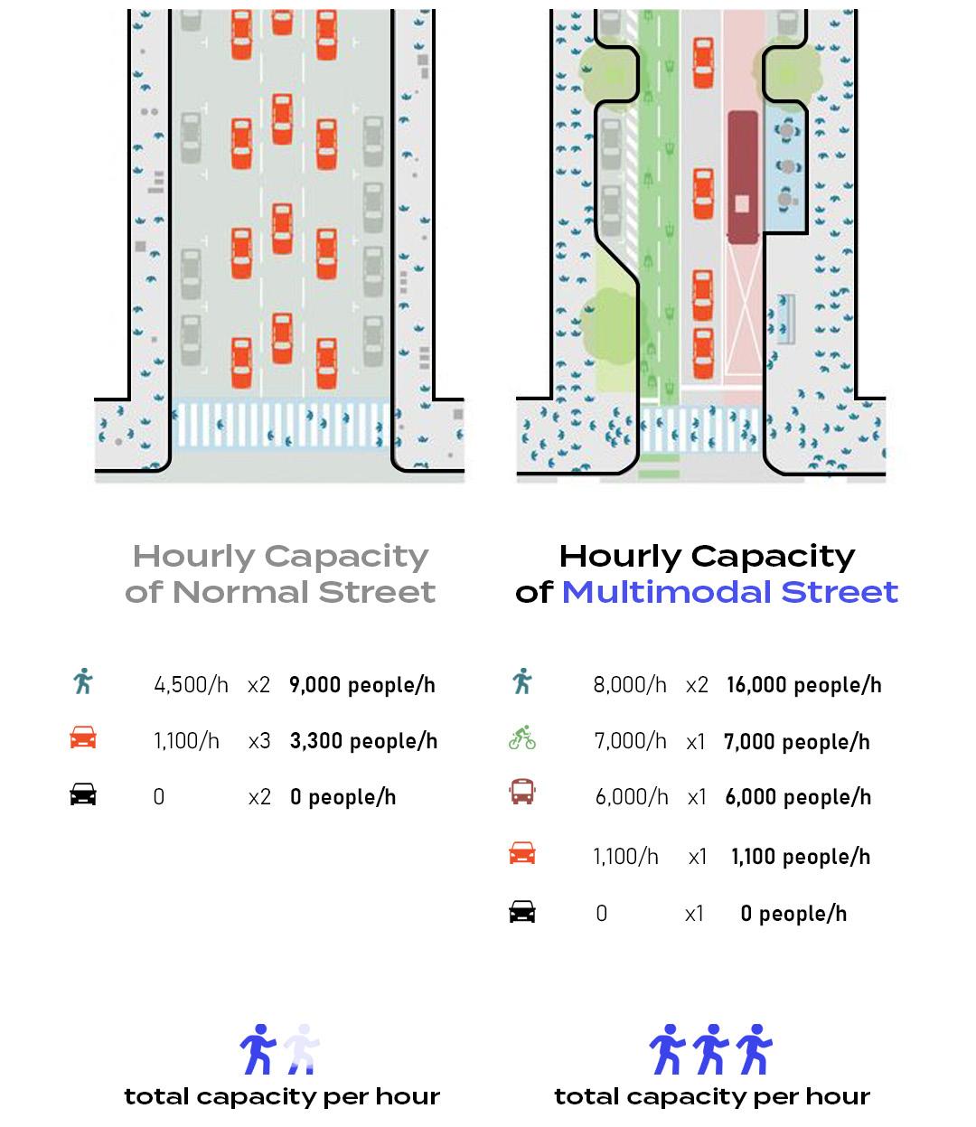 In essence, a multimodal street can start from featuring the conventional vehicle road and a simple sidewalk.