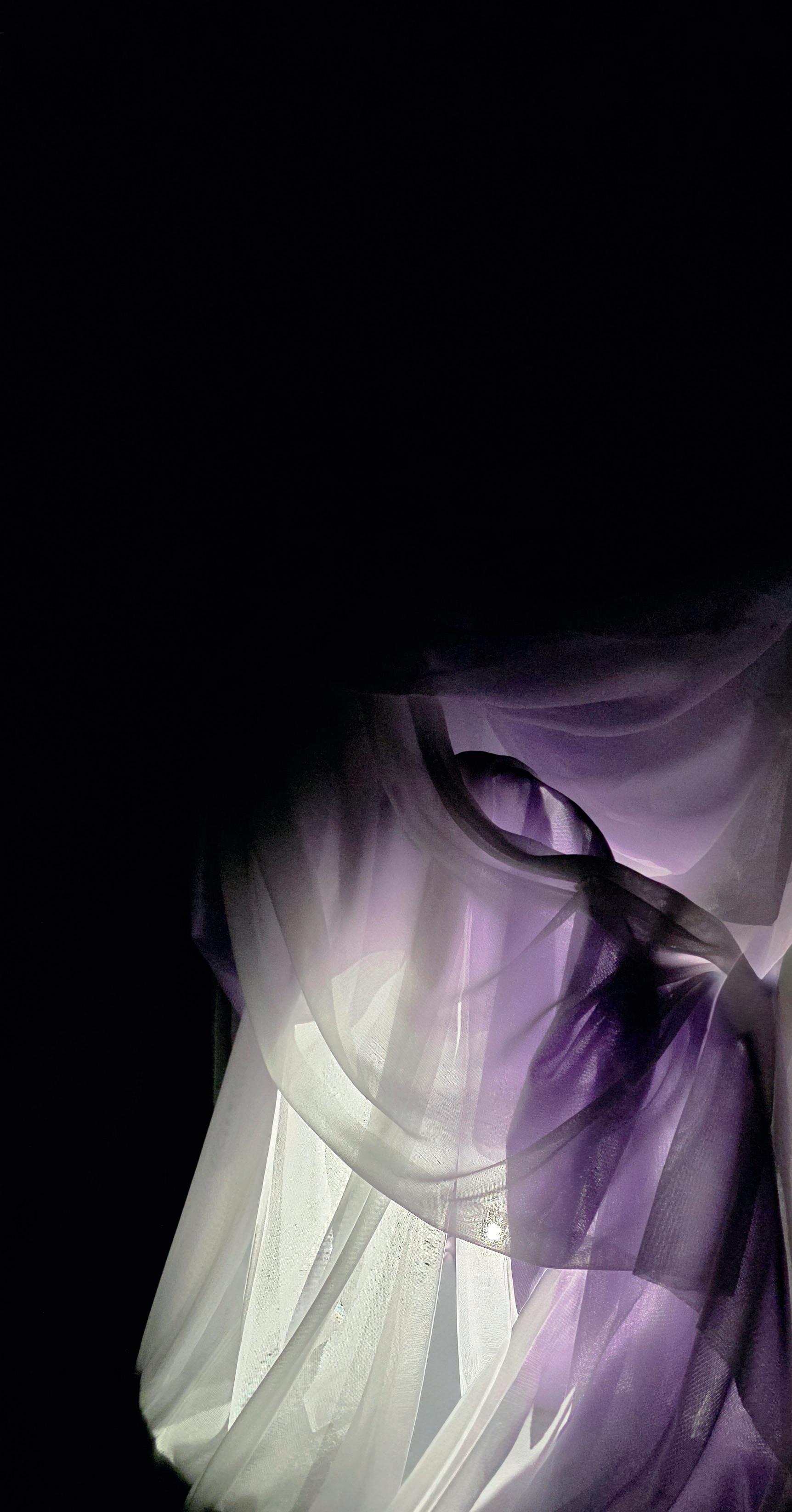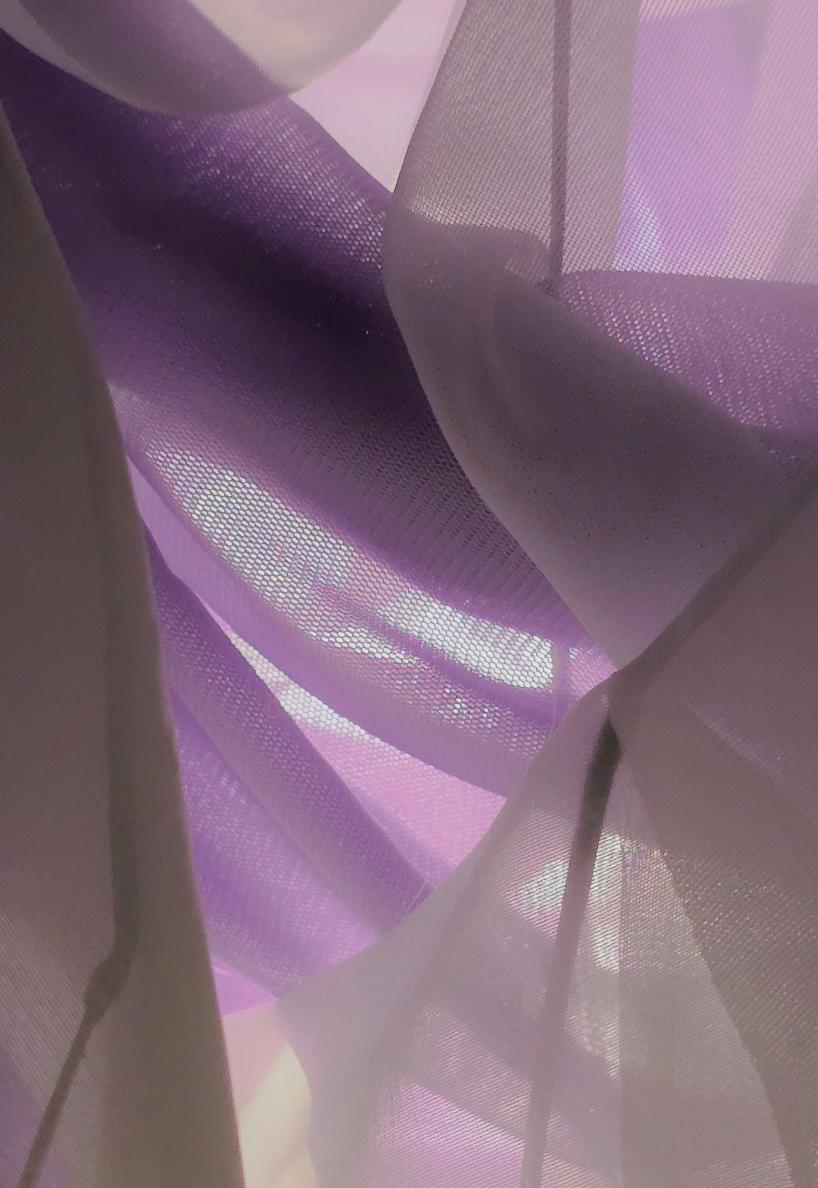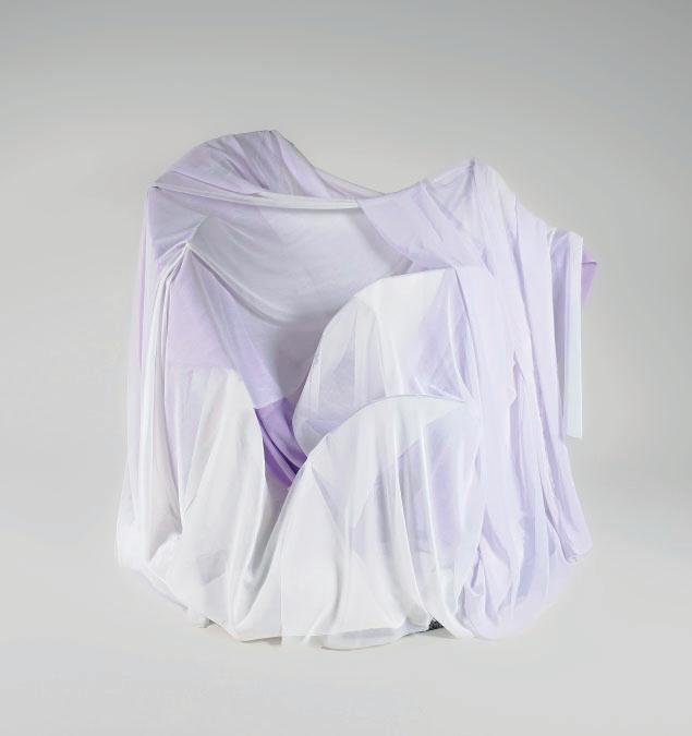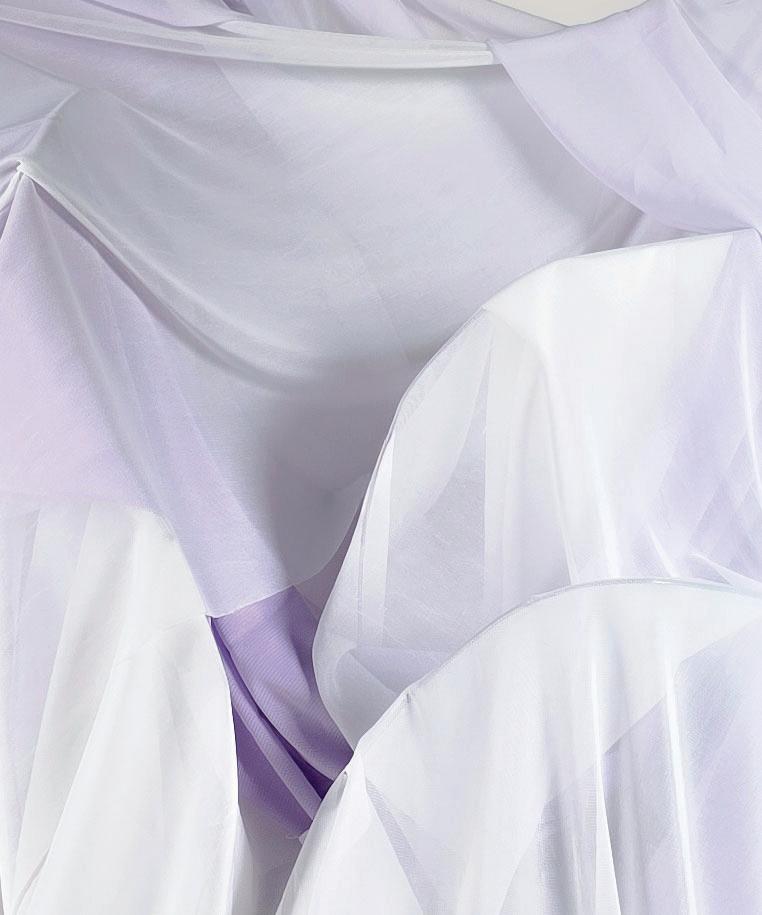 Le textile est le matériau idéal pour notre imaginaire, car il évoque la douceur, la légèreté, la transparence, la couleur, mais surtout, il nous offre une multitude de manières de le travailler. Nous avons décidé de le travailler le plus naturellement possible, simplement en le déposant et en le drapant, afin de lui donner vie à travers le relief de ses plis. Toutefois, il exige à sa forme la plus naturelle d’être tenu par une structure externe. C’est ainsi que nous avons exploré en parallèle le travail du métal devenant le squelette caché solide, mais malléable.