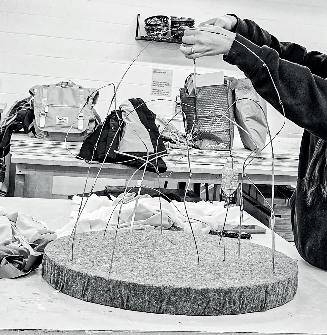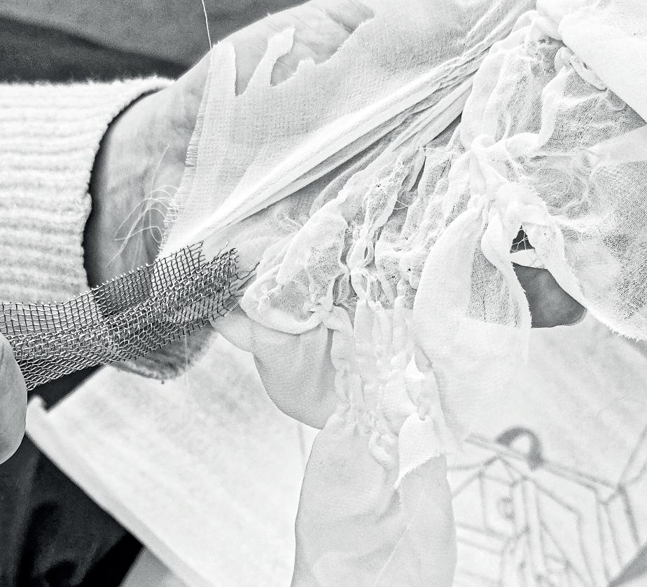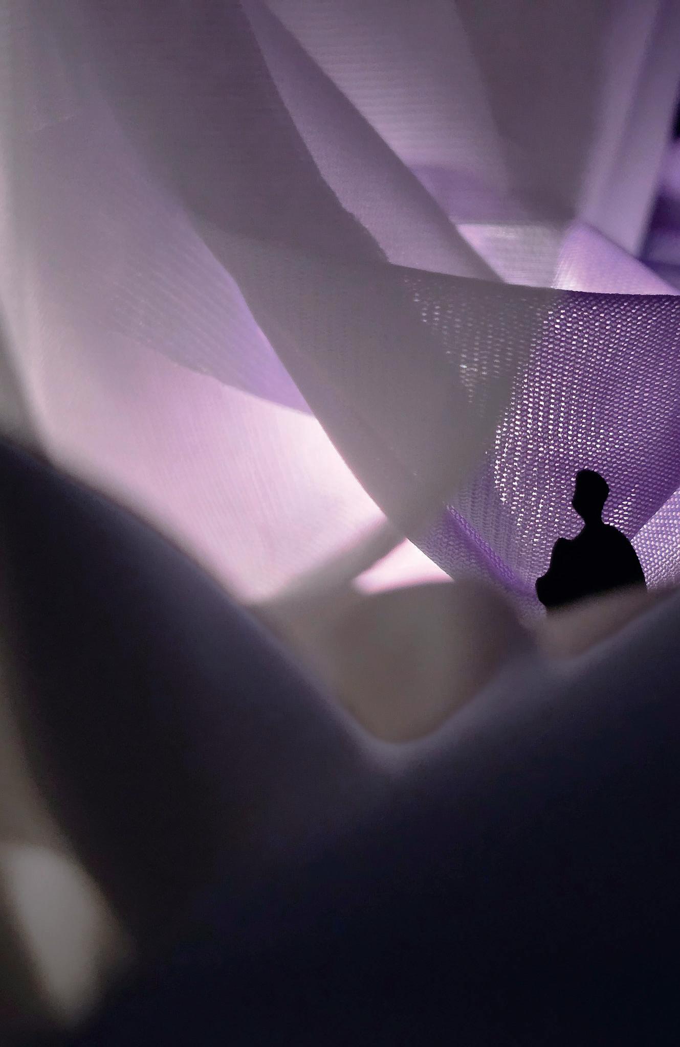 Le textile est le matériau idéal pour notre imaginaire, car il évoque la douceur, la légèreté, la transparence, la couleur, mais surtout, il nous offre une multitude de manières de le travailler. Nous avons décidé de le travailler le plus naturellement possible, simplement en le déposant et en le drapant, afin de lui donner vie à travers le relief de ses plis. Toutefois, il exige à sa forme la plus naturelle d’être tenu par une structure externe. C’est ainsi que nous avons exploré en parallèle le travail du métal devenant le squelette caché solide, mais malléable.