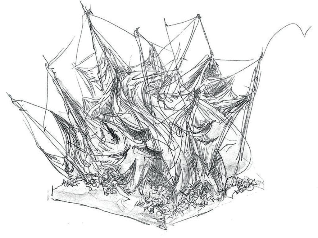 Le choix du textile évoque la sensibilité. Il est la douceur, la légèreté de la fleur. Il est la souplesse de la montagne et de la mer tramée de vagues, mais difficile à déchirer. À Paris, le textile évoque la romance d’une architecture harmonieuse. Il définit la trame des plis de la main, tout comme la trame de la rétine. Dans l’amour, il est la sensation de la légèreté et le tissage des liens sociaux.