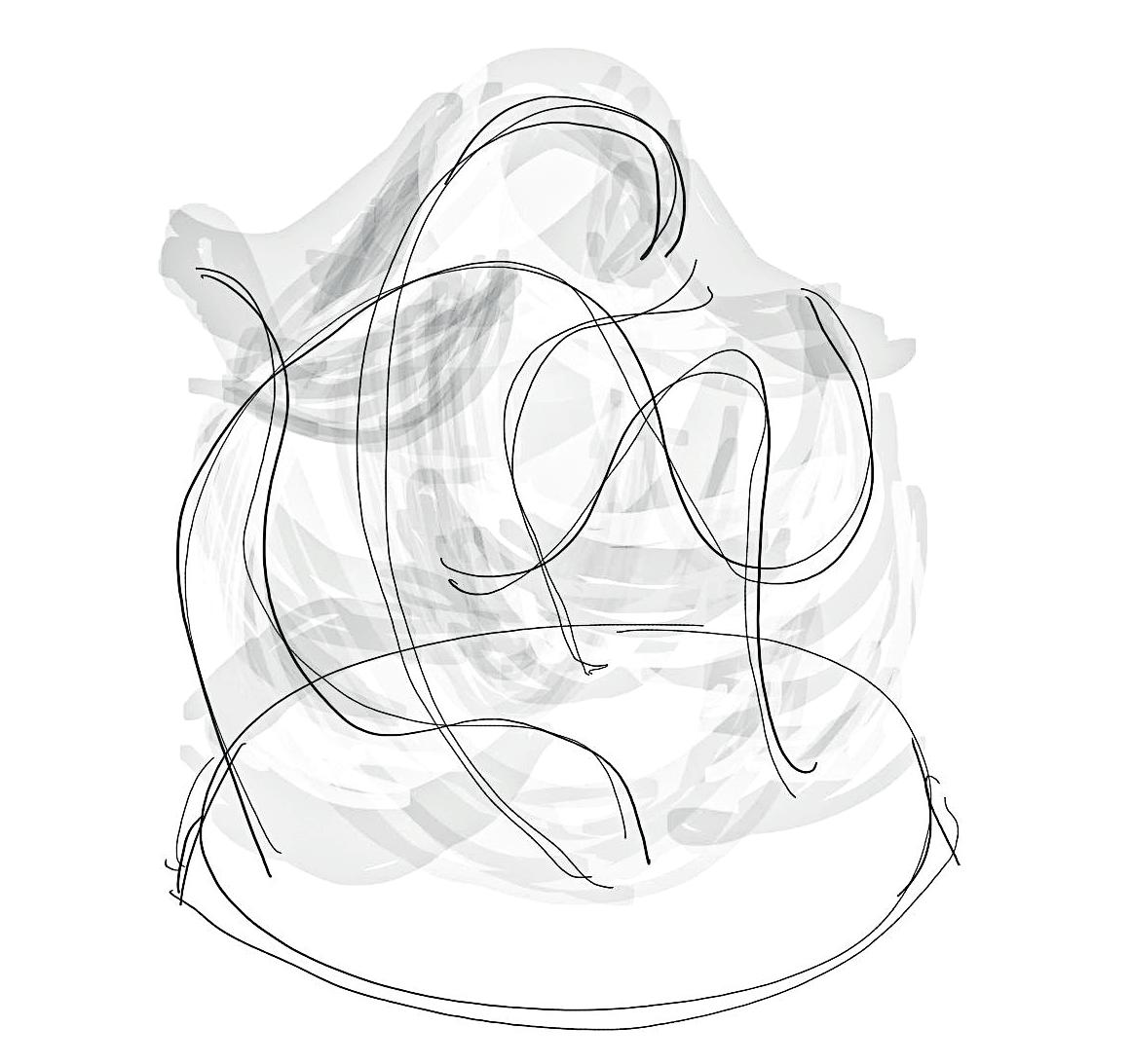 Le chemin de la tige métallique façonne la forme finale. Elle est le relief que l’on retrouve aussi bien dans le chemin arborescent des racines que dans un chemin de randonnée d’une montagne. Elle devient courant sous-marin ou chemin labyrinthique dans les rues de Paris. Sur la peau, c’est la cartographie des plis de la main et leurs intersections. Pour l’œil, c’est le chemin qui prend la lumière. Pour l’amour, le chemin voyage entre peine et passion.