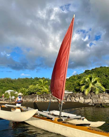 out on the water. The Moana Explorer is a triple-hulled va’a or sailing canoe built from fibreglass to traditional design; I wade out to clamber onto the stretch of mesh strung between its hulls. My guide, Steve, assumes his paddling position in the central hull and we set off, skirting the edge of the reef to head for the open ocean. Once we’re clear of the headland the breeze picks up. Flying fish break the surface and skitter in front of our bow. Tahiti grows smaller behind us and clouds shift to reveal the peaks I’d been amongst the day before.