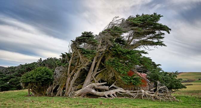 Nearby, a much-photographed line of macrocarpa trees has been blown and shaped in extraordinary fashion, like a huge head of hair slicked flat by the gel-effect of incessant gales. It’s a reminder, if one were needed, of how the great Southern Ocean dominates every facet of life here.