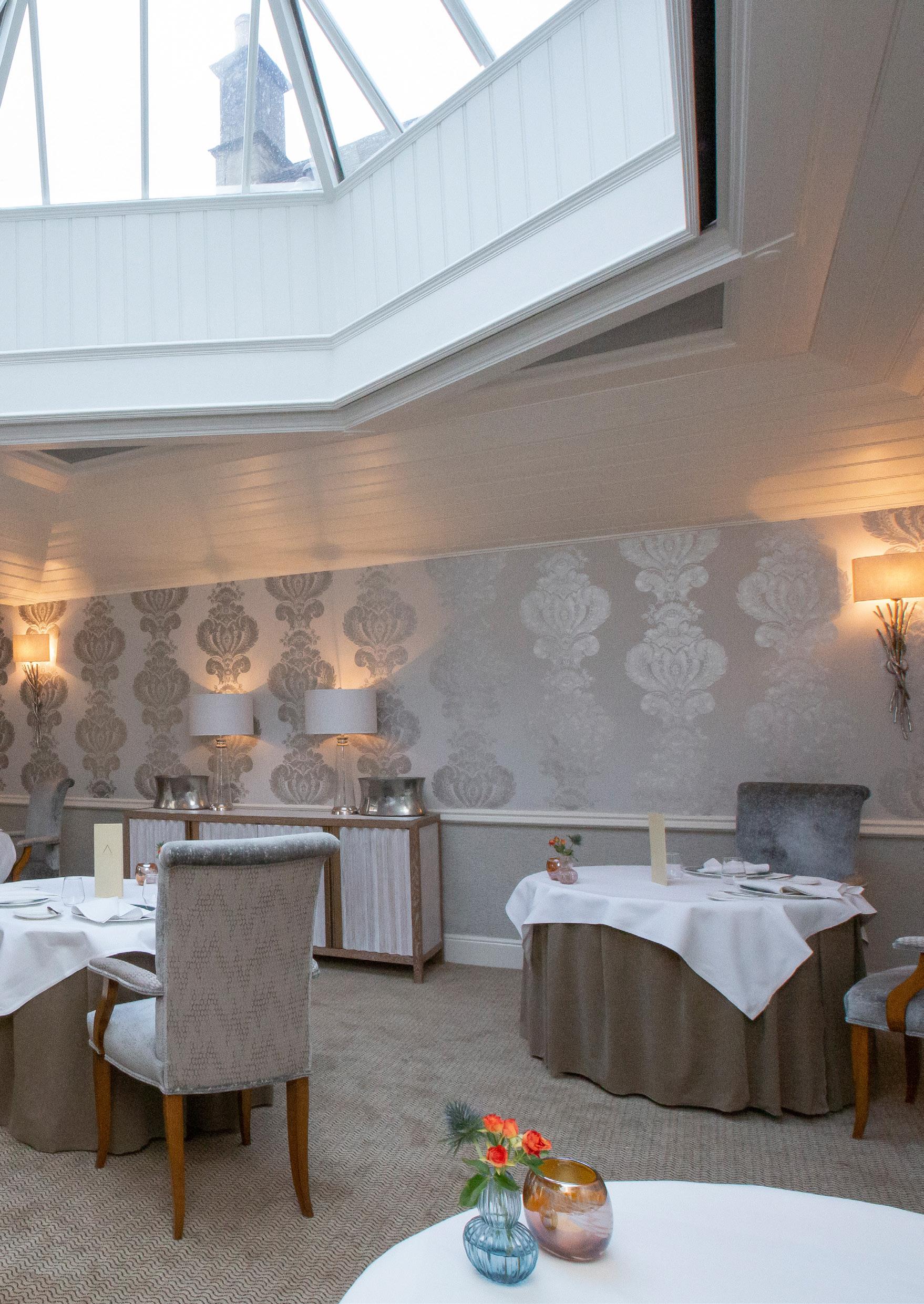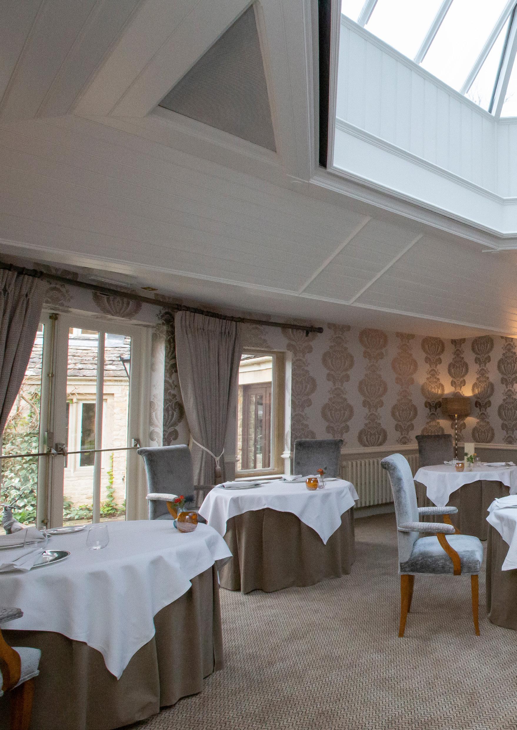 Built from golden Cotswold stone, the comfortable Slaughters Manor House dates from the 17th century, and offers a stylish 21st-century interpretation of country living, boasting well defined areas, including a snug, billiards room, library and lounge, and a bar in partnership with the Sipsmith distillery. The elegant dining room is an airy, light-filled space with nicely spaced, linen-clad tables, offering impressive explorations of texture and flavour.