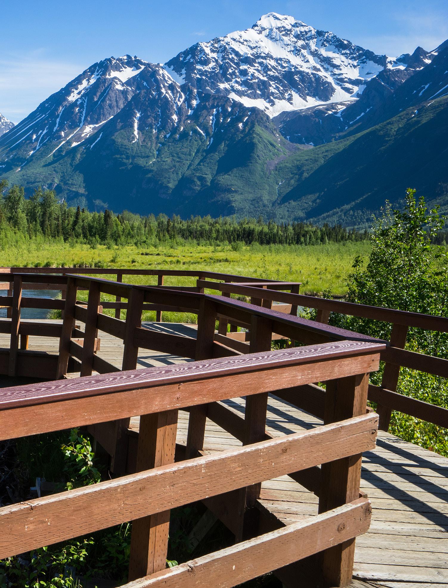 You’re in good company for the first stretch of the drive, as Turnagain Arm is always in view. Whether at full tide—and possibly with surfers taking on the bore tide—or low tide, when eagles hang out on the mudflats to scan for a meal, the Arm is one long photo op. The first must-stop for nature buffs— especially birders—and photogs alike comes just after leaving Anchorage. Potter Marsh is the summer home of more than 100 kinds of migratory birds. The swans are always the first to arrive in the spring (when the water is still partially frozen) but soon after, ducks aplenty, grebes, and red-winged blackbirds will join them. Stroll the boardwalk for the best viewing spots. After Potter Marsh, most of the pull-offs on the highway are easier to access during the drive south, so stop as much as you would like. No need to rush. You have hours to go before the ever-so-brief twilight hours even think about sifting in. Watch the water for beluga whales getting their fill of salmon.