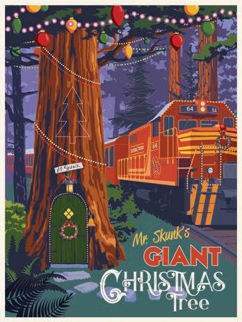 Embark on an enchanting rail journey into the heart of the redwoods to Mr. Skunk's wonderful Santa’s workshop—a giant redwood tree bedecked in Christmas splendor!