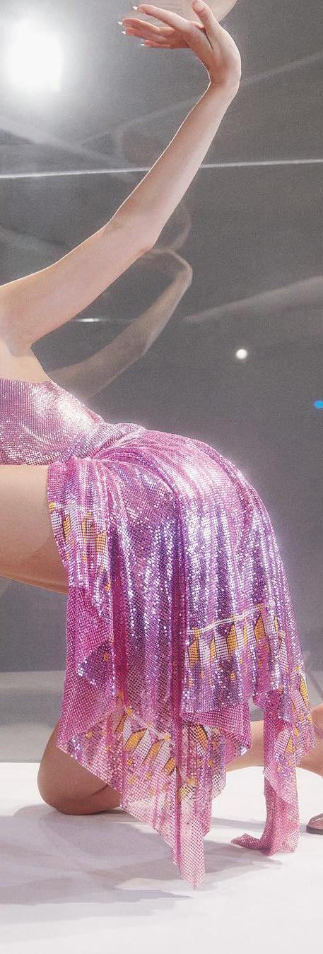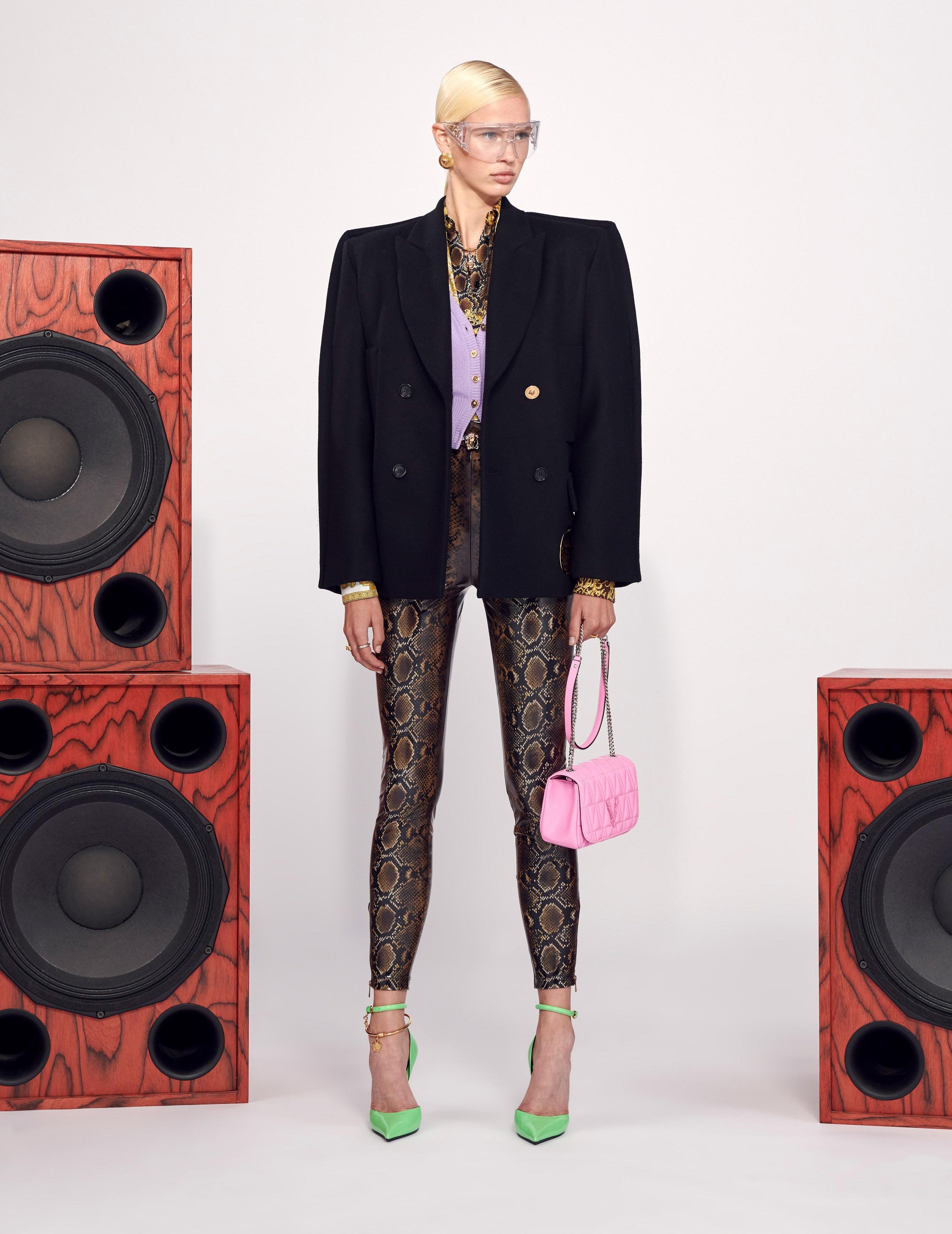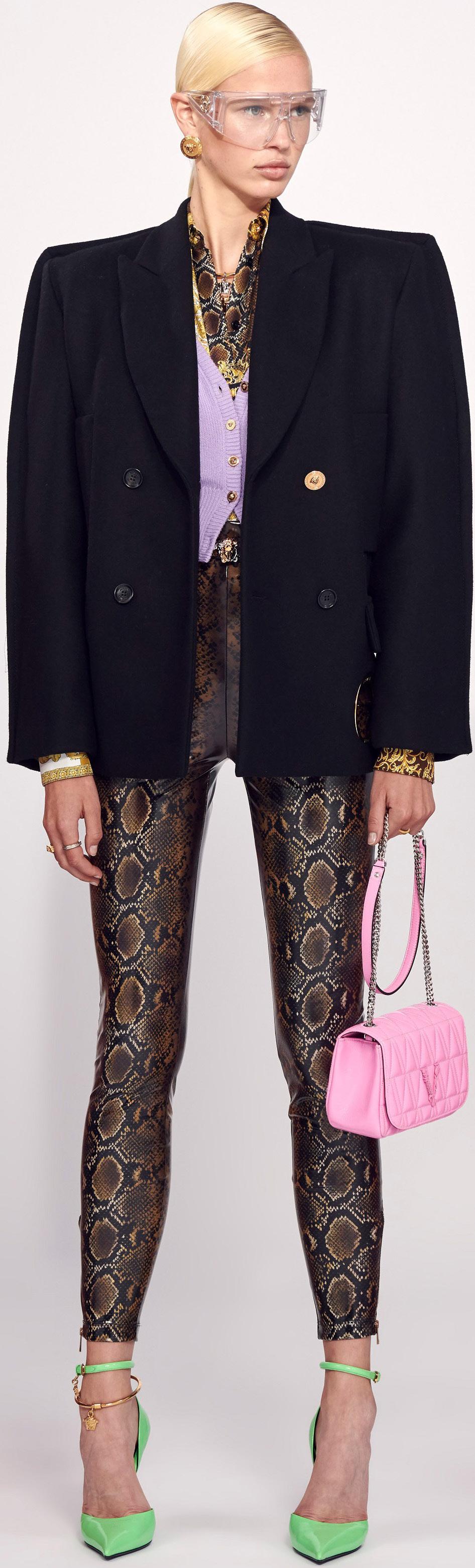 The menswear was sportier, with sweats, surfer tees, wide-leg shorts, and tracksuits featuring a bold Medusa Amplified motif mixed with snakeskin patterns. Cropped-wide-pant suits in pastel colors—lavender, mint, baby blue— provided a tongue-in-cheek soft-tailored alternative to formal dressing.