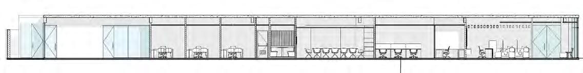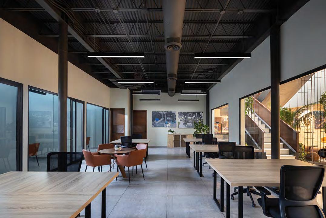 El taller de trabajo constituye el área principal de la oficina. Un gran espacio a doble altura donde hay la capacidad para que 16 colaboradores puedan interactuar en un ambiente de planta libre, integrado inmediatamente con el área destinada para los Directores de la firma, la cual a su vez se expone al exterior a través de ventanales panorámicos con altura piso a techo que proporcionan gran iluminación natural. El área se complementa con un espacio de trabajo colaborativo en una gran mesa alta integrada a las áreas de biblioteca, impresión y audiovisuales, así como al área de impresión 3D.