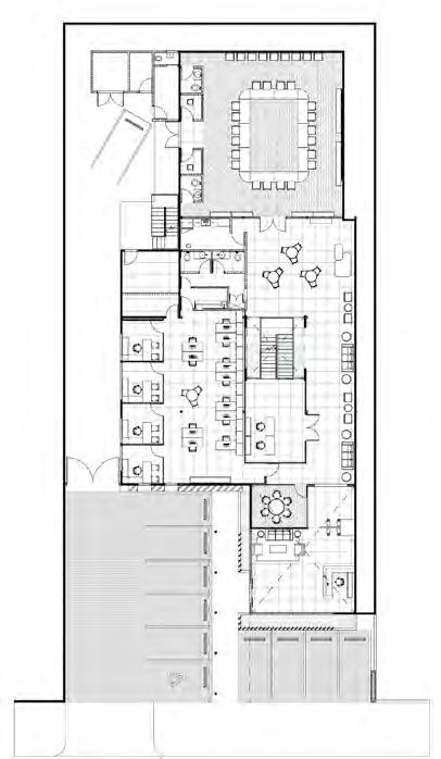 Estas variables fueron factores fundamentales en la selección de un espacio de 245 mts 2 en el 2 do nivel de la Torre Empresarial Novo Centro, en el cual por sus características de doble altura fue posible desarrollar un área de mezzanine de unos 70 mts 2 adicionales, configuración que permite un predominio de espacios de gran altura que se organizan en torno a la escalera y el nivel superior.