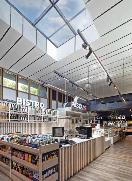 En su paleta de acabados predomina un estilo industrial, establecido primordialmente por la visible estructura metálica de la que está construido el mezzanine y acentuado por la exposición de la mayor parte de las instalaciones técnicas, en un gesto de sincerizar así la integración de la arquitectura con los sistemas que la permiten funcionar. El ambiente se complementa con un piso de tono gris neutro que se asimila al hormigón visto y amplias paredes recubiertas en madera sintética que le dan escala, textura y calidez al conjunto.