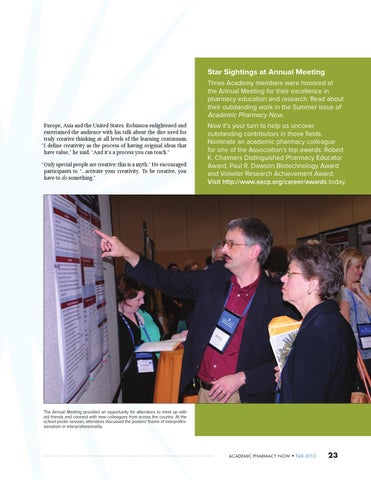 Star Sightings at Annual Meeting Three Academy members were honored at the Annual Meeting for their excellence in pharmacy education and research. Read about their outstanding work in the Summer issue of Academic Pharmacy Now. Europe, Asia and the United States. Robinson enlightened and entertained the audience with his talk about the dire need for truly creative thinking at all levels of the learning continuum. “I define creativity as the process of having original ideas that have value,” he said. “And it’s a process you can teach.” “Only special people are creative: this is a myth.” He encouraged participants to “…activate your creativity. To be creative, you have to do something.”