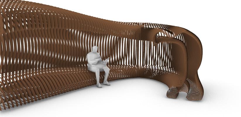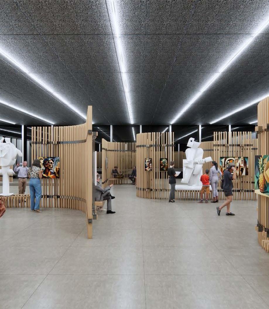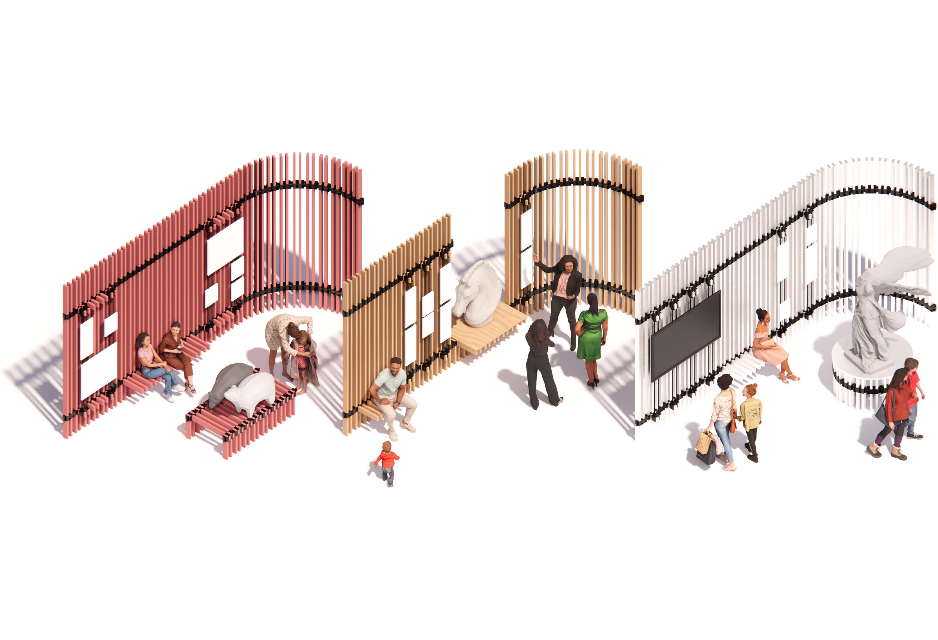 The wall system distinguishes itself through its flexibility, modularity, and adaptability and can be easily repurposed. Its design accommodates a range of straight and curved forms, serving dual functions. Additionally, it offers a versatile platform for showcasing diverse artwork and provides seating for viewers.
