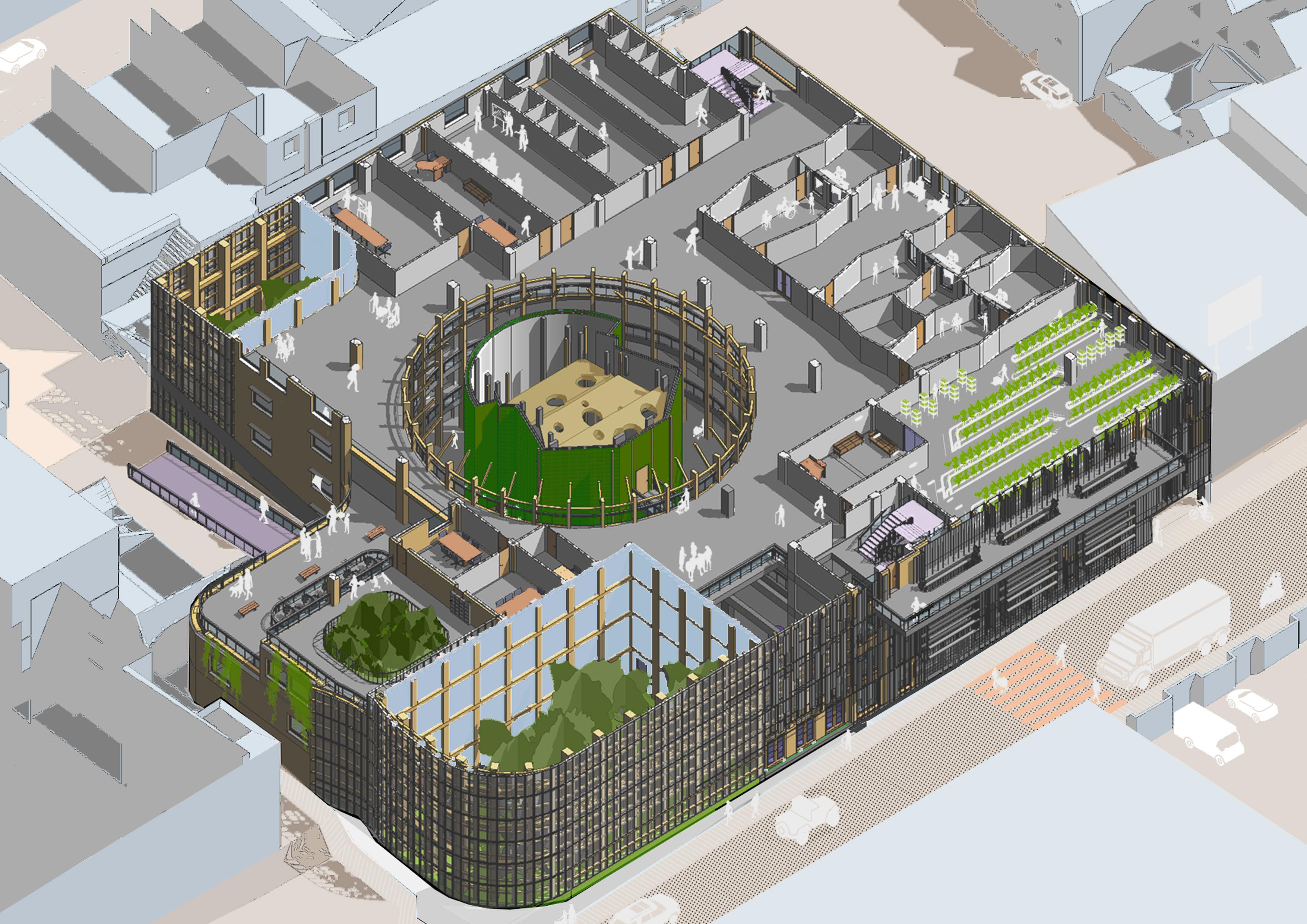 The proposal focused on the collaboration between three separate organisations: Our Kitchen, Windmill Community Gardens, and Pie Music Factory. Although the clients’ goals were different, the common theme was focusing on a better tomorrow. ‘Our Kitchen’ charity headquarters created a unique opportunity to rethink the typical food bank and meal kits. Additionally, collaborating with ‘Windmill Community Gardens,’ who produce eco-friendly vegetables at a cheaper price. Finally, ‘Pie Music Factory’ introduced an after-school music facility, creating exopsure for for an educational opportunity of growing vegetables. The building was organised where on one half of the facade was greenrooms, and the other contained enclosed spaces. This idea was mirrored onto the facade showing the collaboration of natural and built enviroment, from man-made to organic forms.