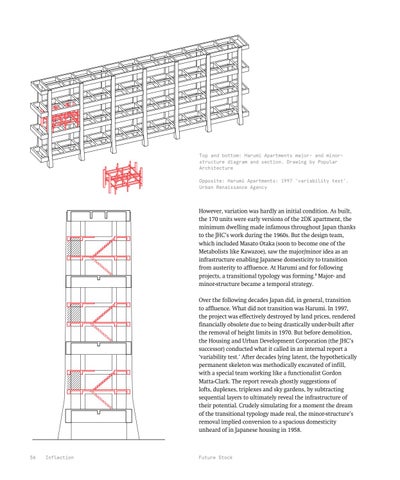 Top and bottom: Harumi Apartments major- and minorstructure diagram and section. Drawing by Popular Architecture Opposite: Harumi Apartments: 1997 'variability test'. Urban Renaissance Agency
