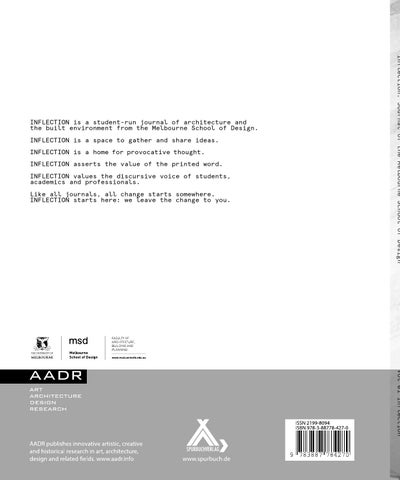 INFLECTION is is aa themed, home forstudent-run provocativejournal thought. INFLECTION based at the Melbourne School of Design, at Melbourne University, Australia and published by AADR INFLECTION asserts the value of the printed word. – Art Architecture Design Research (Spurbuchverlag) aadr.info / spurbuch.de INFLECTION values the discursive voice of students, academics and professionals. Like all journals, all change starts somewhere. INFLECTION starts here: we leave the change to you. ISBN 978-3-88778-427-0 ISSN 2199-8094