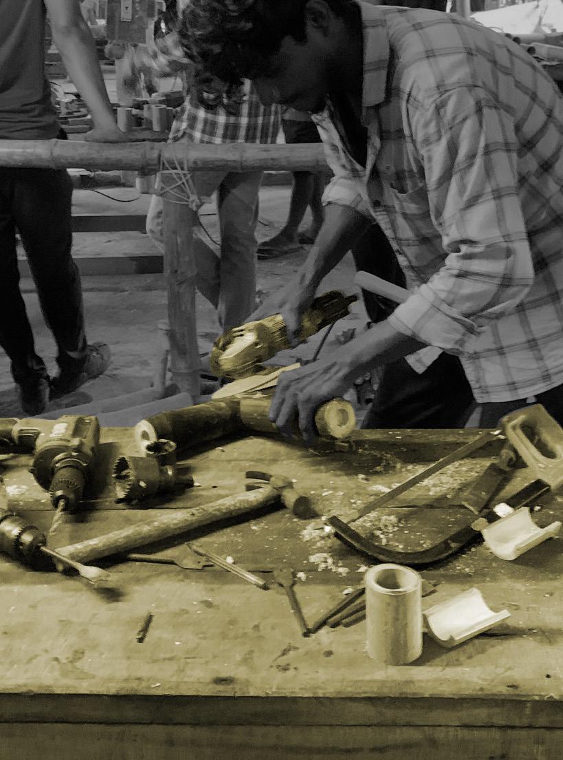 Making of the fish mouth joint : Bamboo nails and pegs are used to fix two pieces of bamboo to each other in this technique. The joinery is achieved using basic industrial equipment.