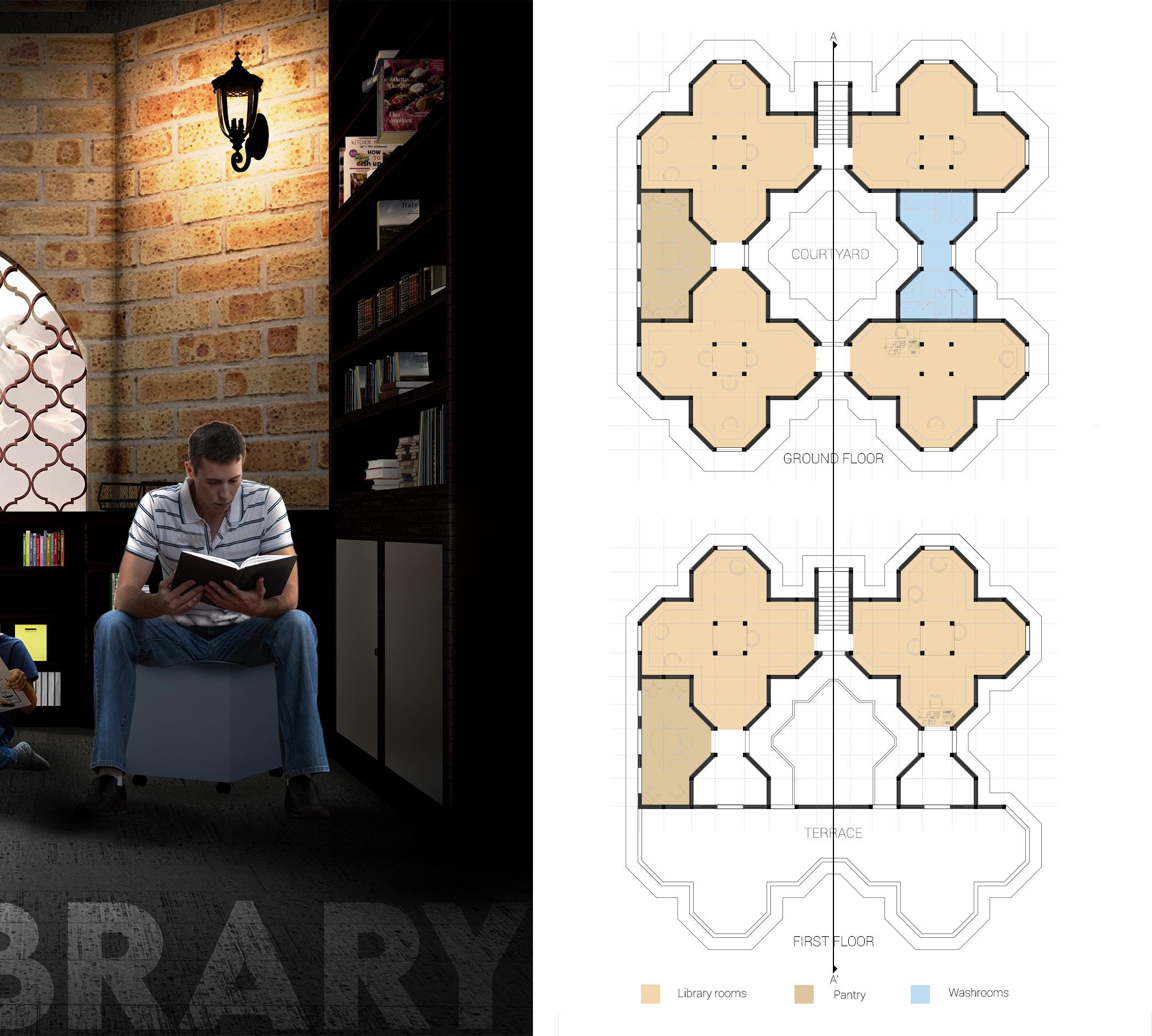 Task : To design a public library serving a population of 200 people. The library must have seperate sections for 4-8 genres. It should compliment the context of the given site.