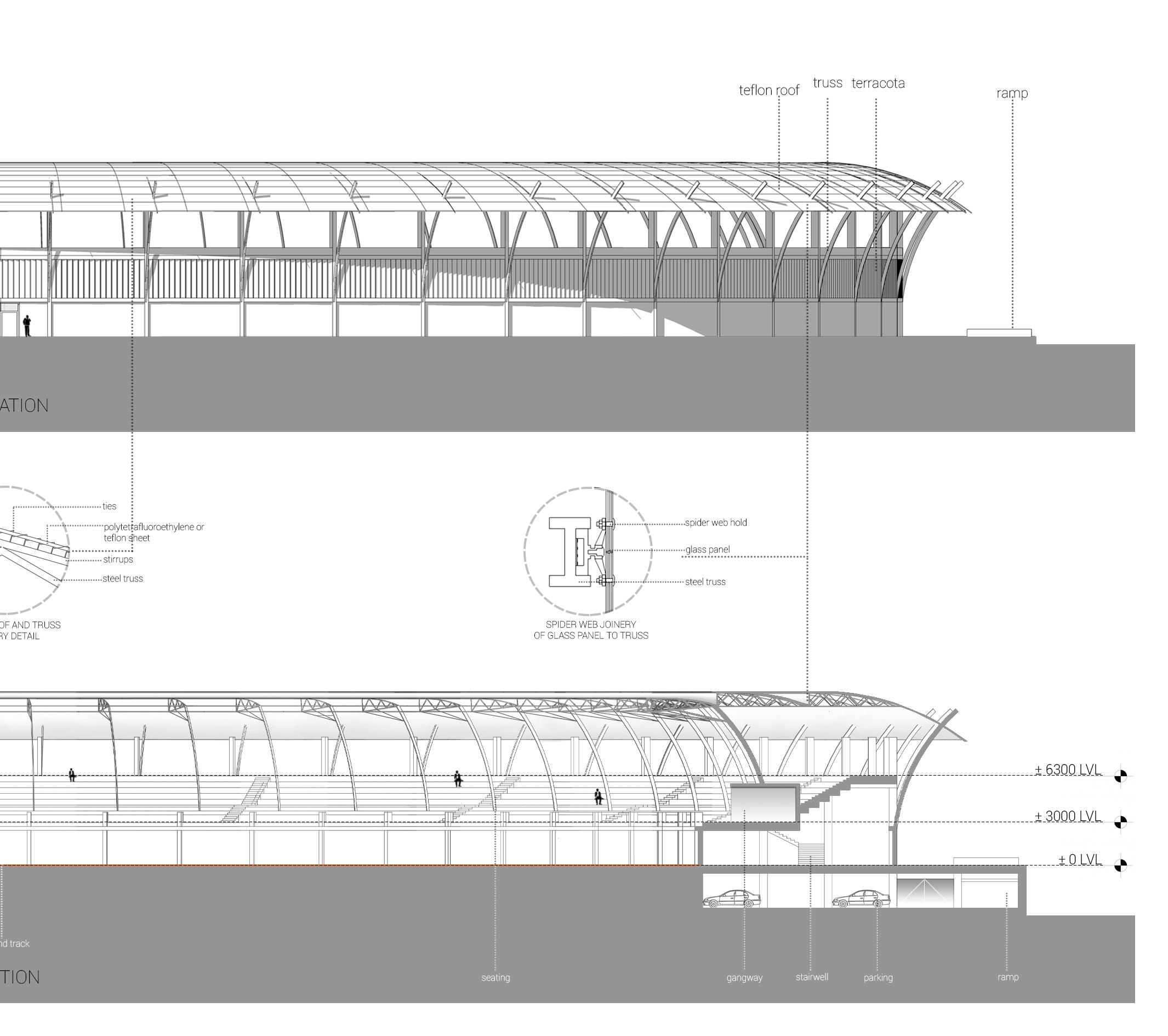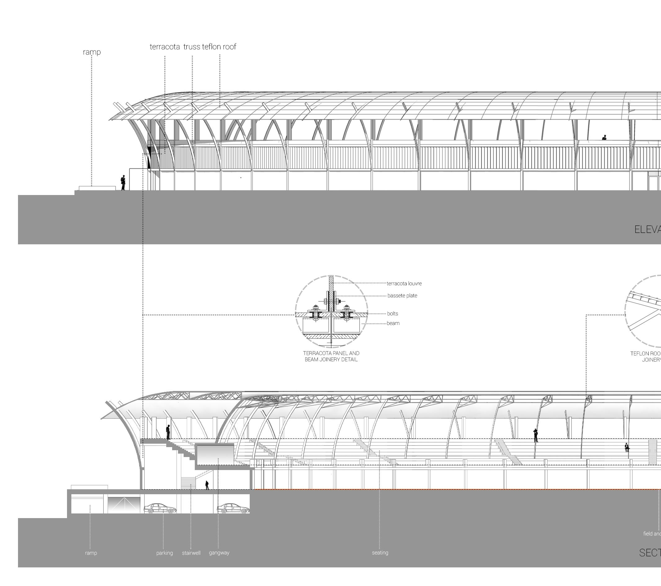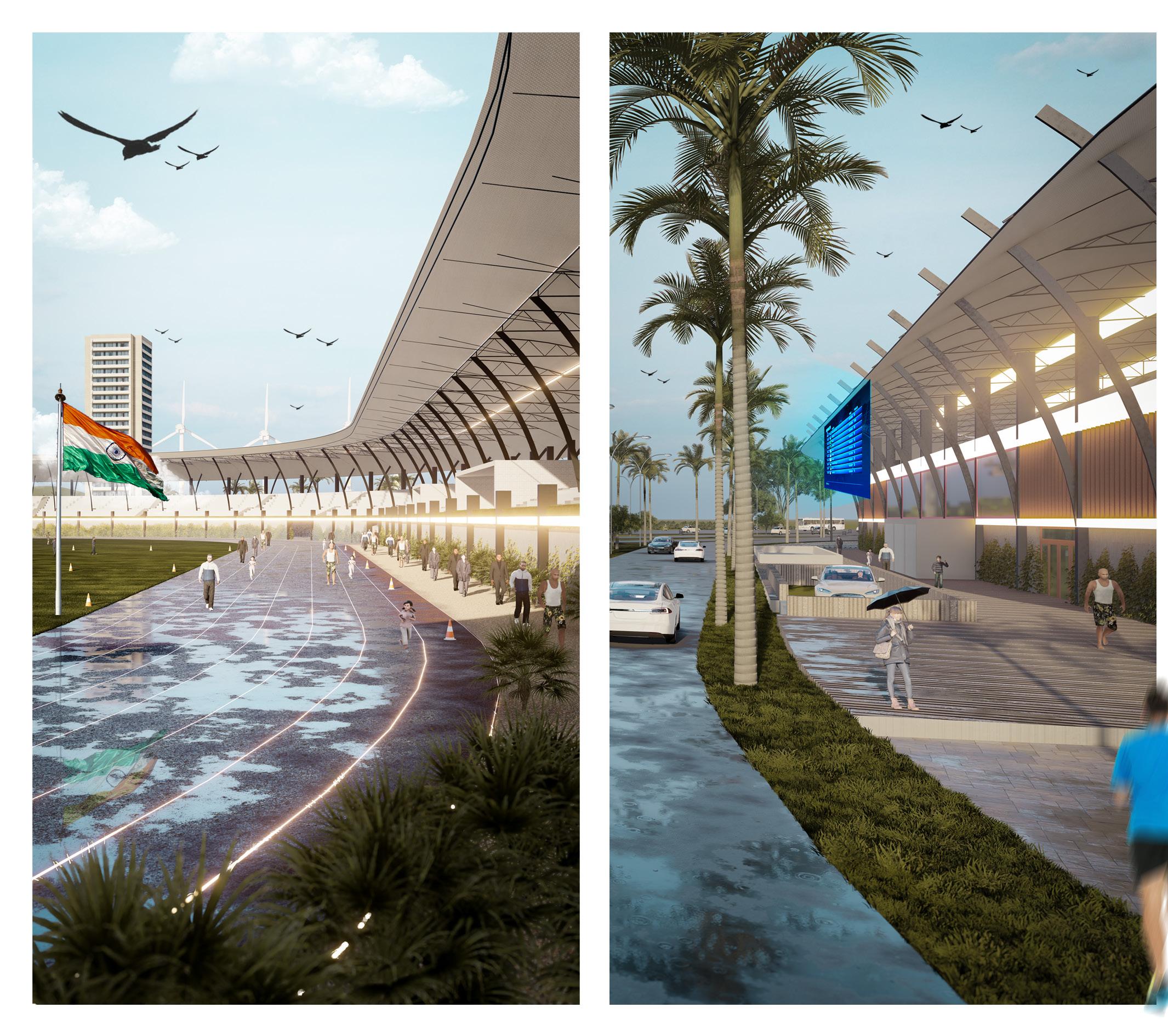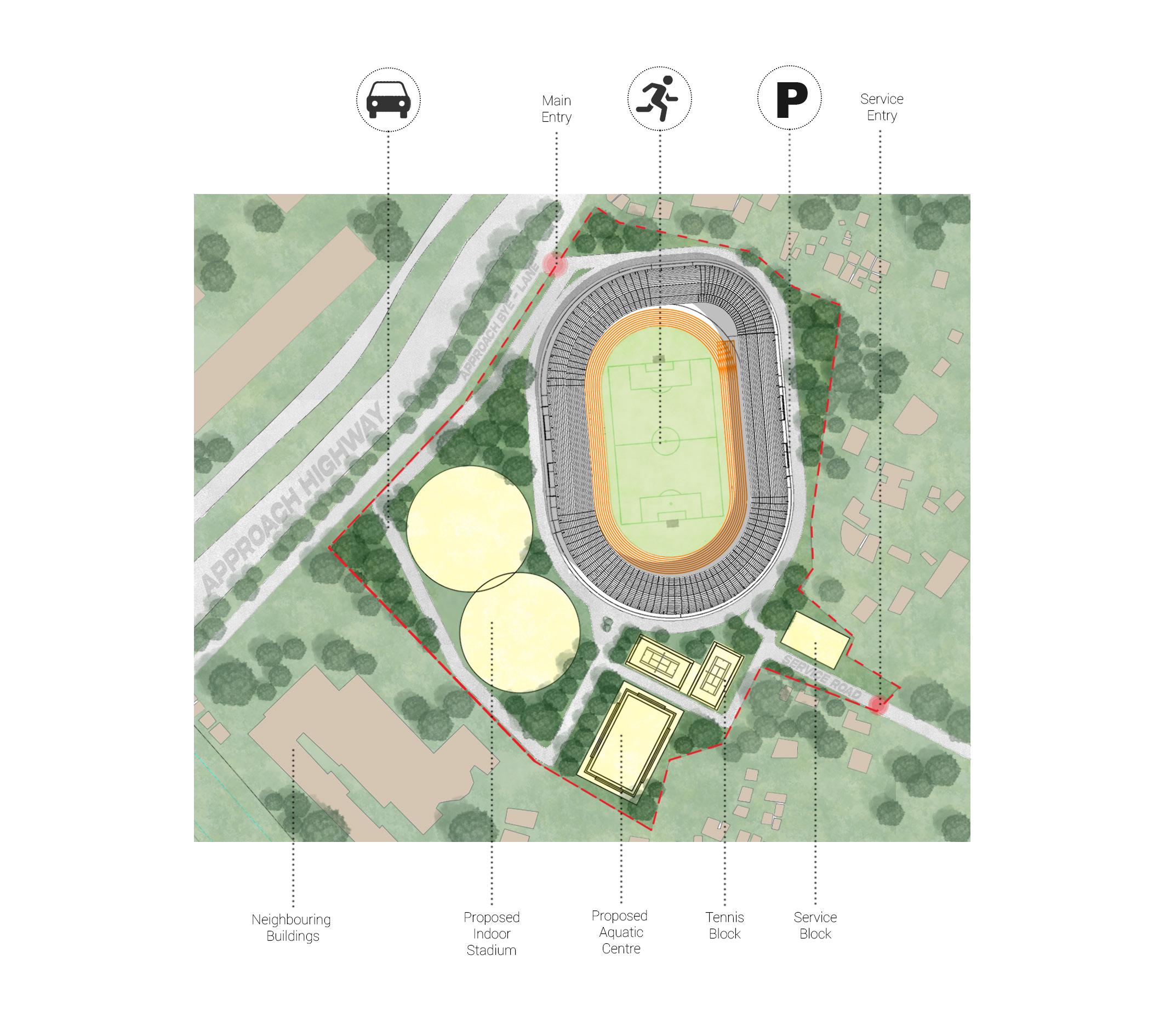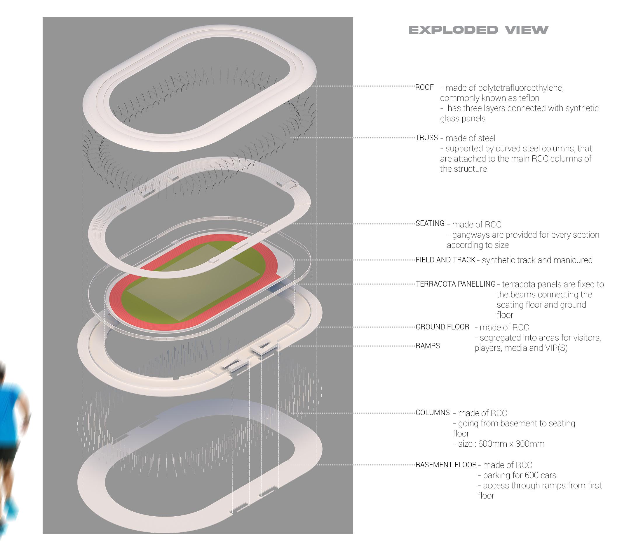 Task : To design a field and track stadium of visitor capacity 5000, following standards and byelaws of given location. Features to be included : • Ramp access to seats