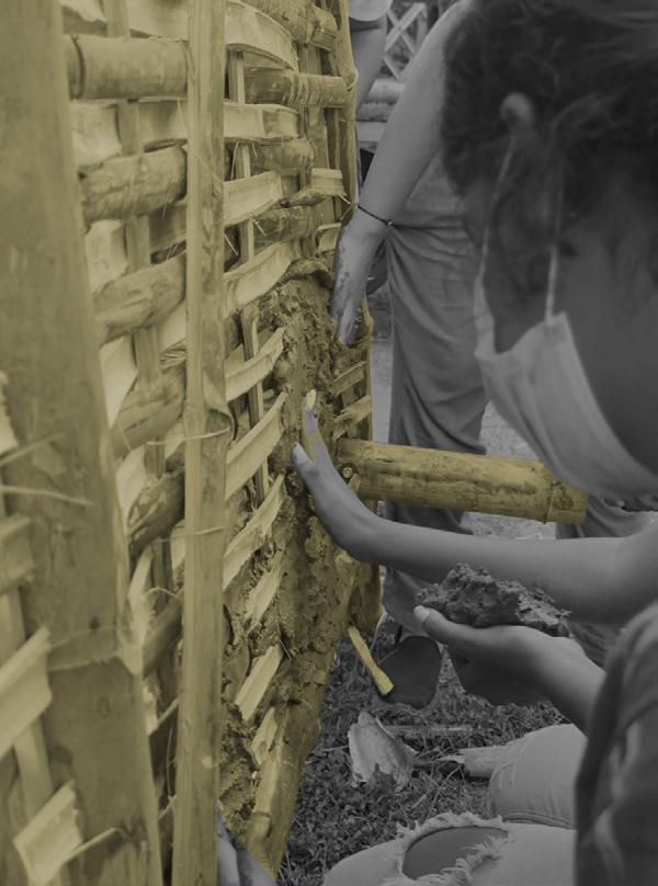 Plastering of a bamboo wall : A mixture of mud, cement, cobb and water is used to plaster the bamboo wall. It closes the air gaps and makes the wall opaque and complete.