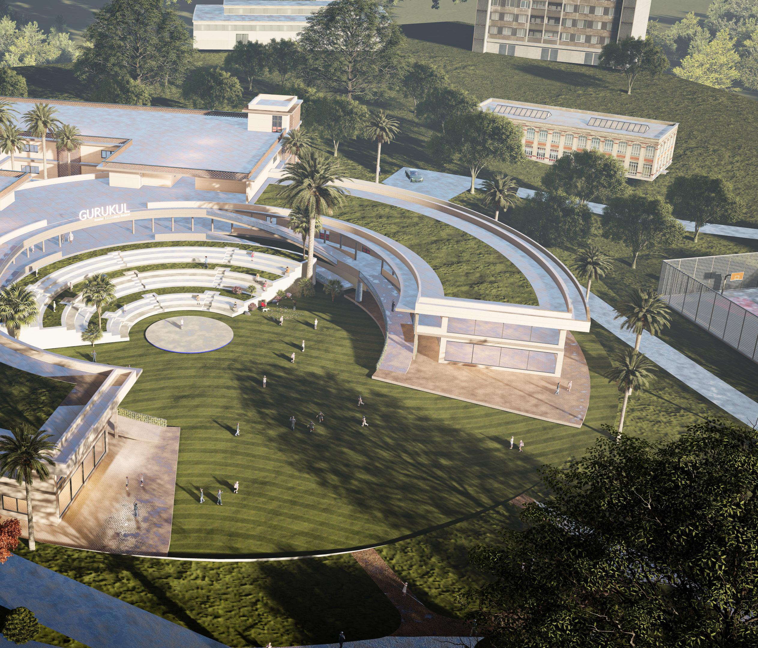 the primary inspiration of the design comes from the gurukul concept of education, where the teacher sat under a tree and the pupils gathered around the tree.