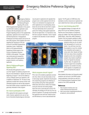 mergency Medicine (EM) will be participating in Preference/Program Signaling (PS) via the ERAS Supplemental Application in the upcoming 2022-2023 residency application cycle. However, EM will participate only in the Program Signaling portion of the supplemental application; applicants will not need to fill out the Past Experiences or Geographical Preferences and these sections will not be visible to EM programs. More detailed information regarding the mechanics of PS can be found in the ERAS Supplemental Application Guide.1 Additionally, there is a PS Applicant/Advisor Supplement Guide posted on the Council of Residency Directors (CORD) in EM website.2 This guide was constructed and reviewed by multiple national EM organizations, program directors, and residency applicants.