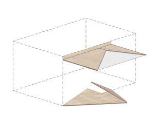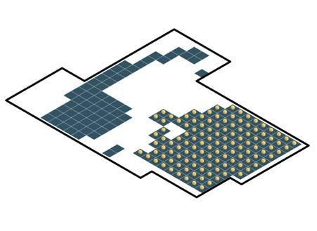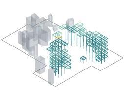 The diagram illustrates an isometric cut view of the first floor of the Rest House. In addition to the designated open courts, it is evident that voxels without assigned spatial requirements enable the top slab of the voxel below to function as additional open courts.