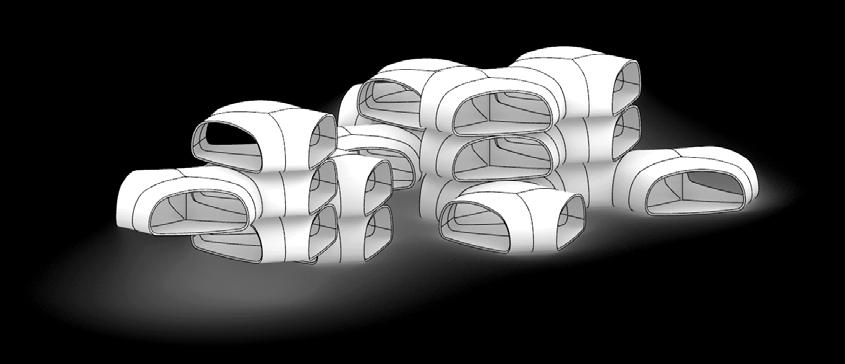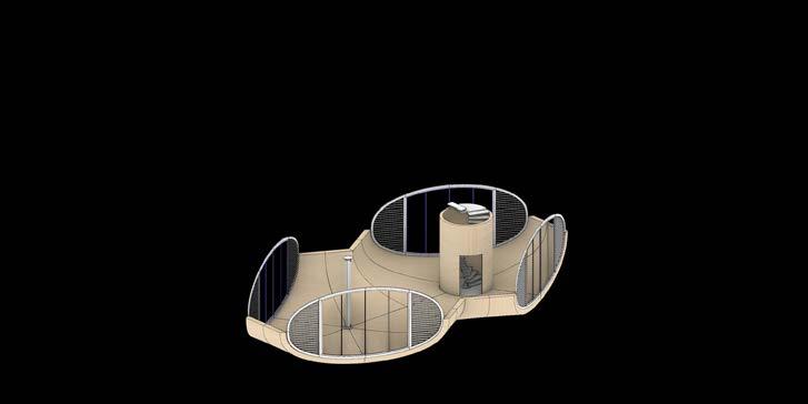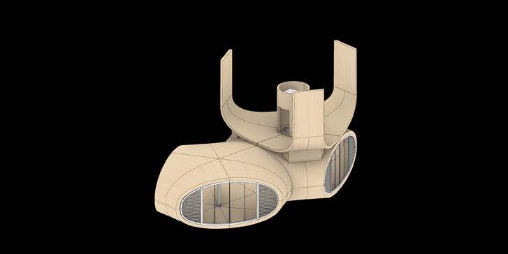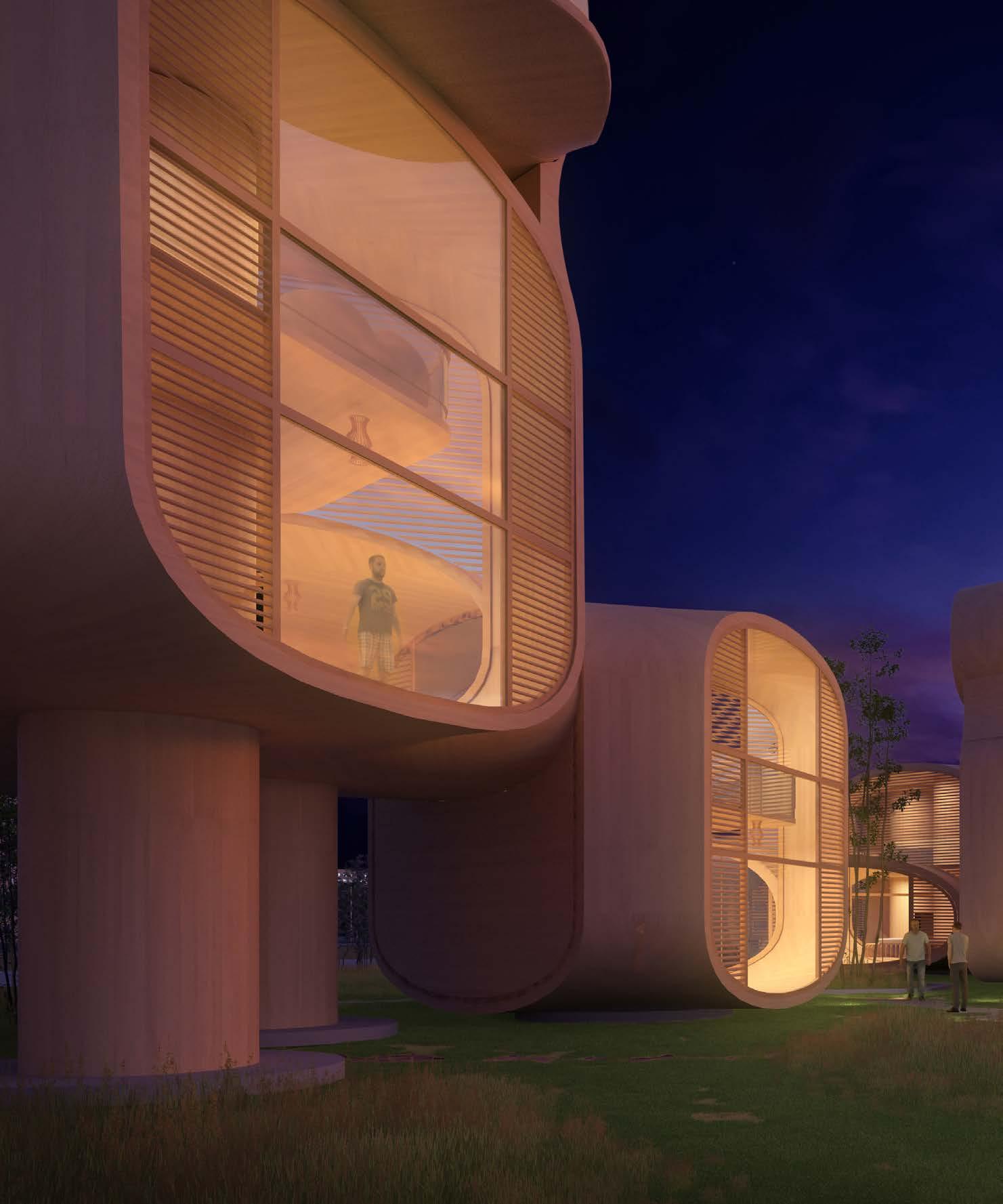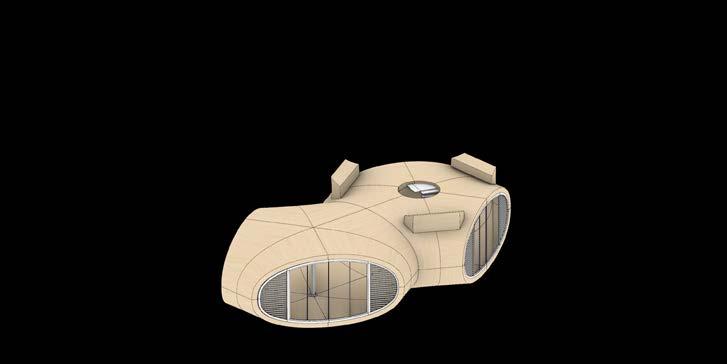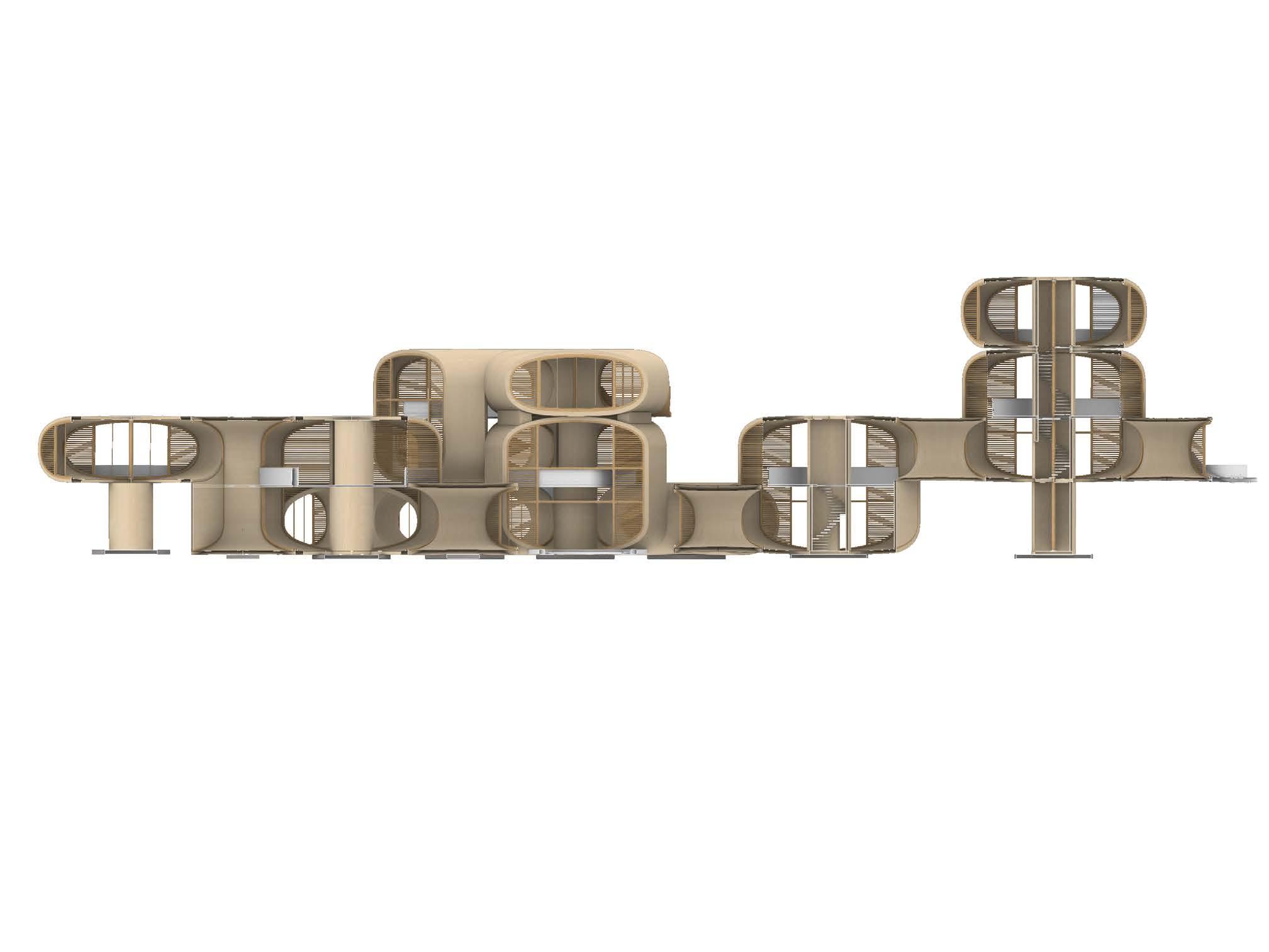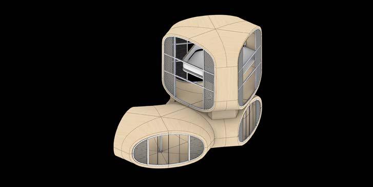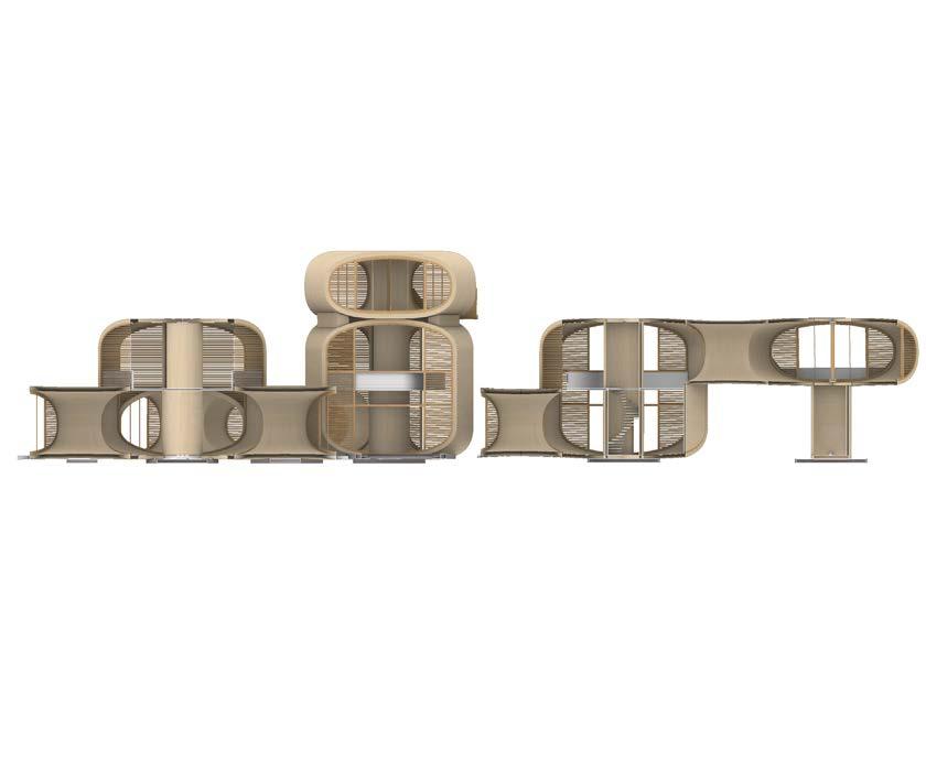 The material system is then evaluated for its structural performance and how it can be fabricated and implemented at the building scale. The material system is integrated into the design of modular housing units, the design explores the various range of curved timber panels that can be achieved and articulated into interesting morphologies. A comprehensive structural analysis indicates the suitability of the curved panels to be used as various load-bearing elements within the building system. Further geometric studies investigate how the curved timber modules can be aggregated to define well-connected spaces while emphasizing the structural logic