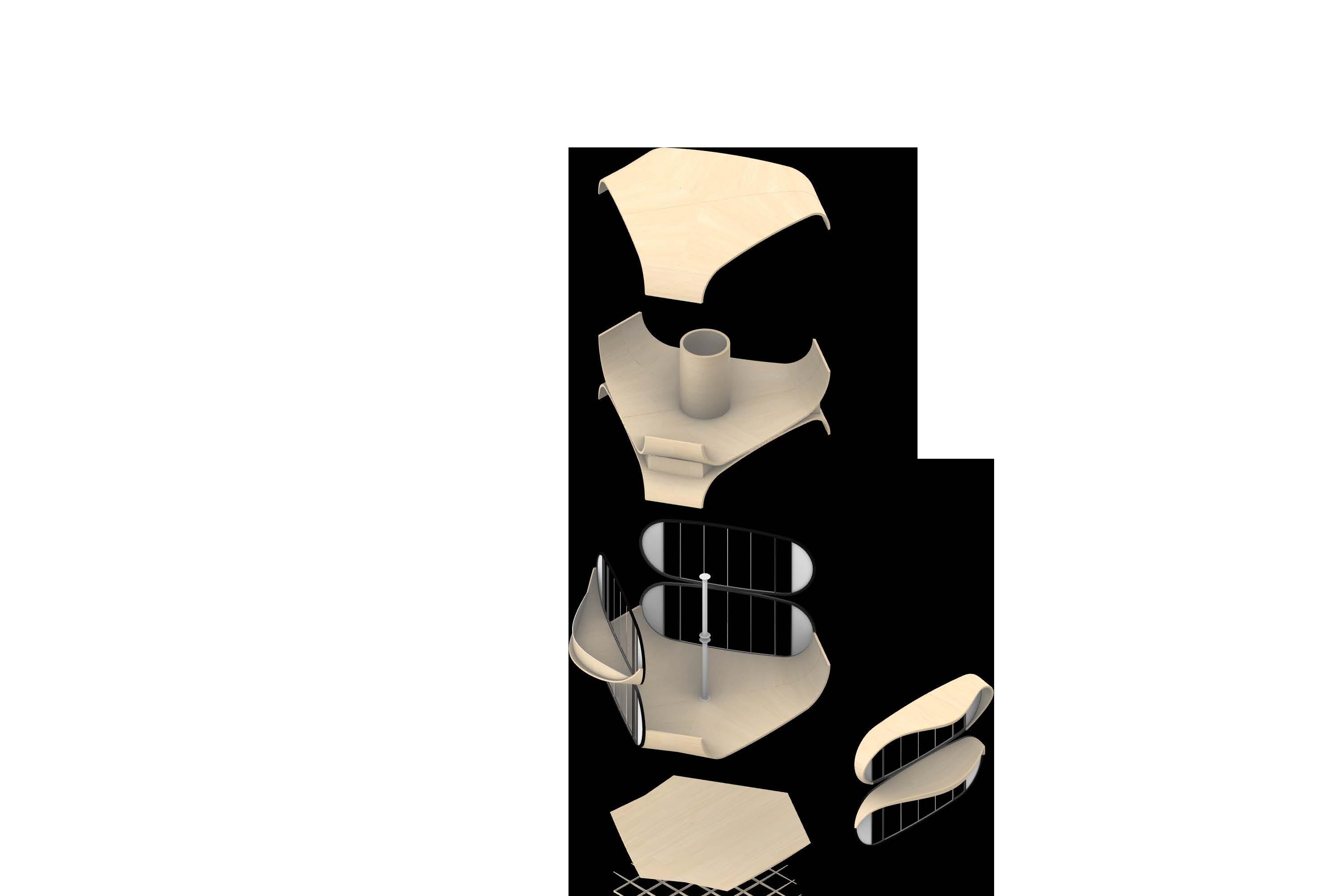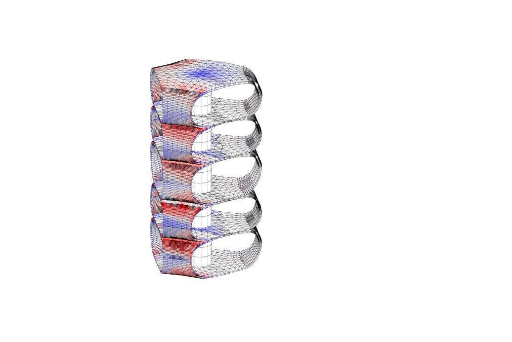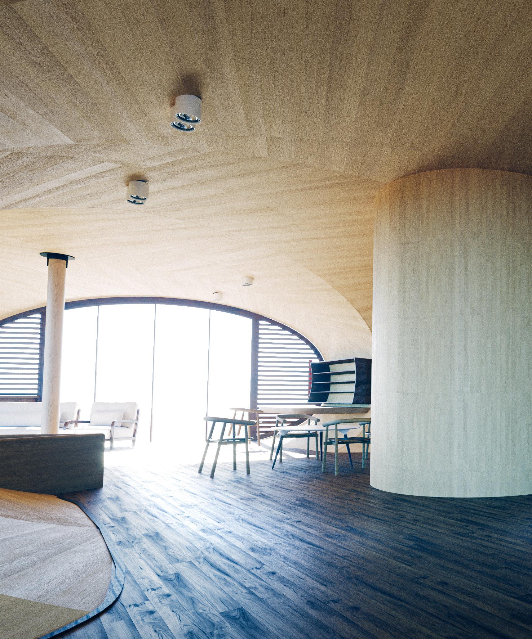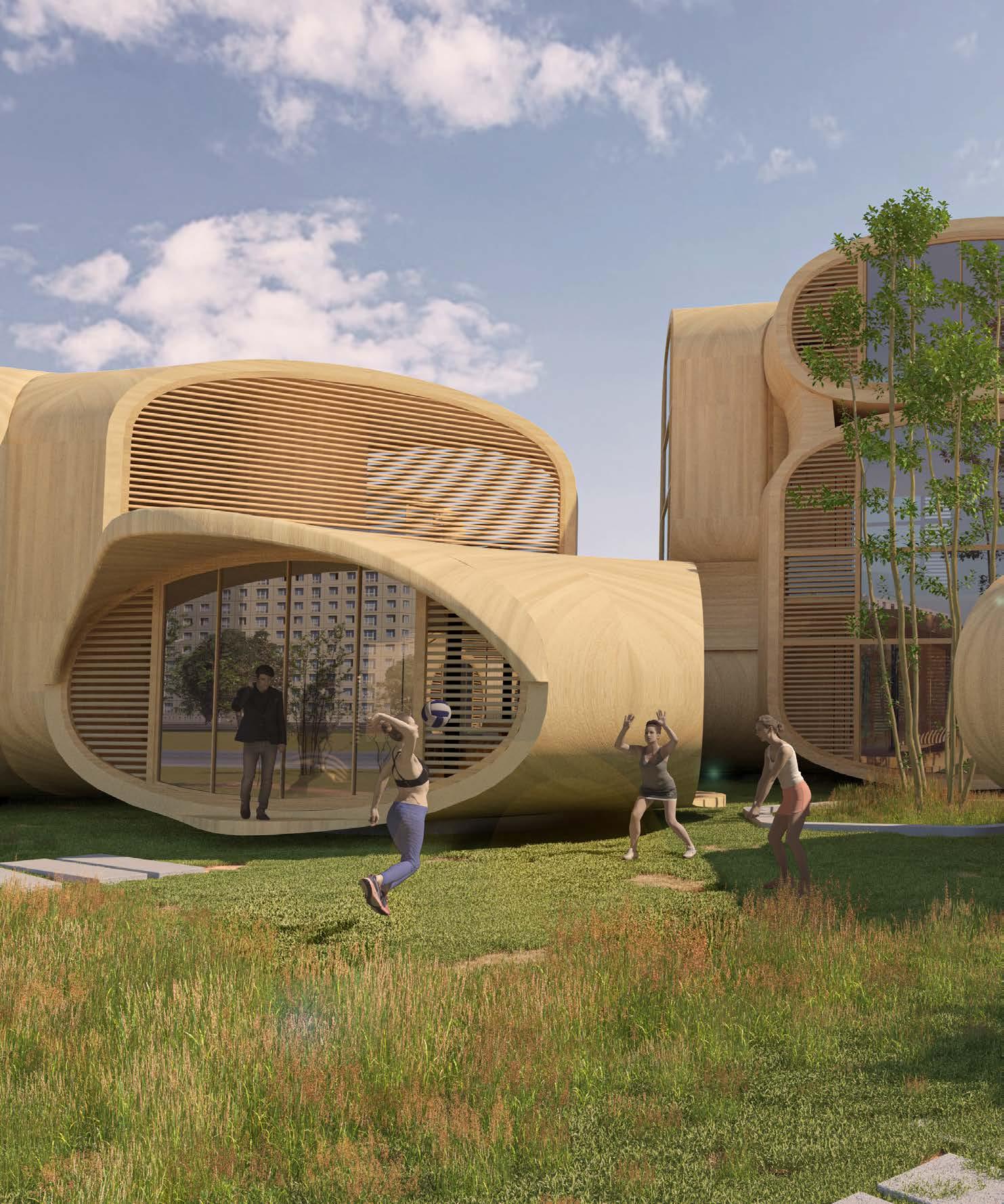 The material system is then evaluated for its structural performance and how it can be fabricated and implemented at the building scale. The material system is integrated into the design of modular housing units, the design explores the various range of curved timber panels that can be achieved and articulated into interesting morphologies. A comprehensive structural analysis indicates the suitability of the curved panels to be used as various load-bearing elements within the building system. Further geometric studies investigate how the curved timber modules can be aggregated to define well-connected spaces while emphasizing the structural logic