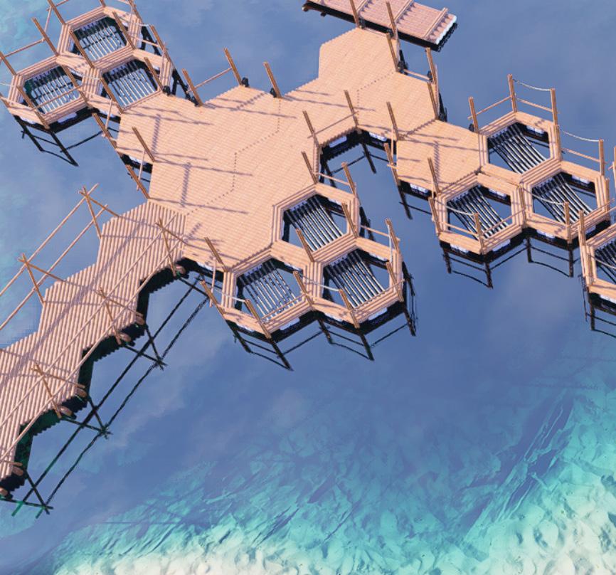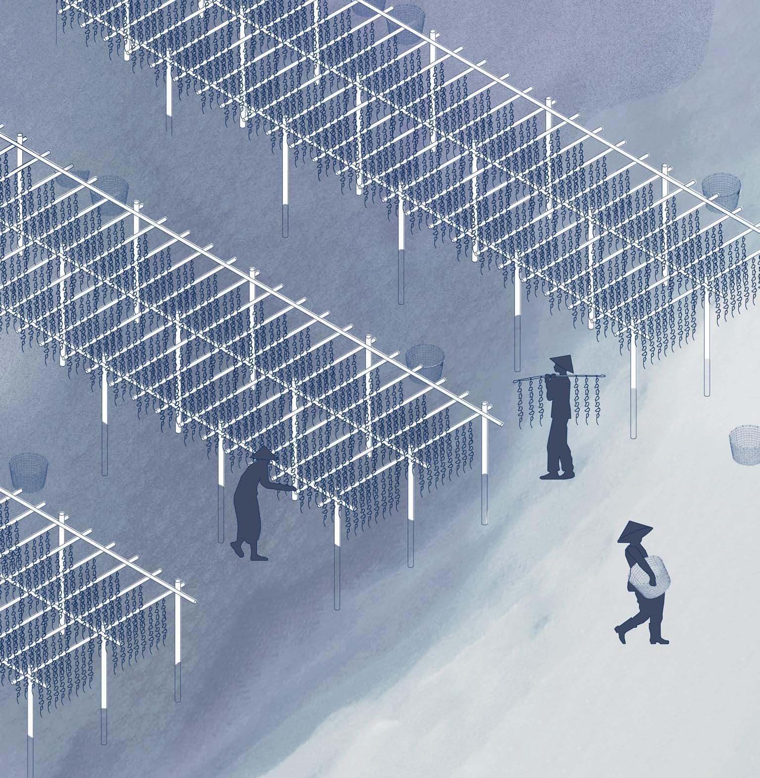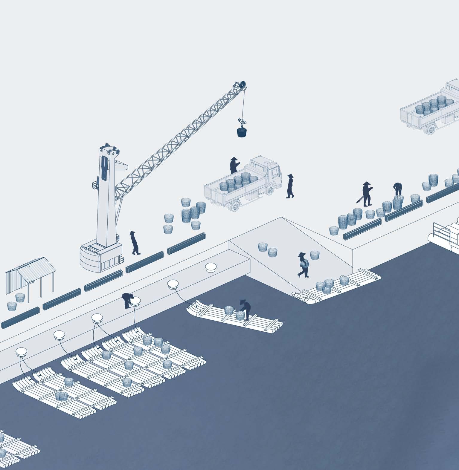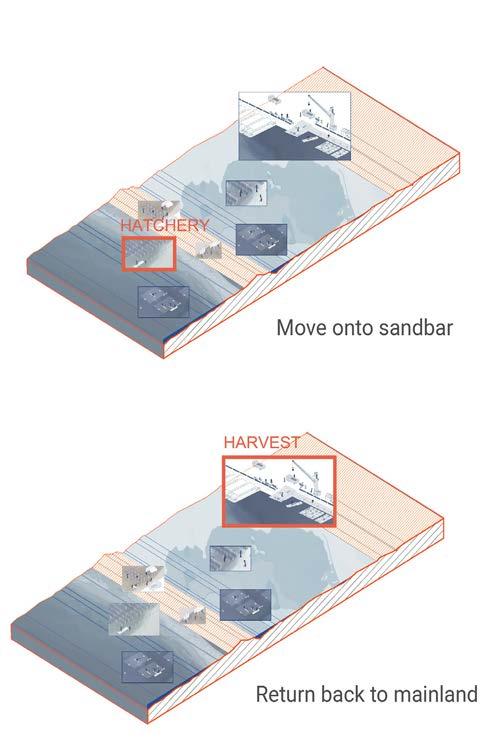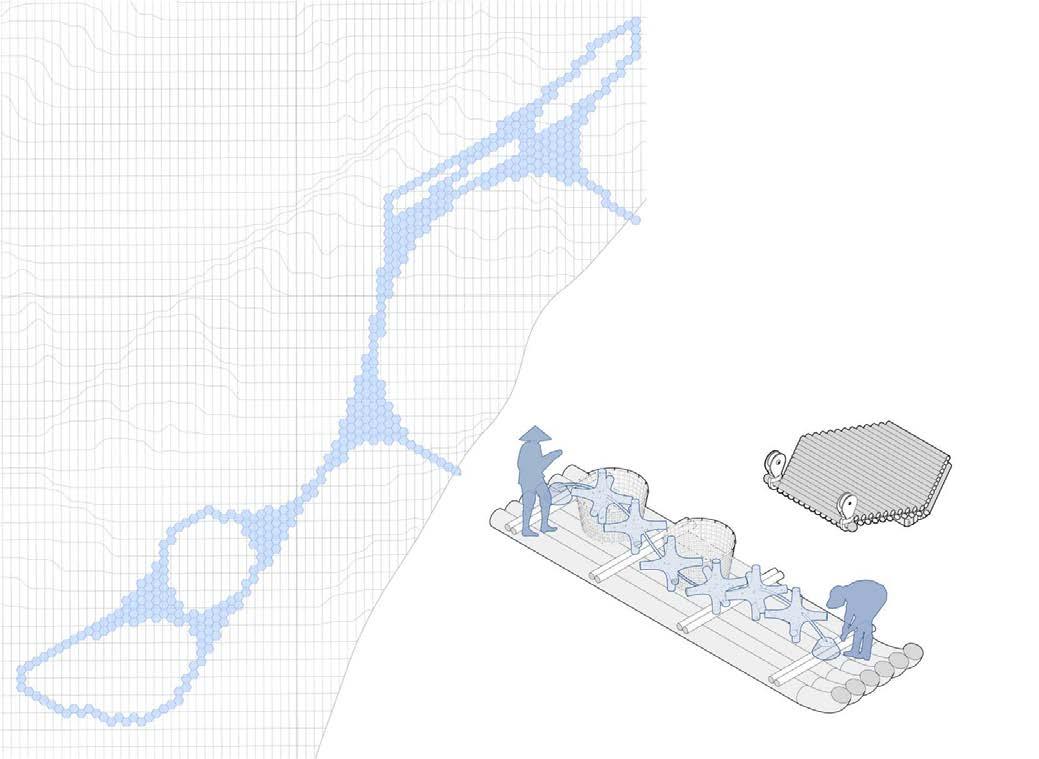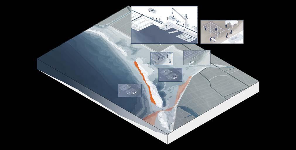 land-scouring. This is coupled with machine-learned, fluid-dynamics-informed simulations to test targeted underwater-erosion modules, introducing a performative infrastructural system that recalibrates underwater depths while supporting aquaculture, access and movement above water. A reconfigurable architectural spine emerges as both an ecological regulator and a social framework for work and seasonal use, dynamically adapting to varying requirements across the farming cycles, typhoon seasons and eco-tourism peaks, allowing spatial layouts to follow shifting depths.