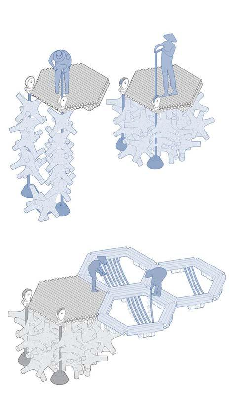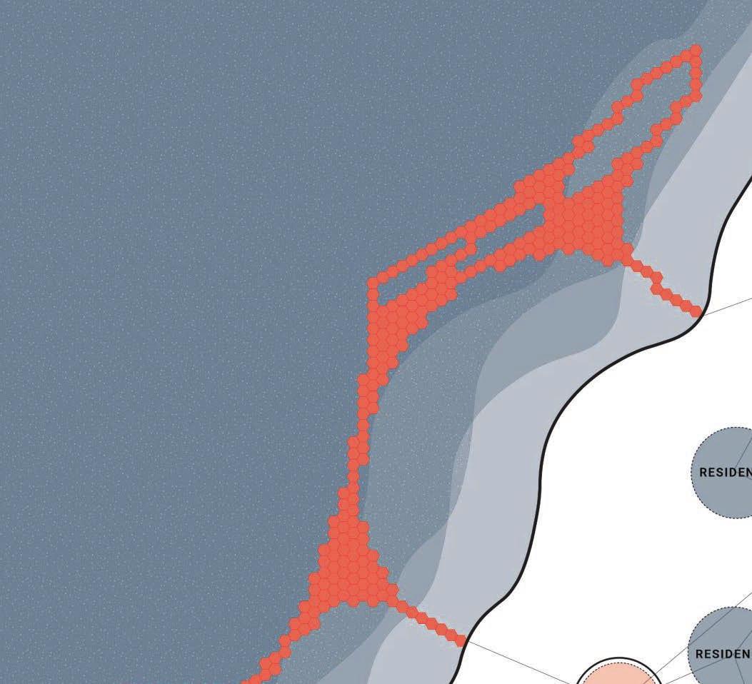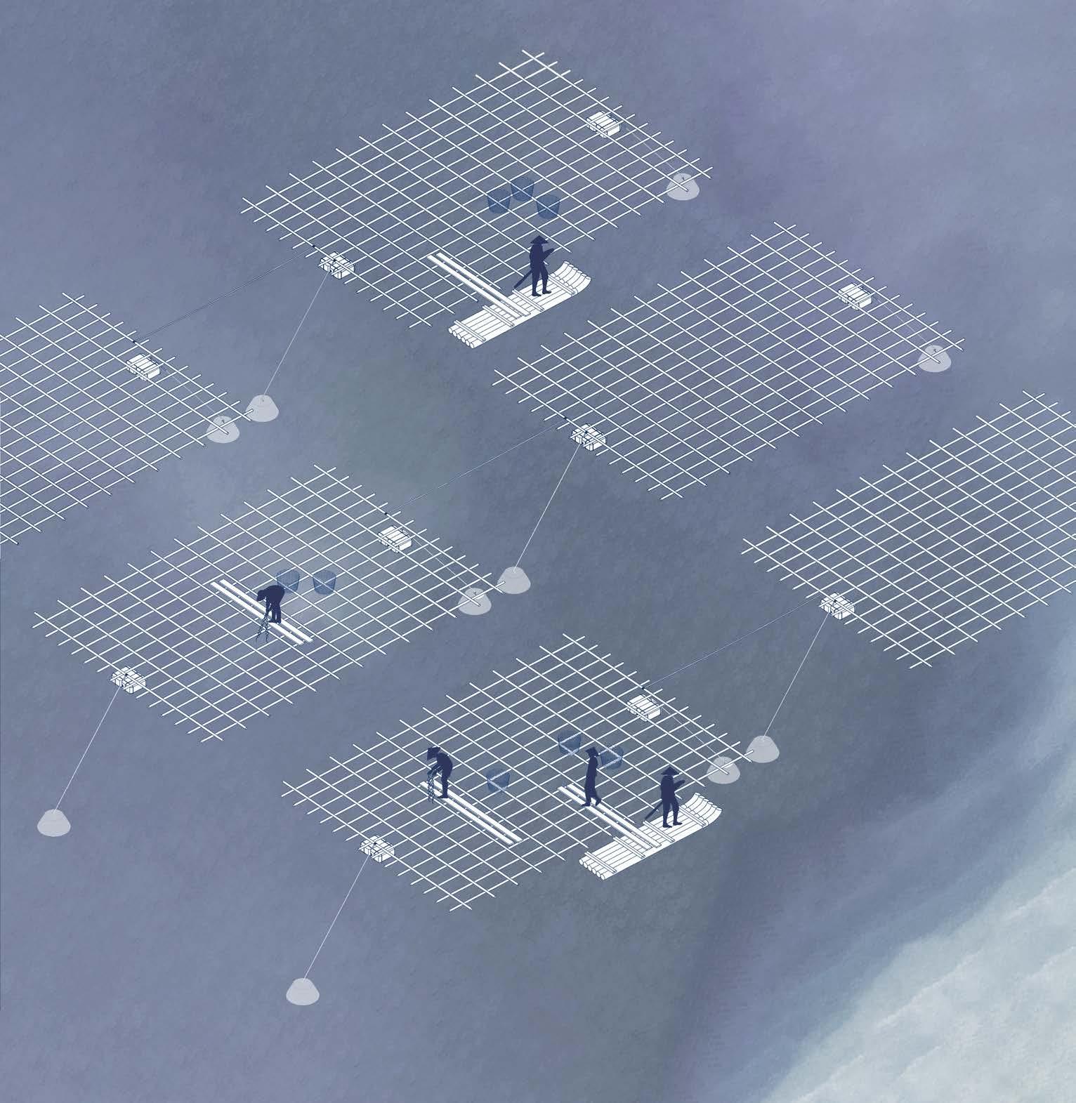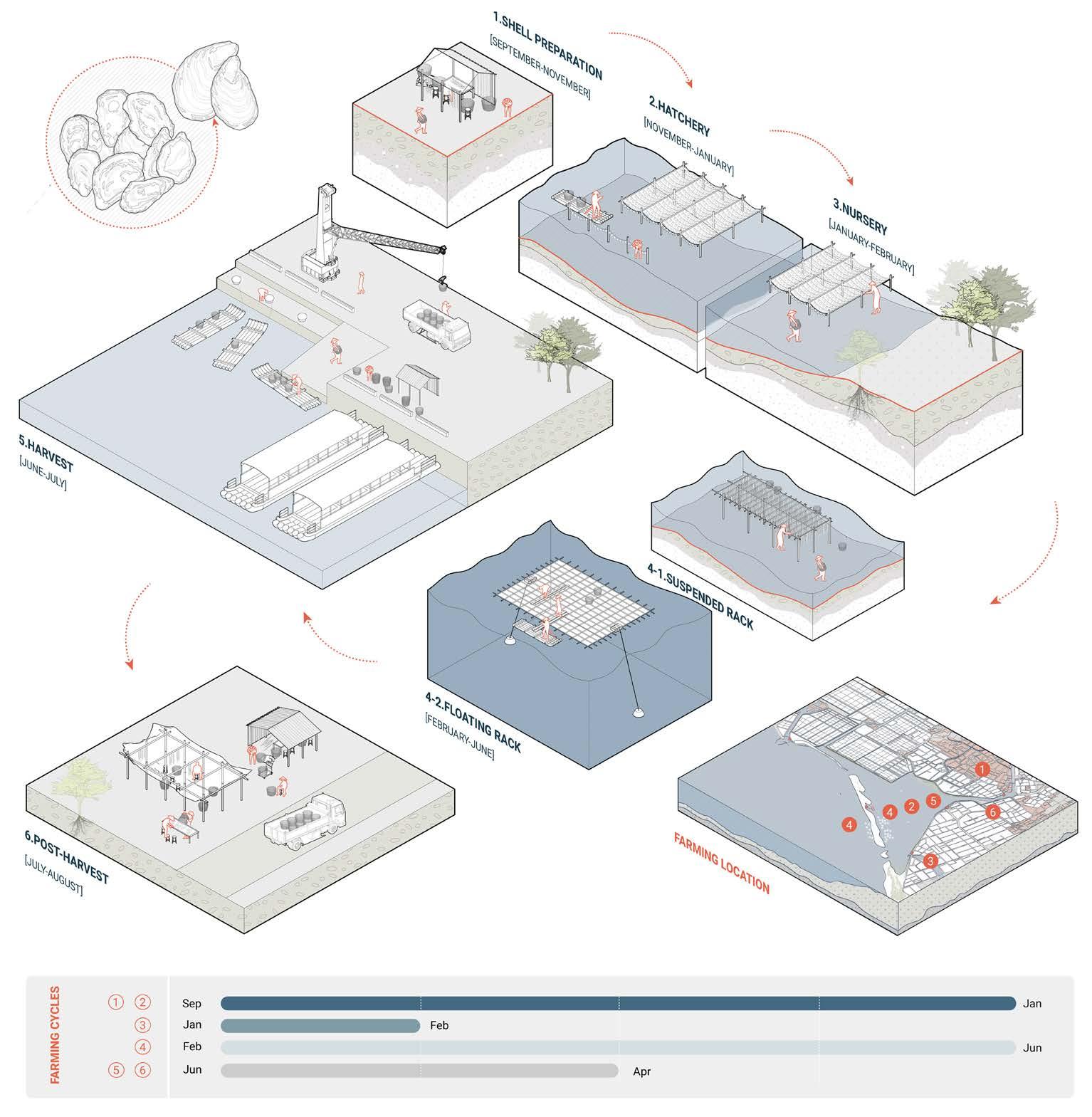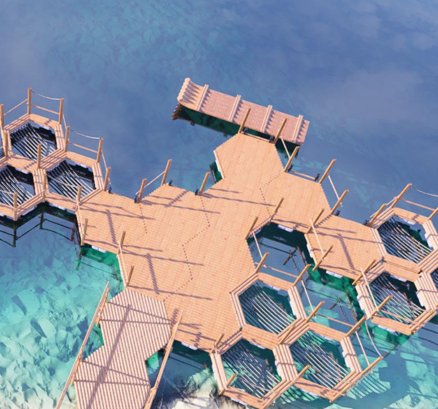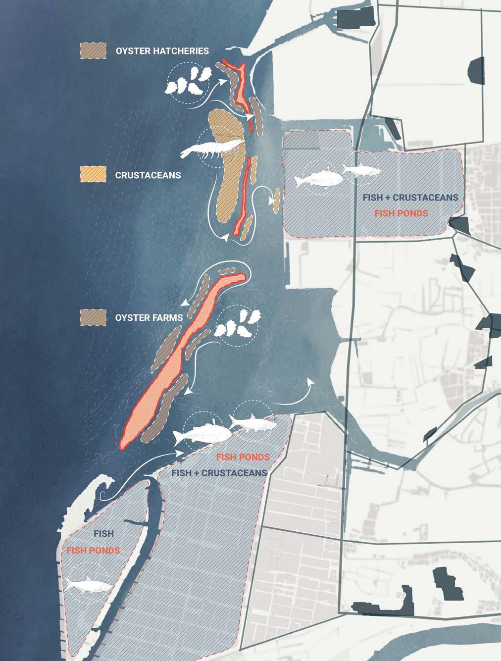 land-scouring. This is coupled with machine-learned, fluid-dynamics-informed simulations to test targeted underwater-erosion modules, introducing a performative infrastructural system that recalibrates underwater depths while supporting aquaculture, access and movement above water. A reconfigurable architectural spine emerges as both an ecological regulator and a social framework for work and seasonal use, dynamically adapting to varying requirements across the farming cycles, typhoon seasons and eco-tourism peaks, allowing spatial layouts to follow shifting depths.