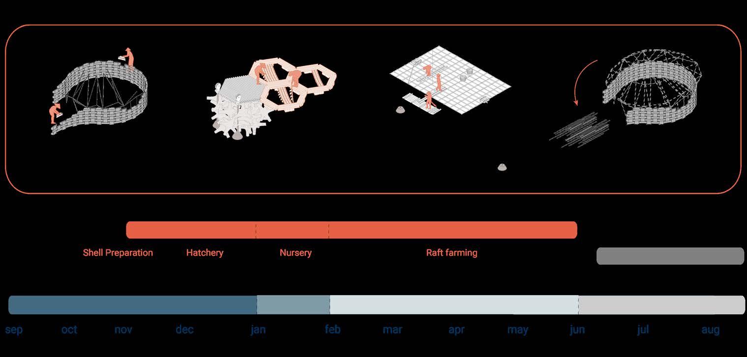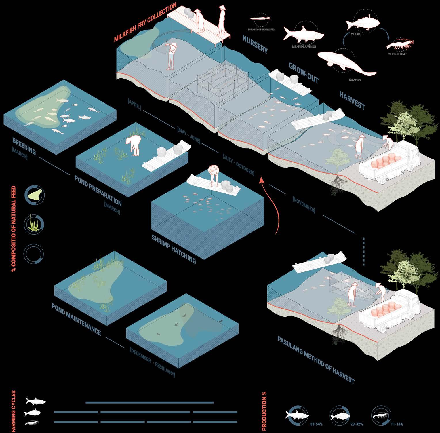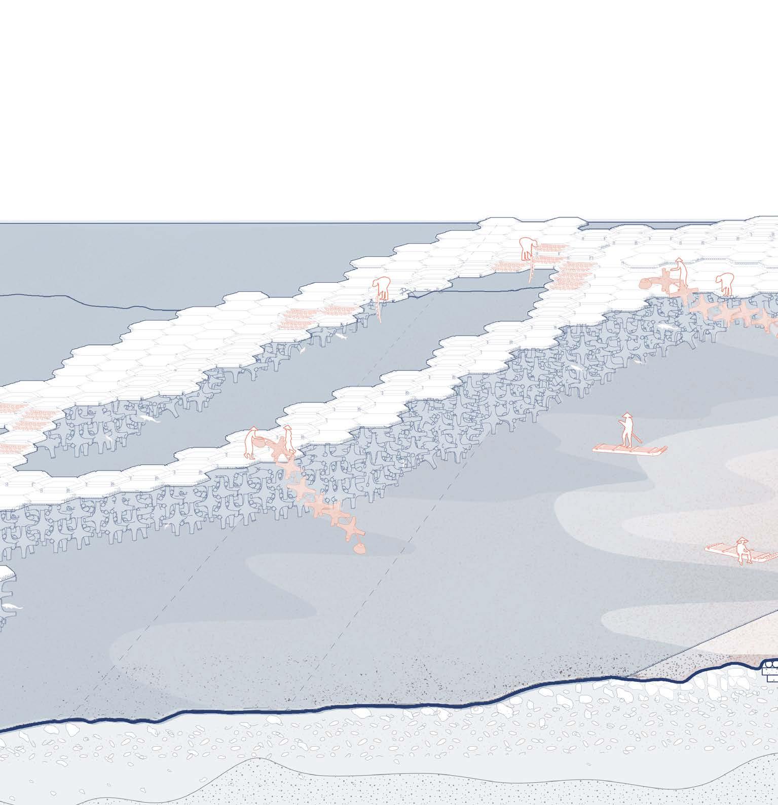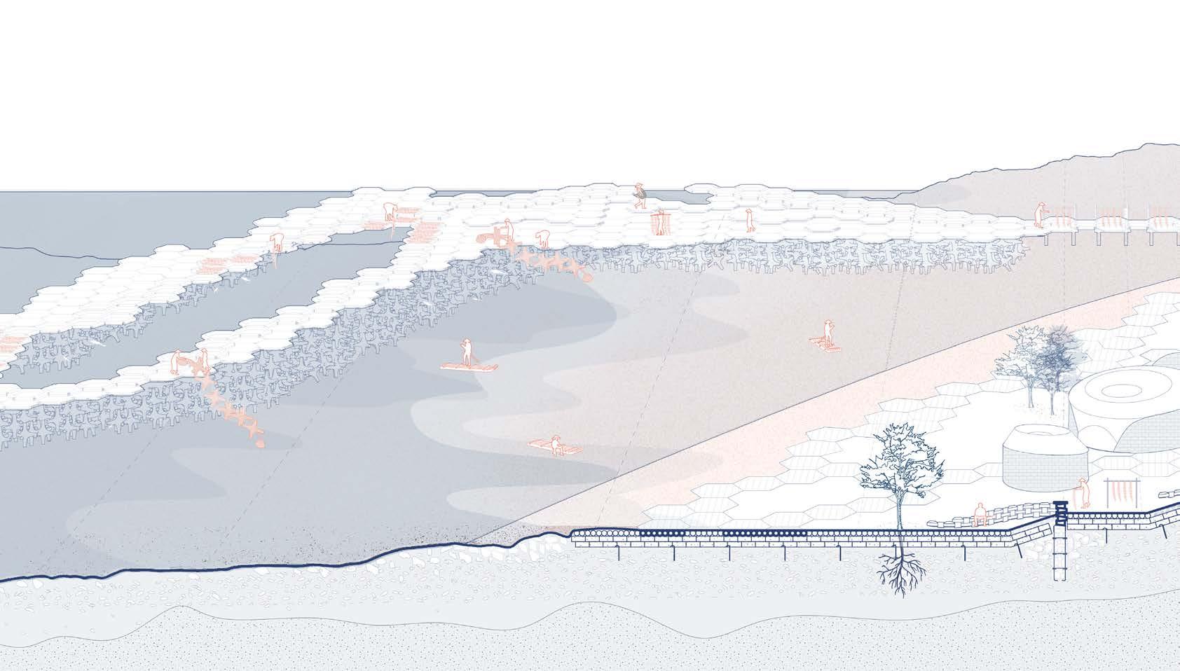 land-scouring. This is coupled with machine-learned, fluid-dynamics-informed simulations to test targeted underwater-erosion modules, introducing a performative infrastructural system that recalibrates underwater depths while supporting aquaculture, access and movement above water. A reconfigurable architectural spine emerges as both an ecological regulator and a social framework for work and seasonal use, dynamically adapting to varying requirements across the farming cycles, typhoon seasons and eco-tourism peaks, allowing spatial layouts to follow shifting depths.