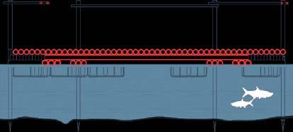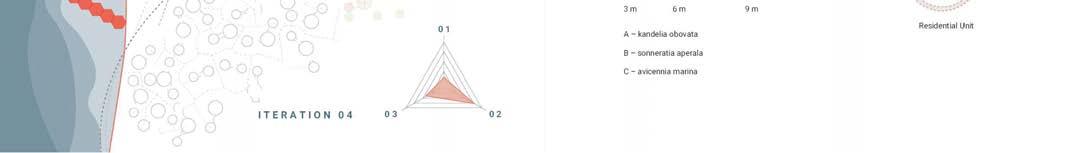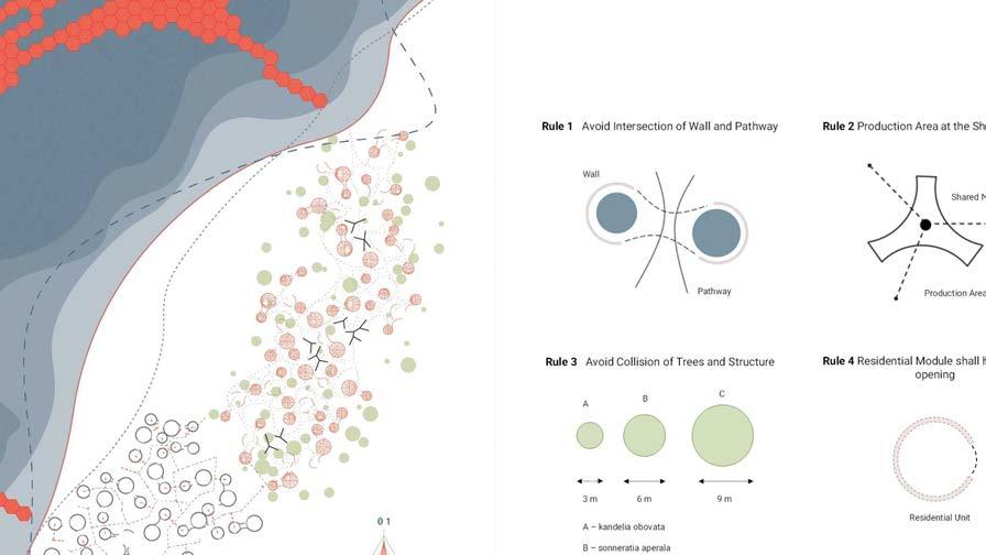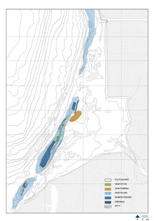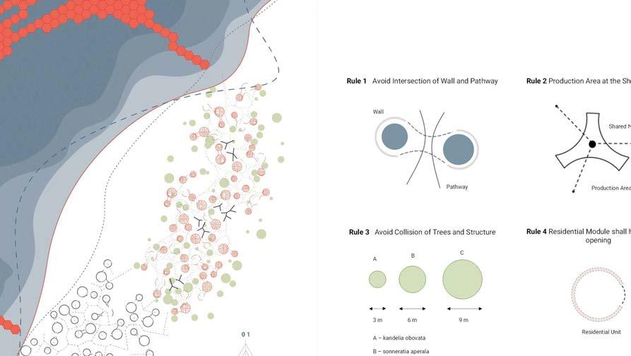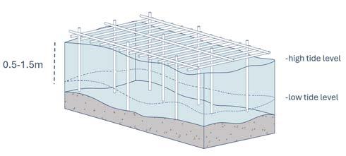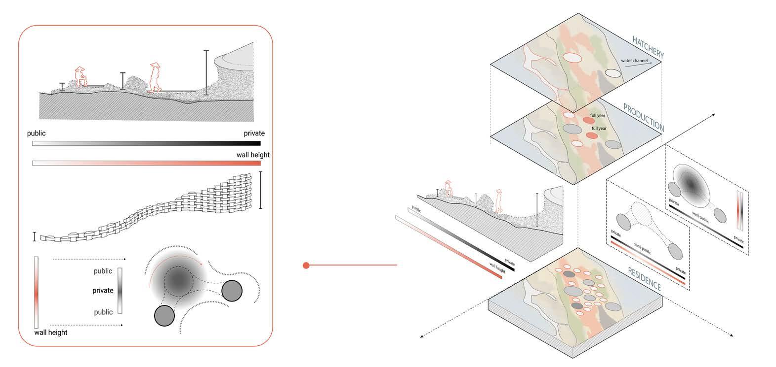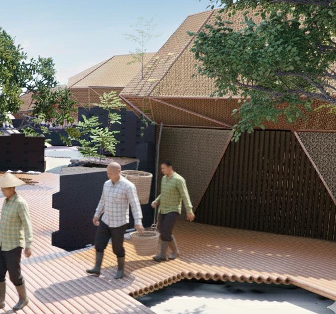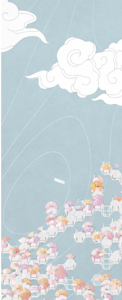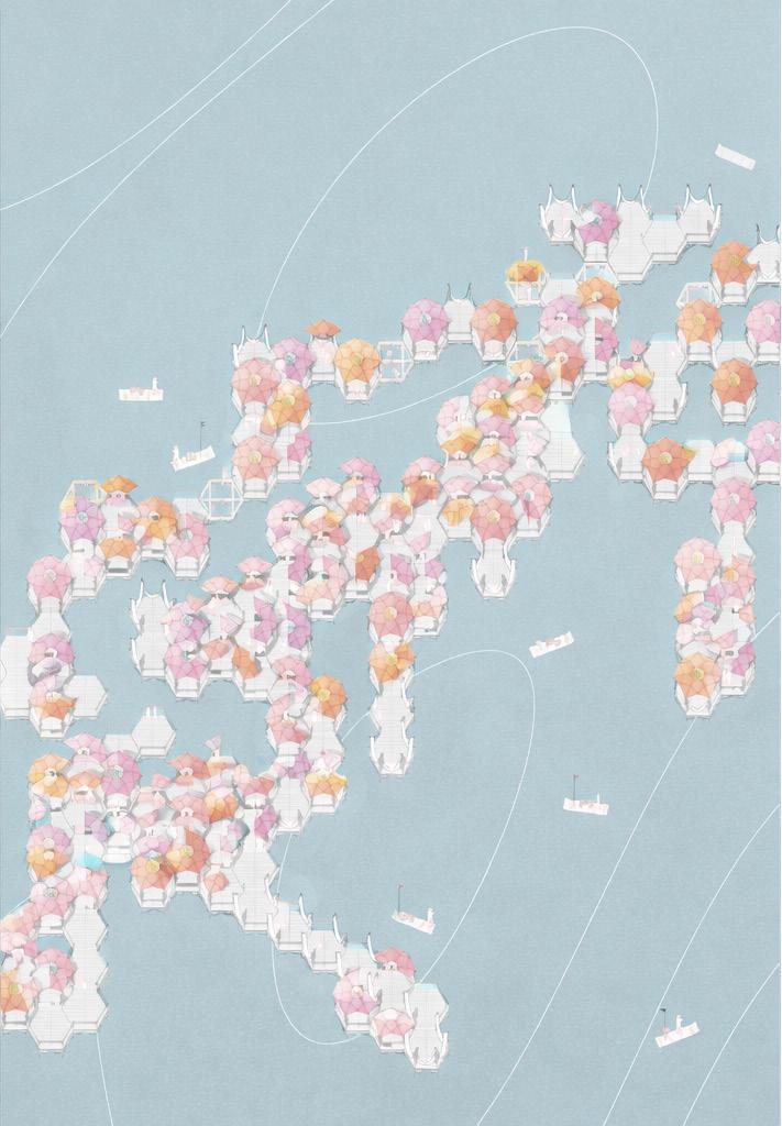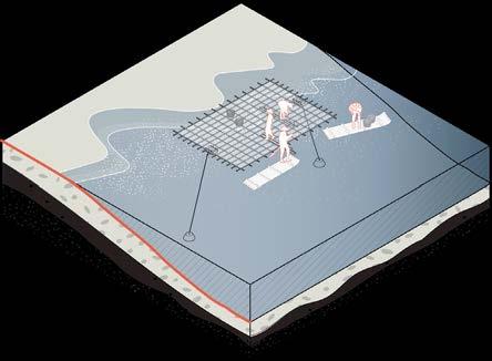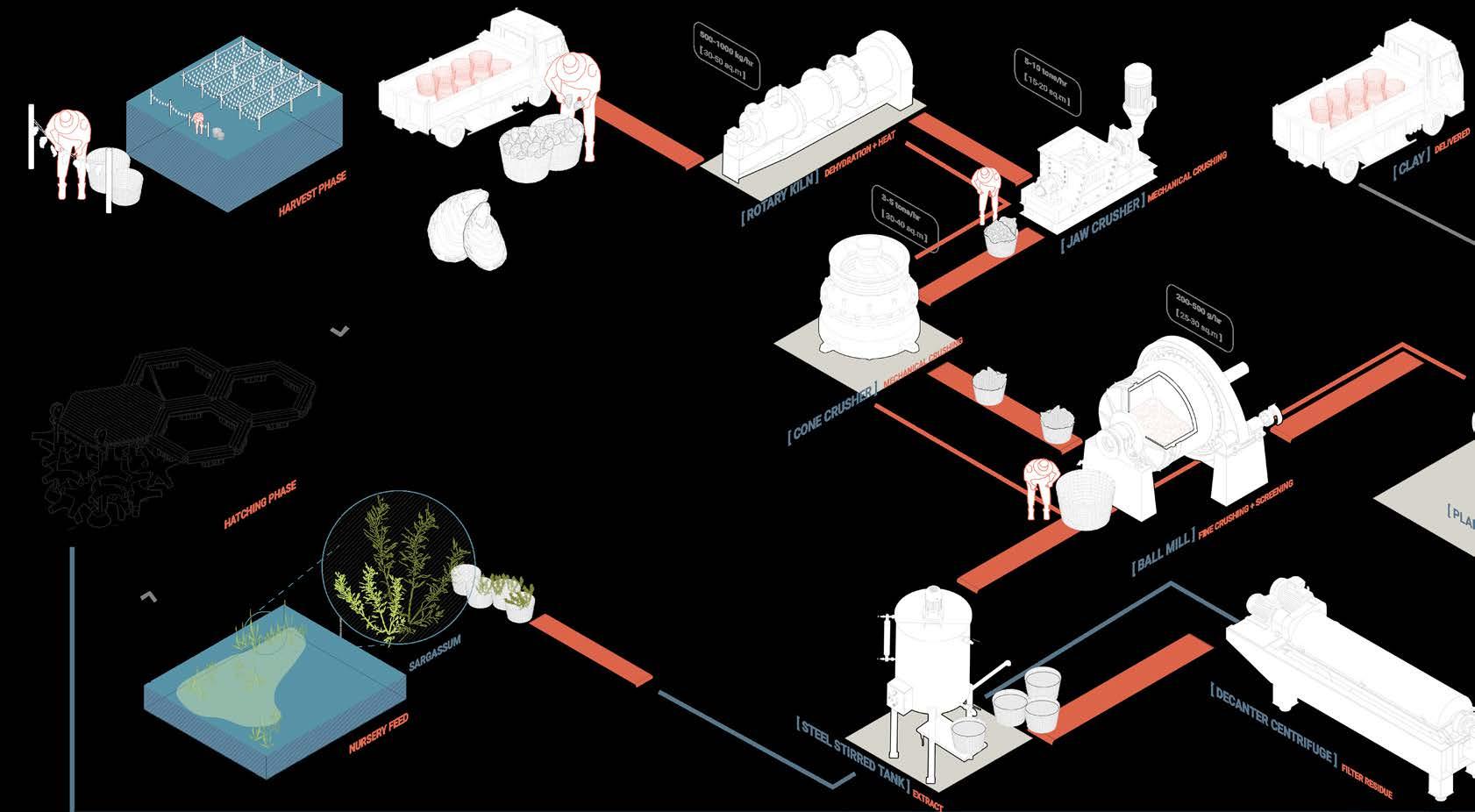 land-scouring. This is coupled with machine-learned, fluid-dynamics-informed simulations to test targeted underwater-erosion modules, introducing a performative infrastructural system that recalibrates underwater depths while supporting aquaculture, access and movement above water. A reconfigurable architectural spine emerges as both an ecological regulator and a social framework for work and seasonal use, dynamically adapting to varying requirements across the farming cycles, typhoon seasons and eco-tourism peaks, allowing spatial layouts to follow shifting depths.