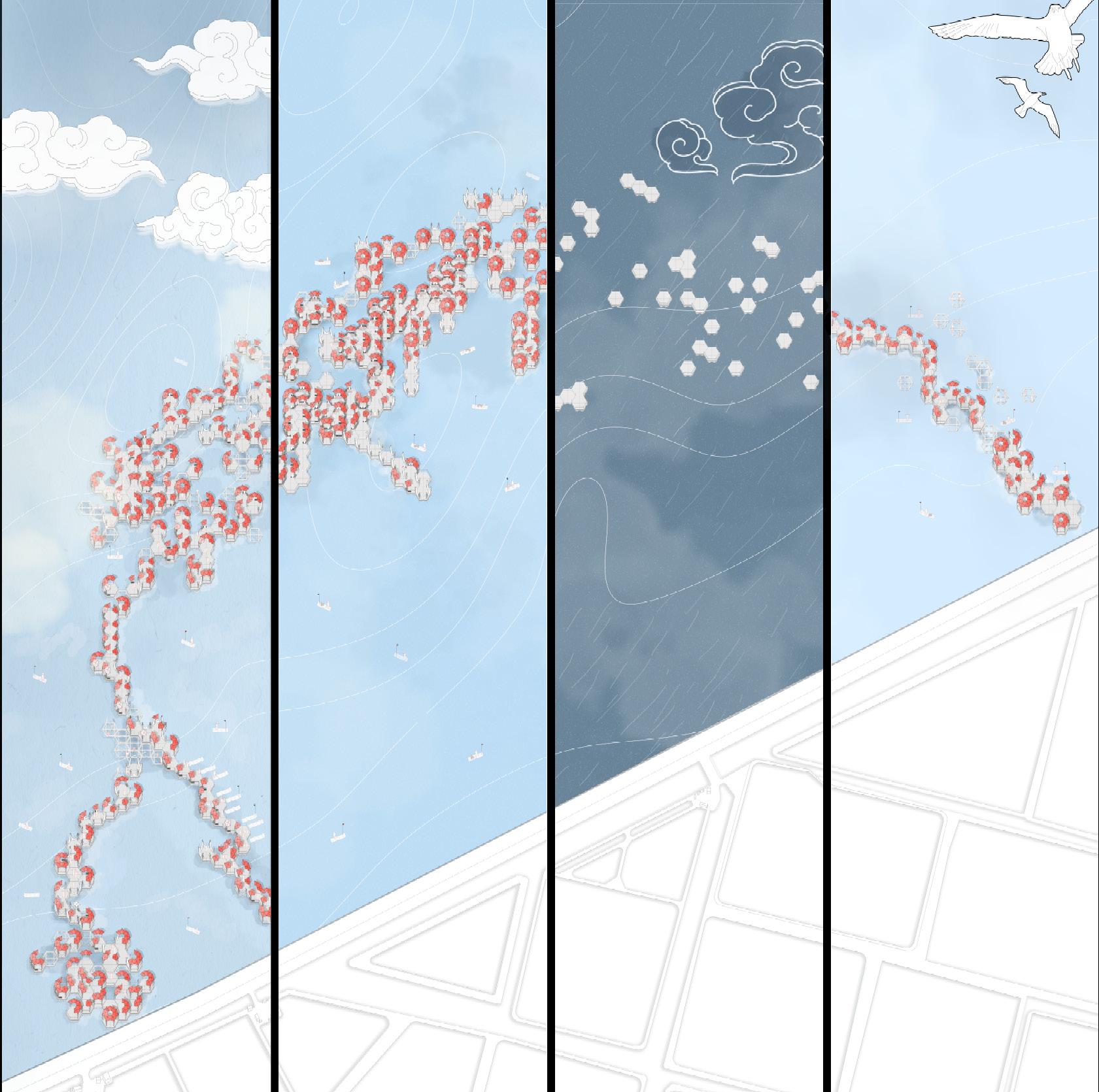 The performative infrastructure proposed for Qigu Lagoon operates at the intersection of ecological remediation and socio-economic support. Above water, the modular platforms and walkways respond directly to the lived realities of the lagoon’s users, particularly oyster farmers and fishers, while also accommodating seasonal tourism.