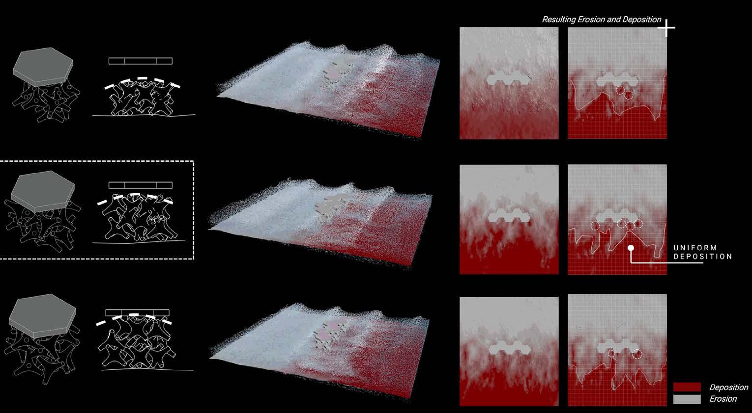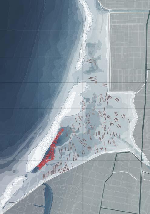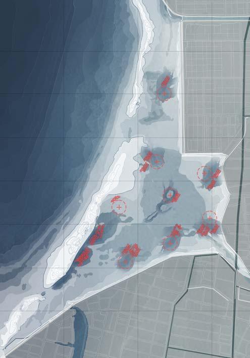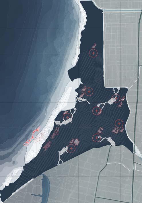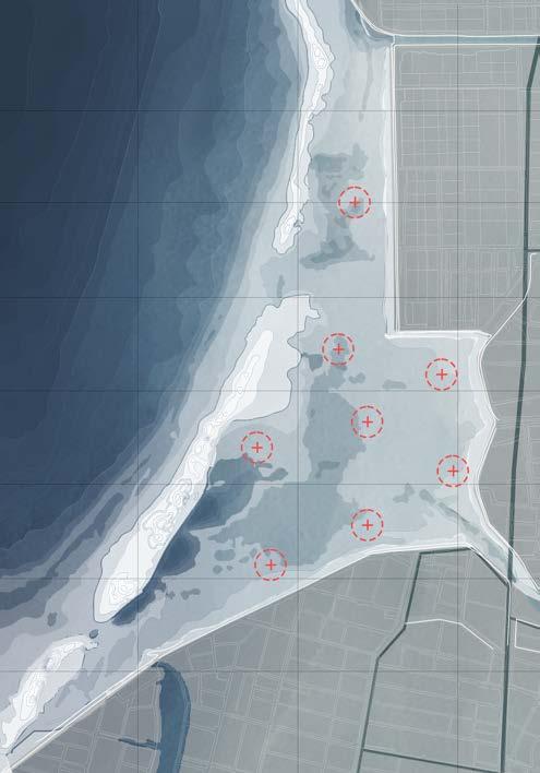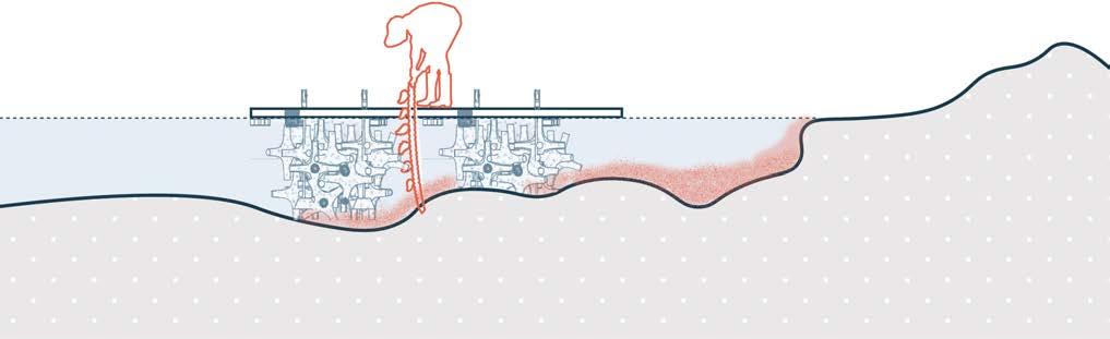 predictive tools for controlled scouring, combining bathymetric analysis with fluid-dynamics-informed simulations. Targeted underwater erosion modules and a reconfigurable architectural spine are developed to recalibrate lagoon depths while supporting movement, access, and seasonal occupation above water.