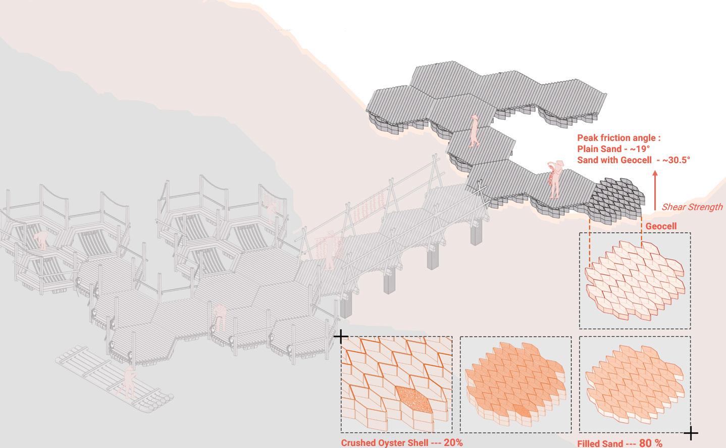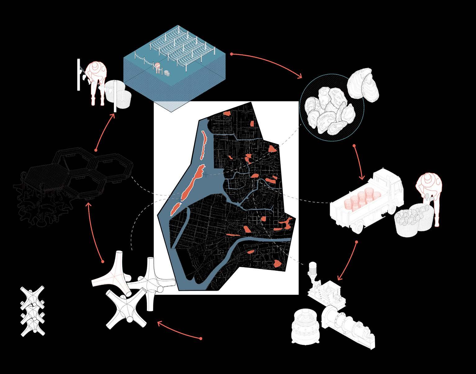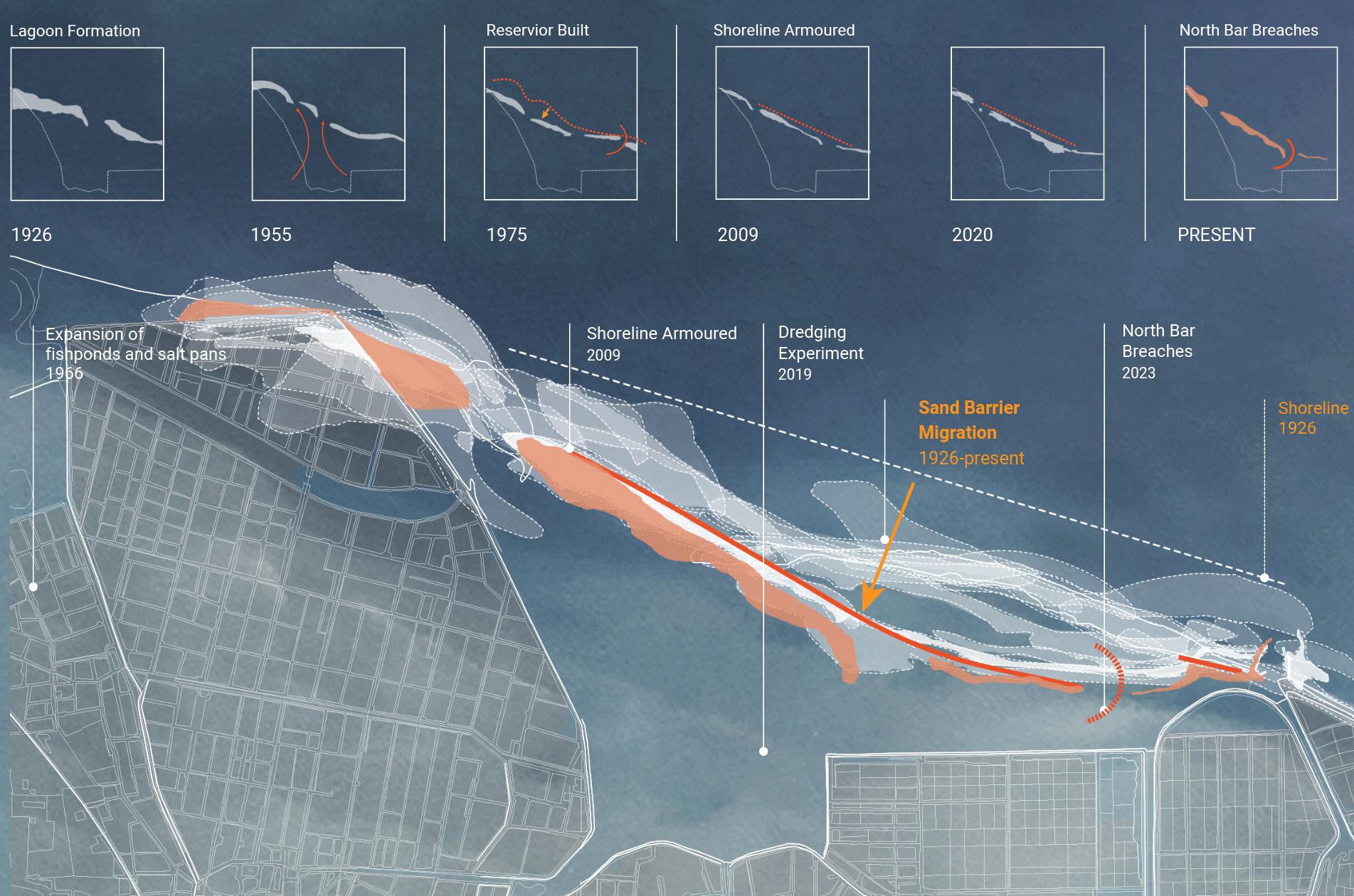 This research fundamentally inquires how coastal defence strategies and oyster farming can be integrated to protect the sandbar, rehabilitate the shallowing lagoon, and sustain its changing economy. The research is structured in two phases. The First Phase was developed along the eroding seaward edge of the sandbar and was organised around three research verticals: land-growing, material study, and spatial structure. Drawing on island accretion strategies, this phase developed sediment-deposition prediction models to support the organic regrowth of the depleting sandbar. Discarded oyster shells were processed into material systems to test sediment interaction and structural potential. Through the logic of topological interlocking, oyster-shell-based modules evolved into funicular shell systems and residential units that form a seasonal settlement for fisher people embedded within the regenerated sandbar.