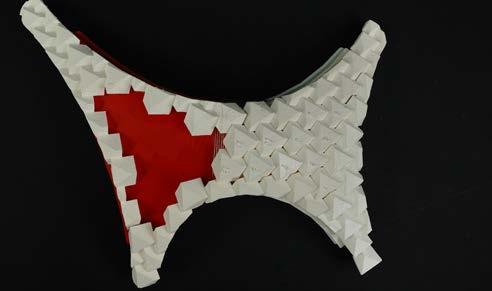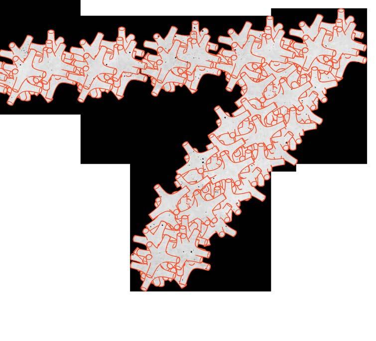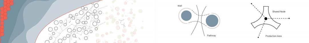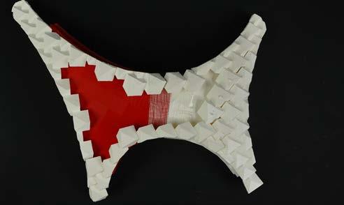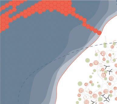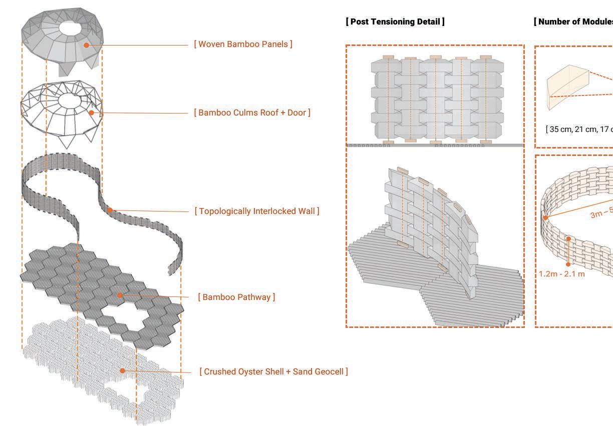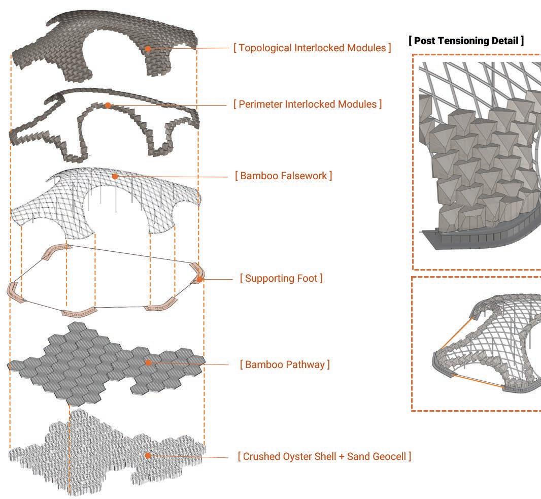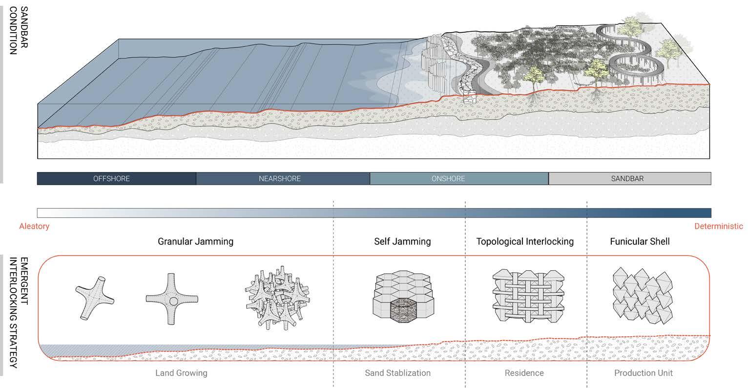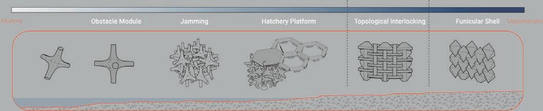 The oyster shell becomes the primary architectural and material starting point in this phase. By crushing, recombining, and casting discarded shells into modular units, the research explores how material behaviour can shift across conditions. Offshore, shellbased modules operate through aggregation and jamming, redirecting sediment deposition. Onshore, the same modules transition into deterministic systems of topological interlocking, forming stable funicular shells, platforms, and residential units embedded within the regenerated landform. This continuum—from loose aggregation to controlled assembly—frames a second, material-driven hypothesis: that emergent interlocking systems can adapt across different lagoon zones while remaining materially and ecologically grounded.
