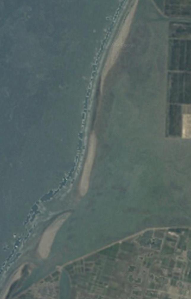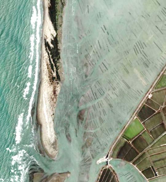 The Qigu Lagoon is protected by the last of seven remaining sandbars along Taiwan’s southern coast. Once about 150 km², now its area has shrunk to 15 km². Rising sea levels are eroding sandbars, pushing them deeper into an already shrinking lagoon. The sediment flows into the lagoon from the adjacent Zengwun River. The lagoon is vital to sustaining local aquaculture and oyster farming, forming the backbone of the region’s economy. Government interventions have largely focused on the edge, trying to reinforce the sand barrier.