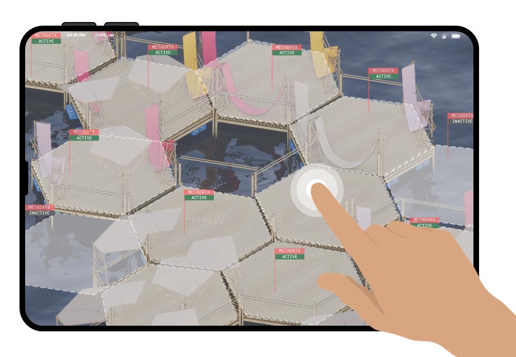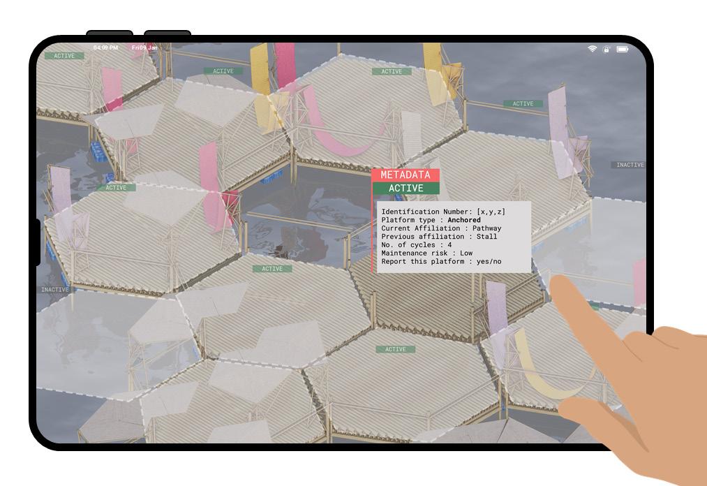 The proposed digital platform would consolidate multiple layers of information, including lagoon bed bathymetry, velocity and depth data, intervention zones and the real-time locations and states of platform modules, also known as the ‘Metadata’. Seasonal configurations and transition schedules would be visualised to allow fisher people to anticipate changes in access, navigation routes and available infrastructure.