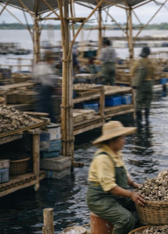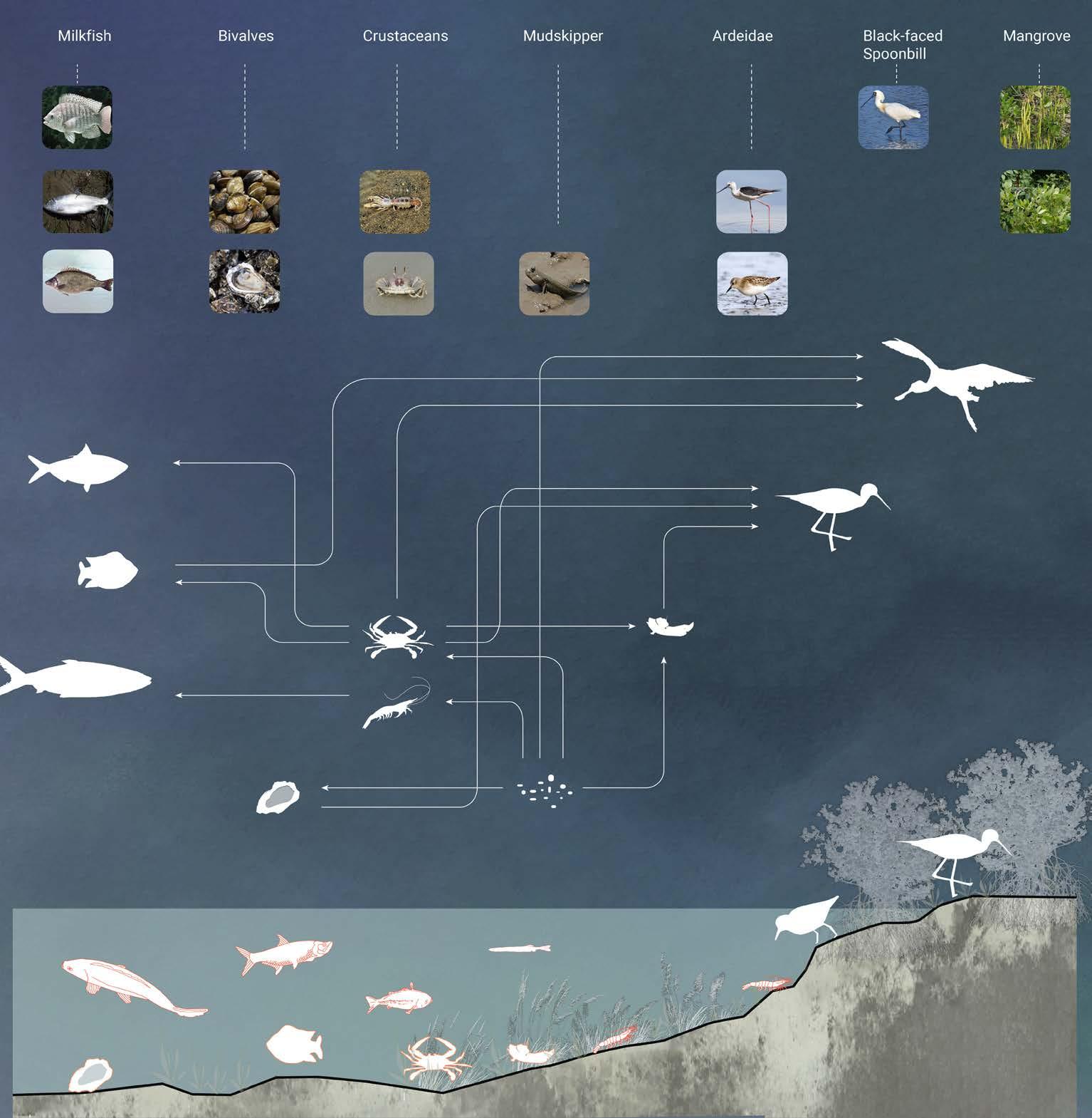 Species such as milkfish, sea bass, oysters, clams, mudskippers, and prawns coexist within this system, while benthic polychaetes and microalgae provide essential food for filter-feeders.