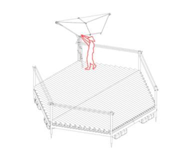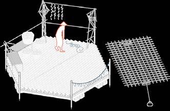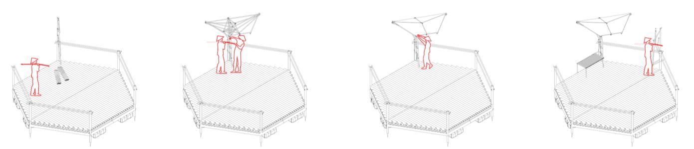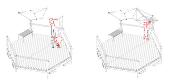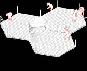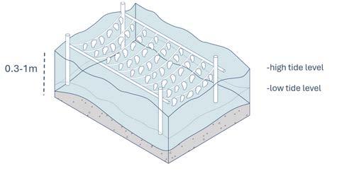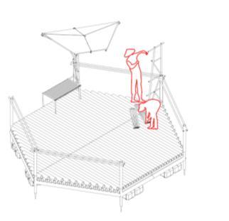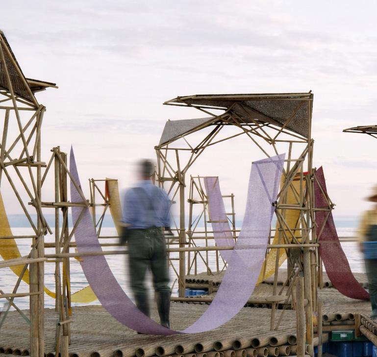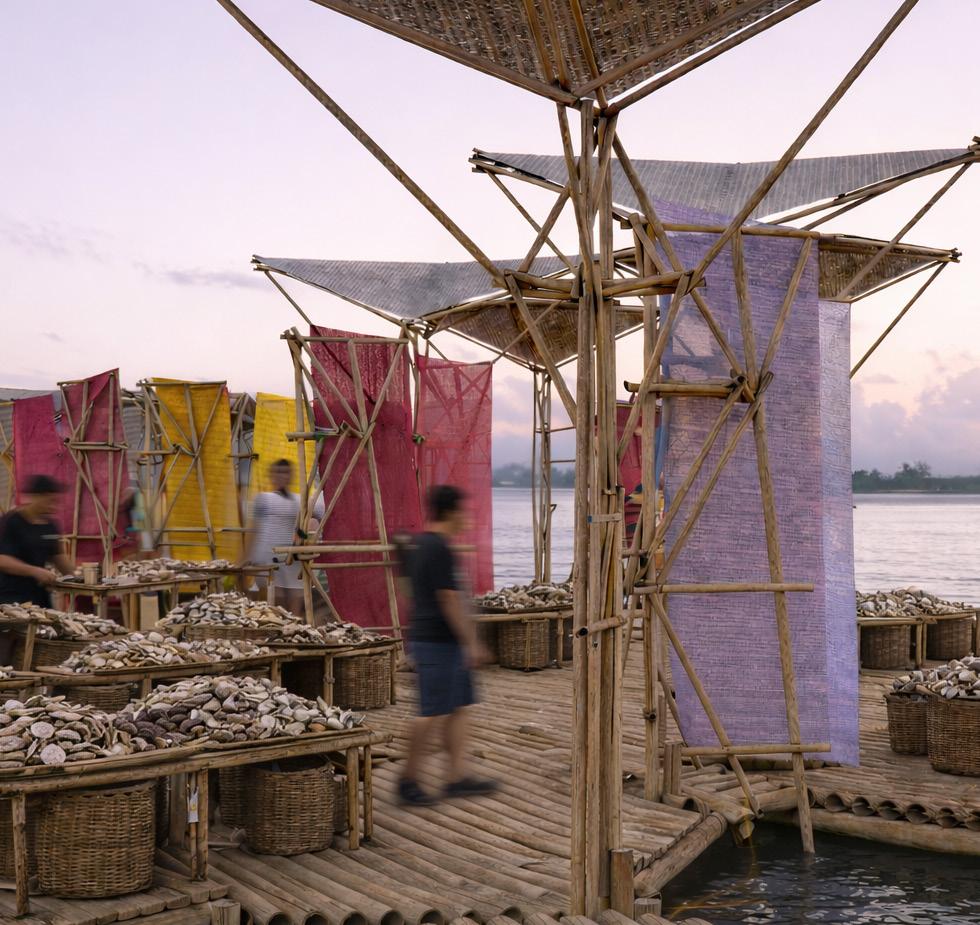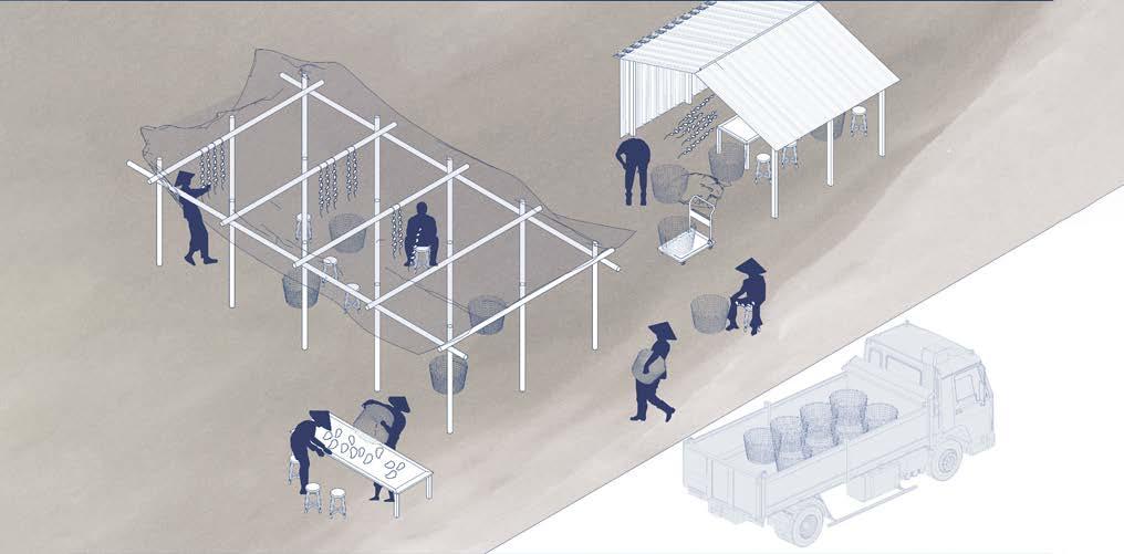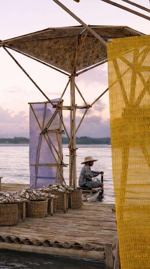 The infrastructure’s mobility and modularity allow spatial configurations to shift across farming cycles, responding to changes in labour intensity, tidal regimes, and seasonal use. In this sense, the system performs socially as well as environmentally, enabling fisher people to sell produce closer to harvesting zones, reducing travel distances and creating informal points of rest and exchange. For visitors, the infrastructure offers an alternative and ever-changing mode of engagement with the lagoon.