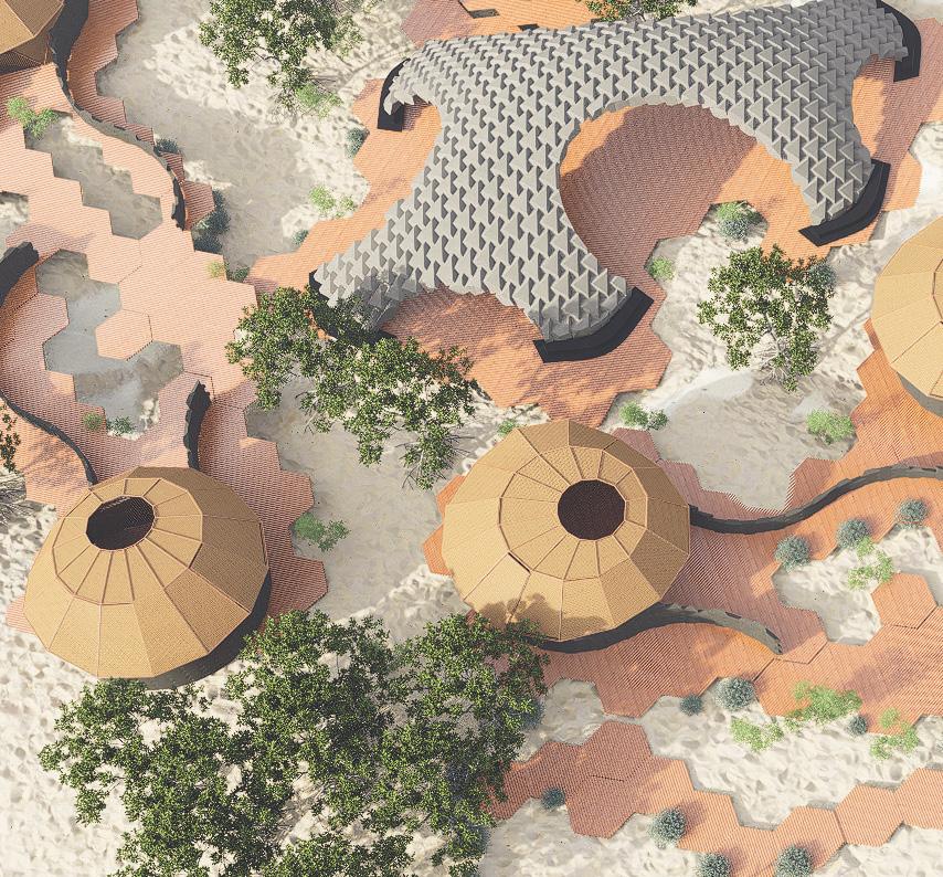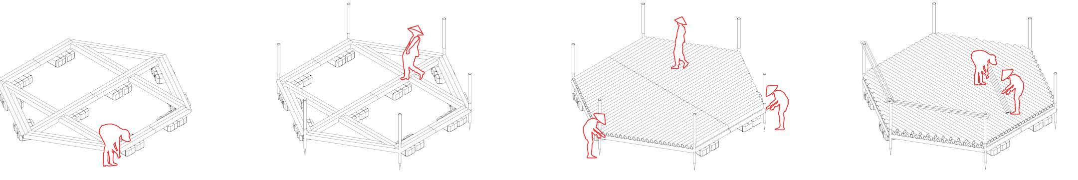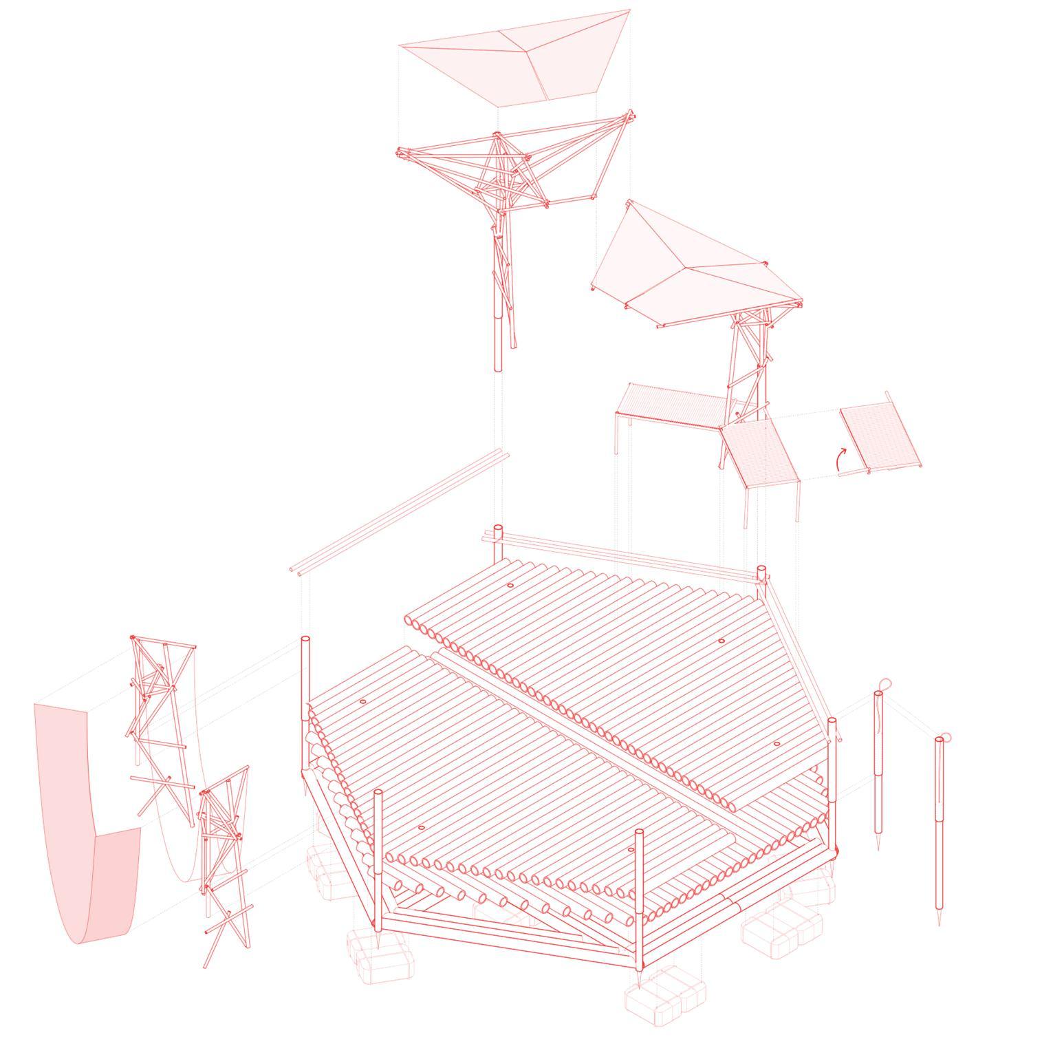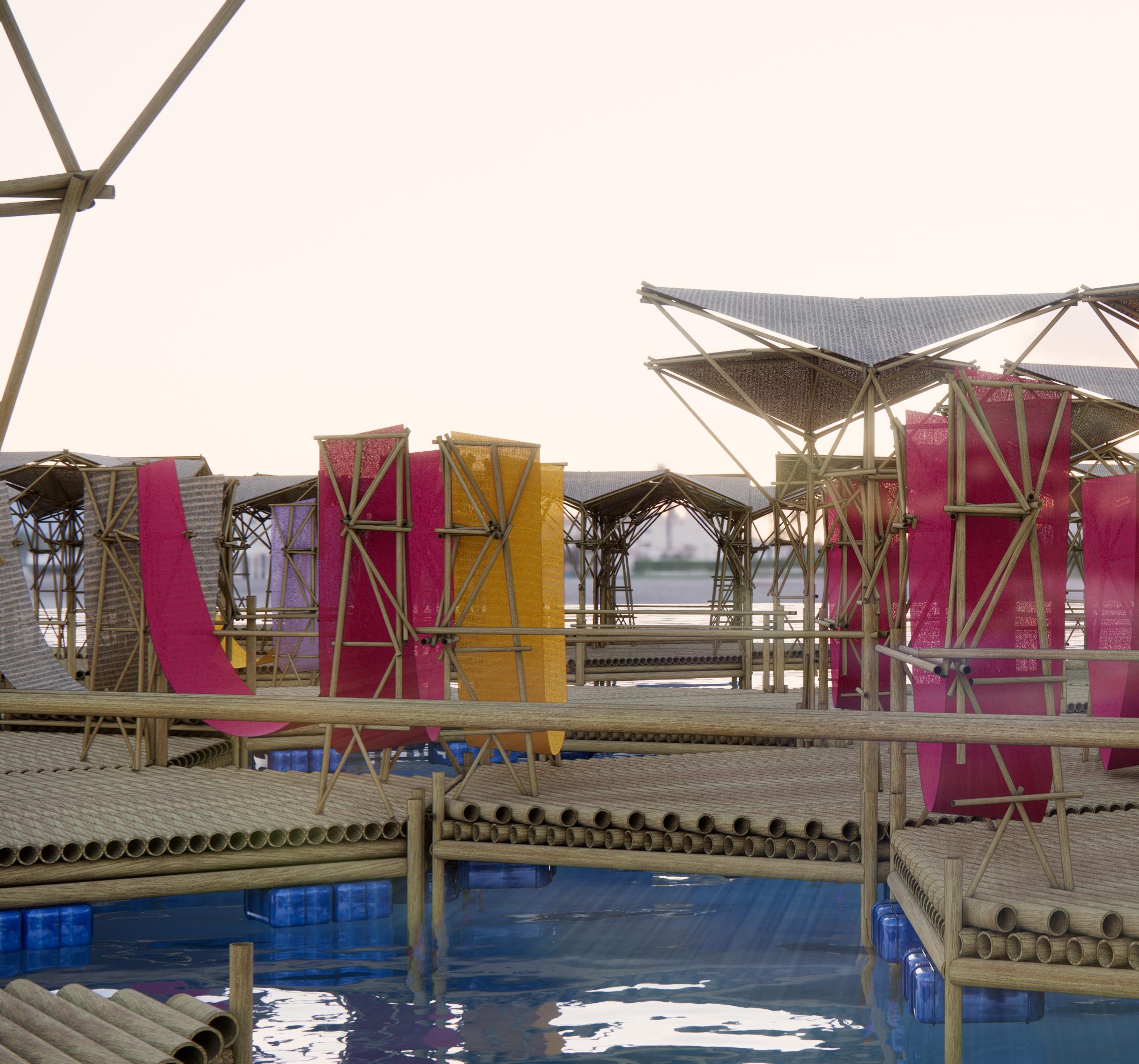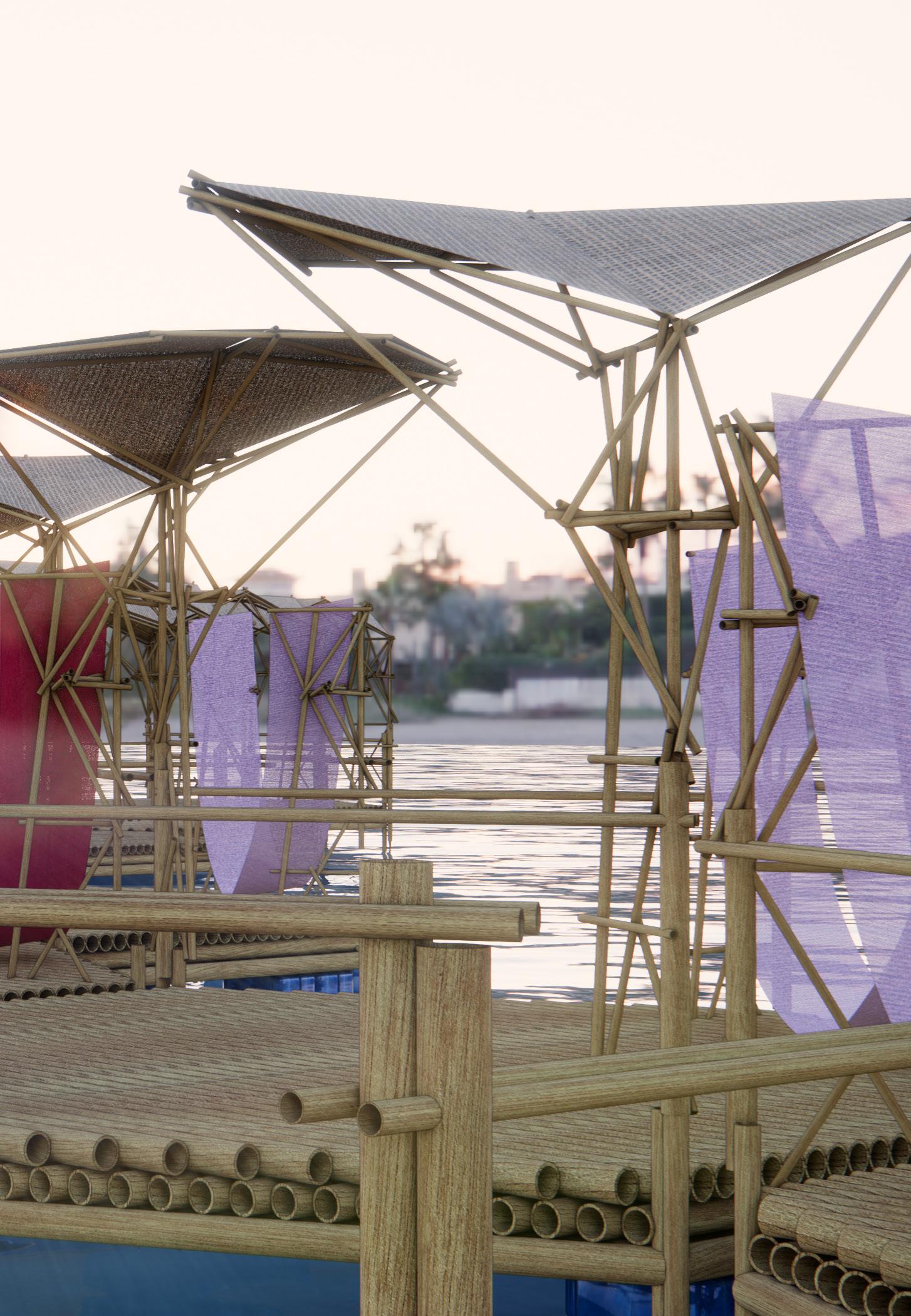 Material experimentation situates the project within the lagoon’s ecological and economic context by using locally available resources. This material logic supports reuse and incremental transformation over time while foregrounding questions of targeted performance and lifespan. Architectural performance is therefore understood as extending beyond construction into ongoing processes of care and adaptation.