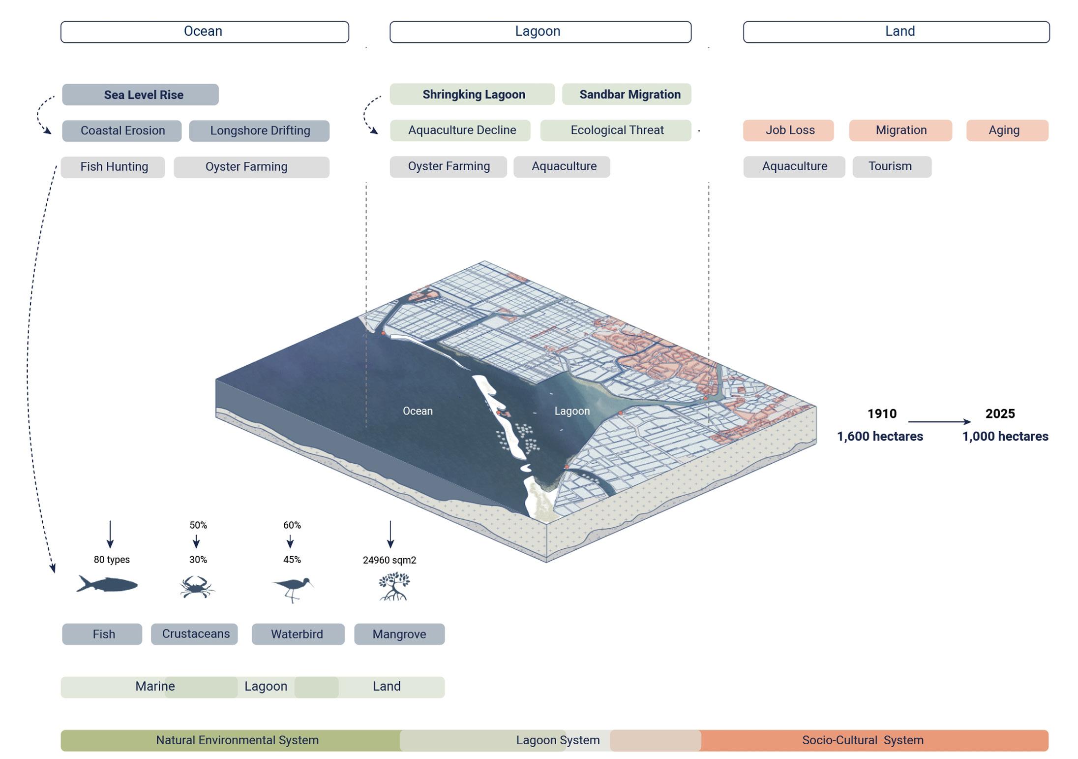 Coastal lagoons are among the most dynamic yet fragile landscapes, constantly reshaped by the interplay between natural processes and human interventions. In recent decades, global sea-level rise has intensified the vulnerability of lagoon–barrier systems, accelerating sedimentation, salinity shifts, and ecological instability. Qigu Lagoon in southwestern Taiwan presents a critical case: once part of the expansive Taijiang Inland Sea during the Dutch colonial period, it has gradually transformed into a complex socio-ecological system.