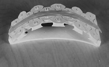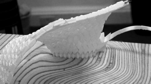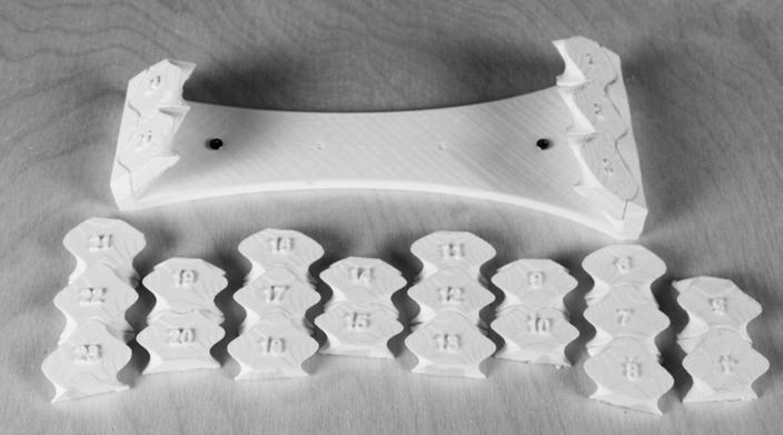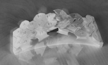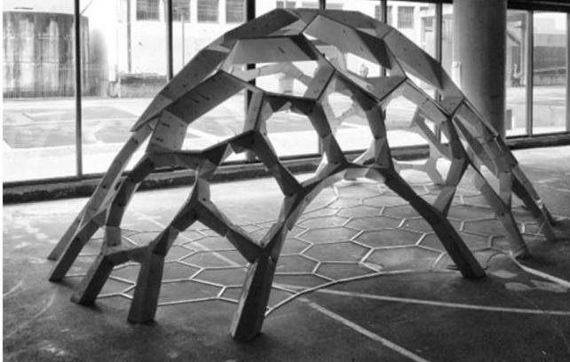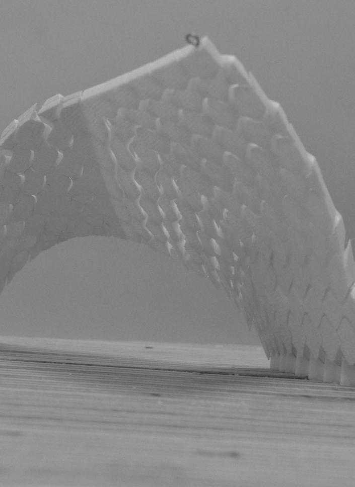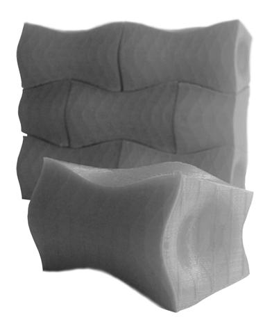 The physical model built of one of the shells informed much about the system’s behaviour and the limitations that can arise while constructing such a structure. As the bricks were 3D printed using PLA, the material tolerance was a major issue during fabrication. Also, the way the bricks were constructed digitally required more resolution to the output mesh than it was giving at that moment. The tweened surfaces that were created caused intersecting geometries, thus affecting the physical model. A detailed approach into the actual division of the surface needs to be carried out, in order to understand the optimum size and shape of the bricks. Moreover, this approach is highly top–down and possibly can be countered by studying a bottom–up approach, in which the end geometries are governed by the bricks’ limitations.