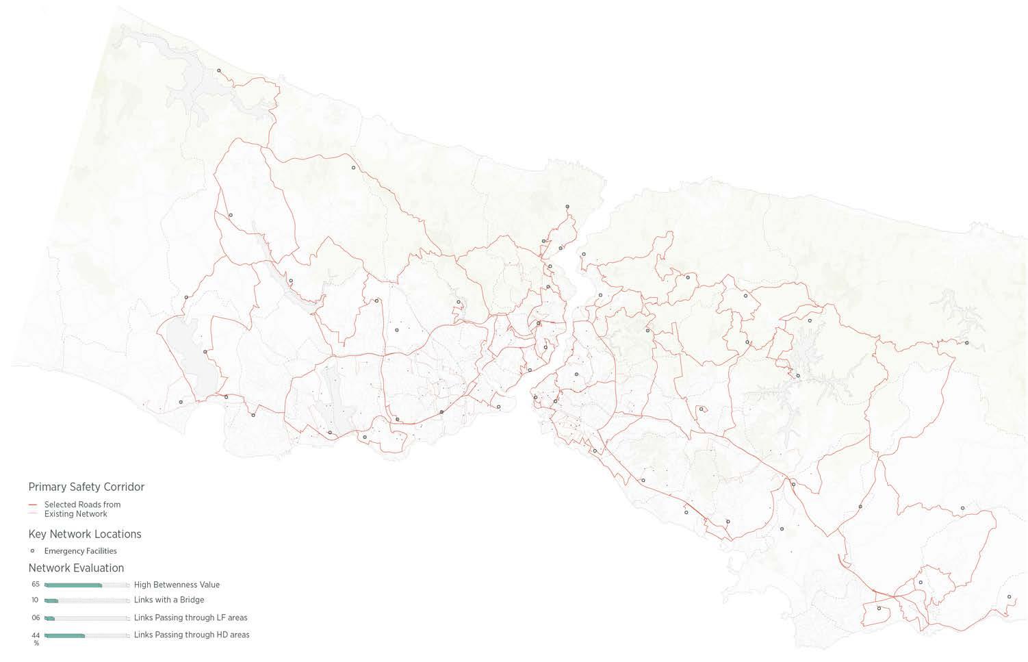 the flow of people to open spaces, but it also affects the distribution network for water, food supplies, and emergency aid. This dissertation will study Istanbul’s existing network through a series of network analyses to propose a safe evacuation plan that ensures clear paths to these open spaces. Within this emerged network, safe areas where people seek shelter (safe zones) will be identified across the city using evaluation criteria, such as population capacity, proximity to emergency facilities, and distance to hazardous points. Similarly, critical junctions within the same network that lead to the safe zones will be defined, while considering building height as a major factor. In order to ensure safe evacuation and shelter for people within the selected safe zones and evacuation network, the study will seek to develop an anti-seismic material system, in the form of built morphologies.