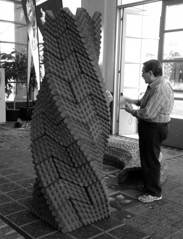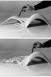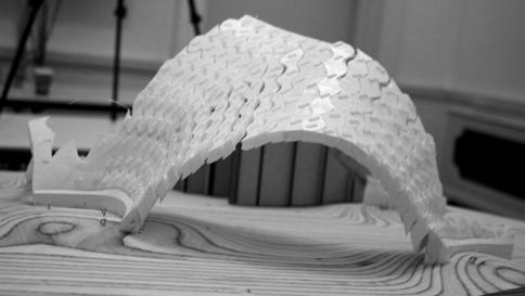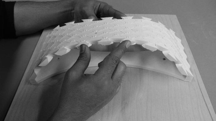 The material system was revisited to investigate the possibility of creating habitable structures. A simple arch was built physically using the interlocking bricks and was subjected to an oscillation table test, which established that the boundary condition of any structure created by these bricks needed to be restrained for limited movement, thus allowing the whole assembly to keep to its desired geometry. The preliminary idea of having post-tensioning was established at this stage. However, it should be noted that the physical tests carried out utilized masking tape across the model [Ref. Fig. 6.10], which cannot be necessarily be termed as post-tensioning. That approach created, in effect, a beam element across the arch, which was not factored in while proceeding from the results of the experiment. Although utmost care and focus were given to understand and implement the engineering principles, the limited scope of knowledge in the field was definitely a concern, if not a hurdle. Consultations with tutors with engineering backgrounds helped to keep the project on the right path when having to deal with structural analyses.