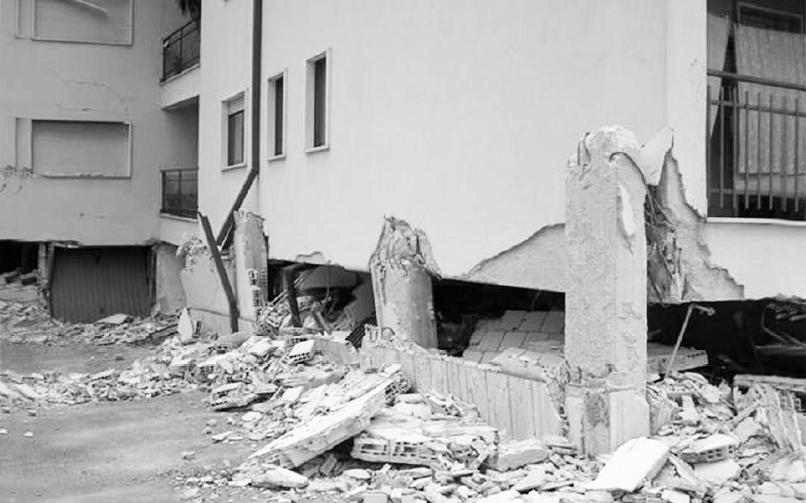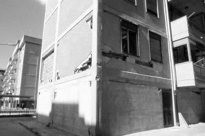 of cladding elements. If a traditional RC residential construction is considered, bricks or hollowed bricks act as cladding in between the structural frame. Having defined the higher level of elasticity of reinforced concrete technology, when strains occur, the cladding will not be able to deform in the same way the rest of the building does. This behaviour would make the wall to fail, usually in the classical “X” pattern (due to the transmission of stresses) and ultimately completely or partially detach from its place, creating great hazard for people leaving the building [Ref. Fig. 1.8]