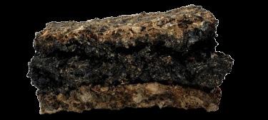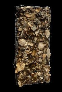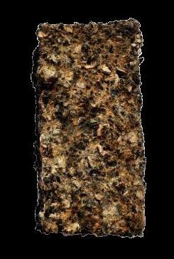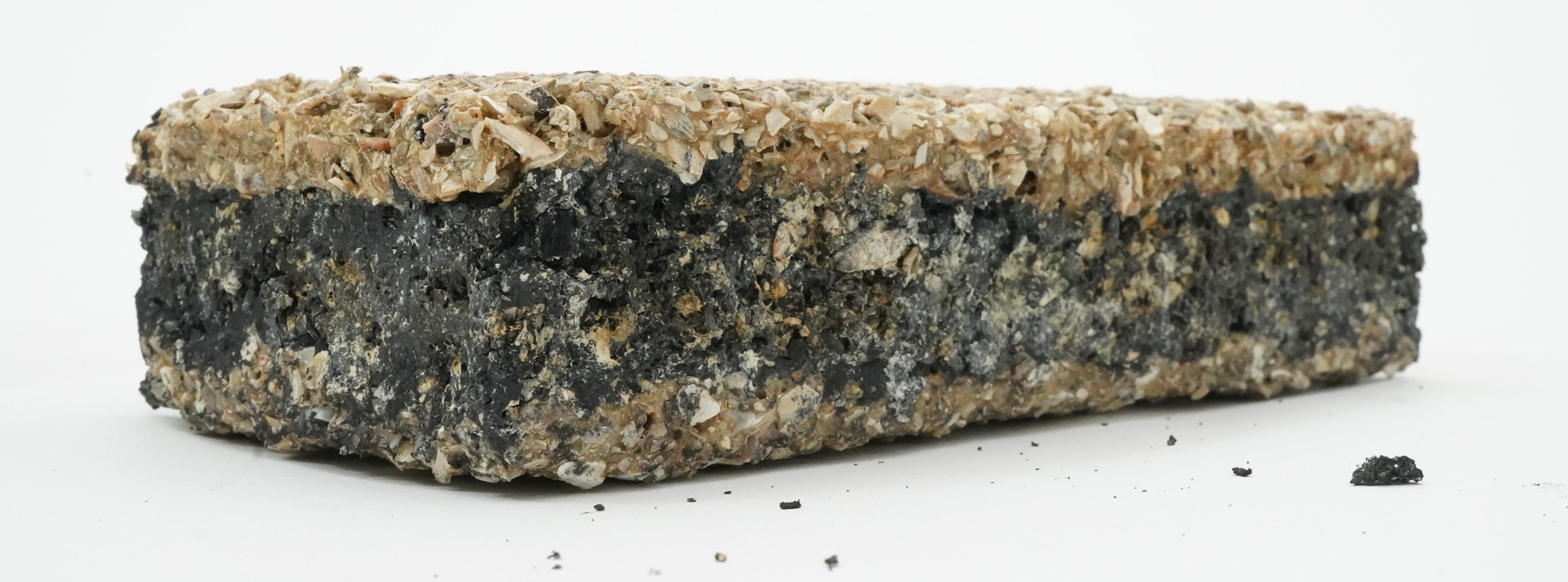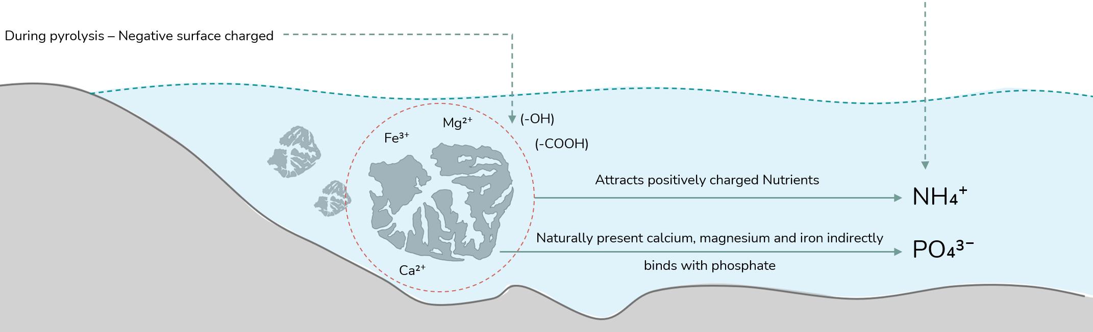 Yet seaweed alone is insufficient. To strengthen both ecological performance and mechanical stability, biochar is introduced as a complementary component. Produced through pyrolysis, biochar’s negatively charged carbon matrix attracts ammonium (NH₄+) and binds phosphate (PO₄³-) via naturally present minerals such as calcium and magnesium. Studies confirm adsorption rates of approximately 3.5 mg of ammonium and 2.0 mg of phosphate per gram, while also buffering pH in aquatic environments.4 5 Structurally, its microporous granules distribute stresses, increasing the integrity of composite panels.6 Biochar thus functions both as a nutrient filter and as a stabilizing matrix.
