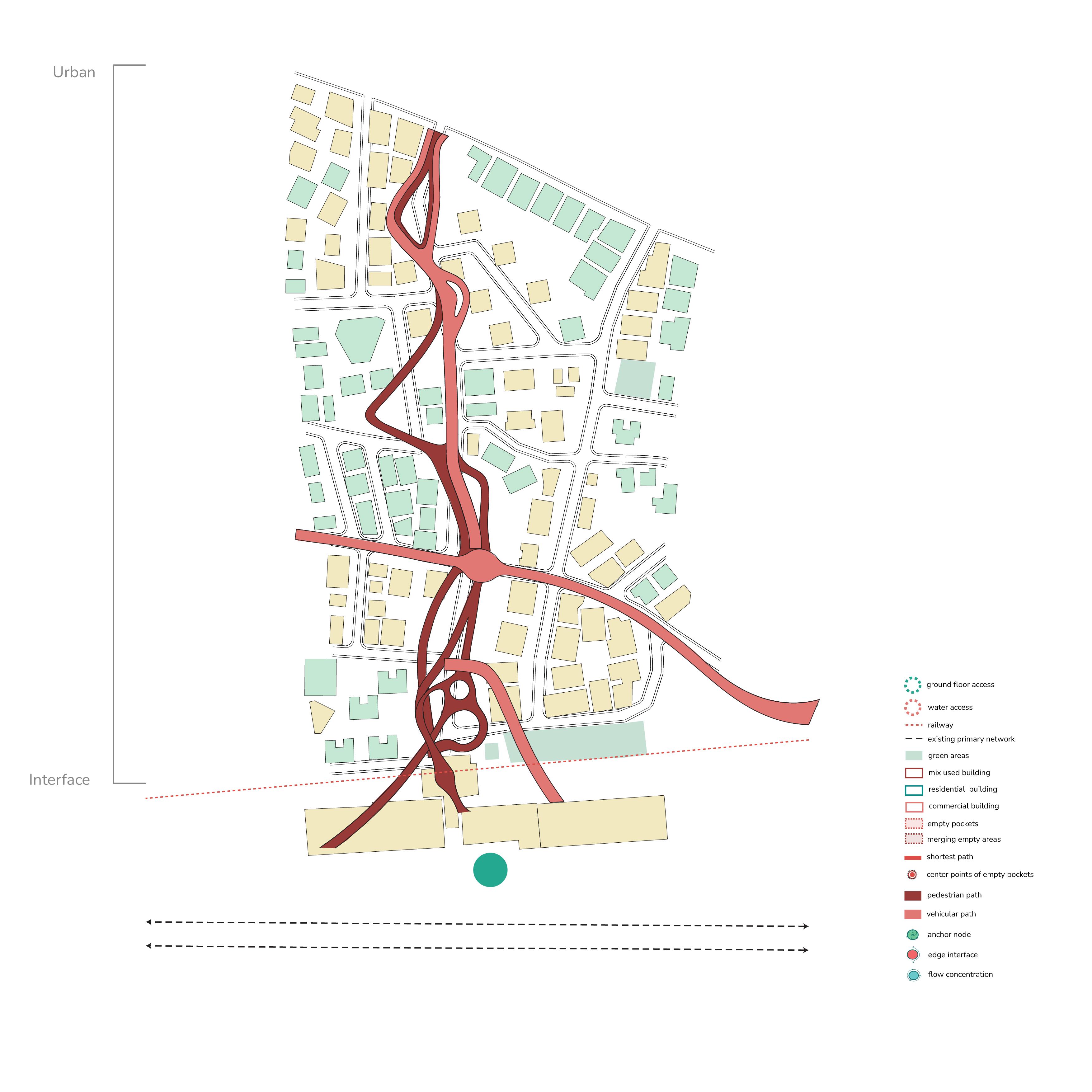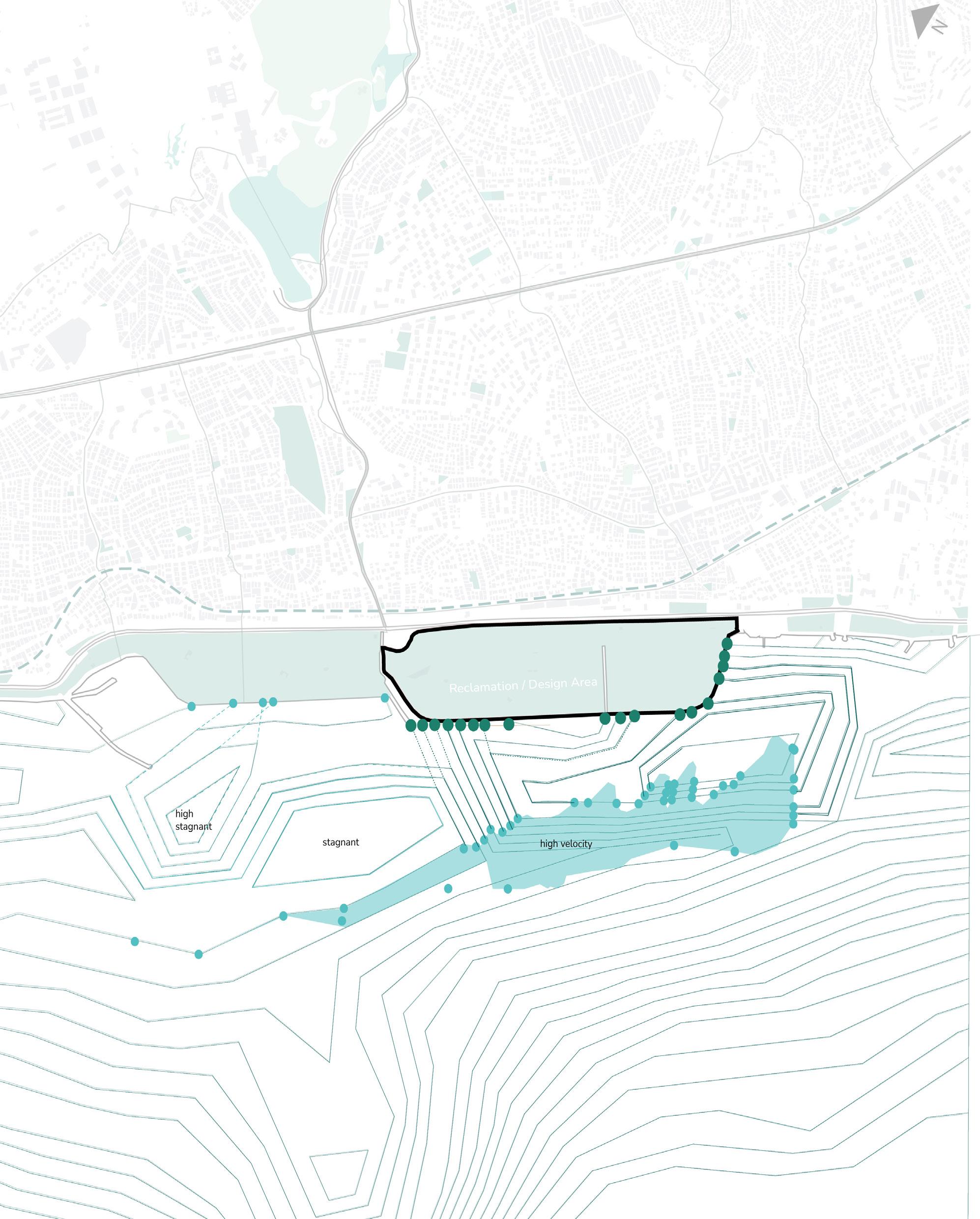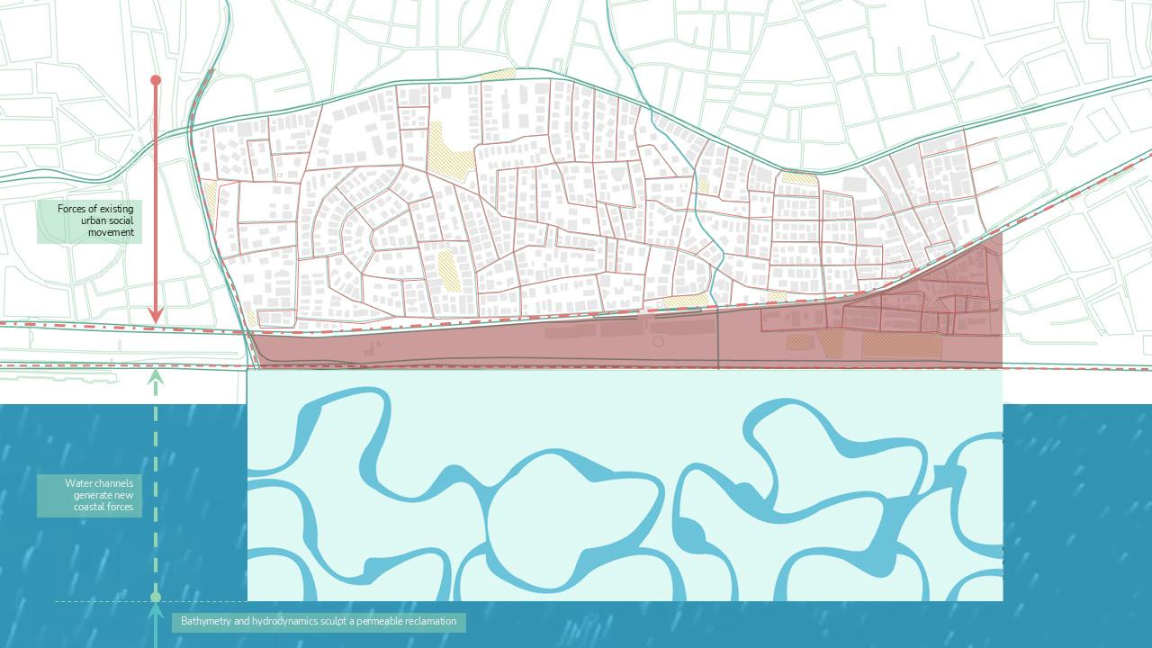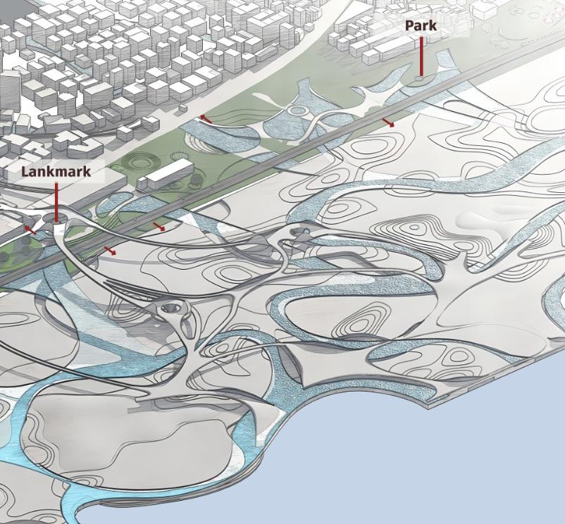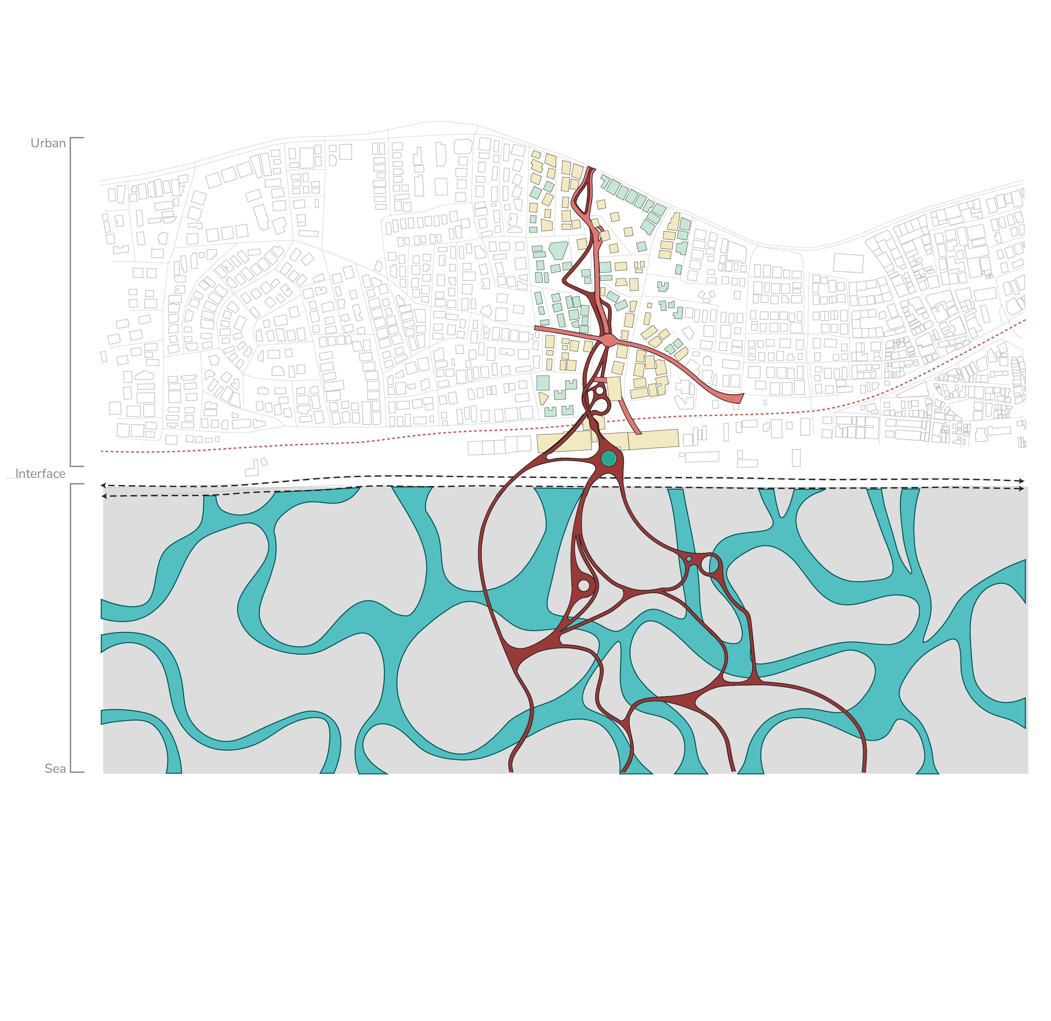 The design proposal focuses on the interface boundary as a critical zone for reconnecting the city with its coastal edge. Historically a vibrant threshold, this area has lost its identity due to heavy infrastructural development. The proposal aims to restore its significance by integrating existing functions, improving groundlevel connectivity, and reintroducing water as a central organising element. This layer targets the base hydrological network, uncovering and extending it toward the interface to rebuild the city’s historic shoreline relationship. Infrastructure is not removed but reconfigured as part of a larger, layered spatial system.