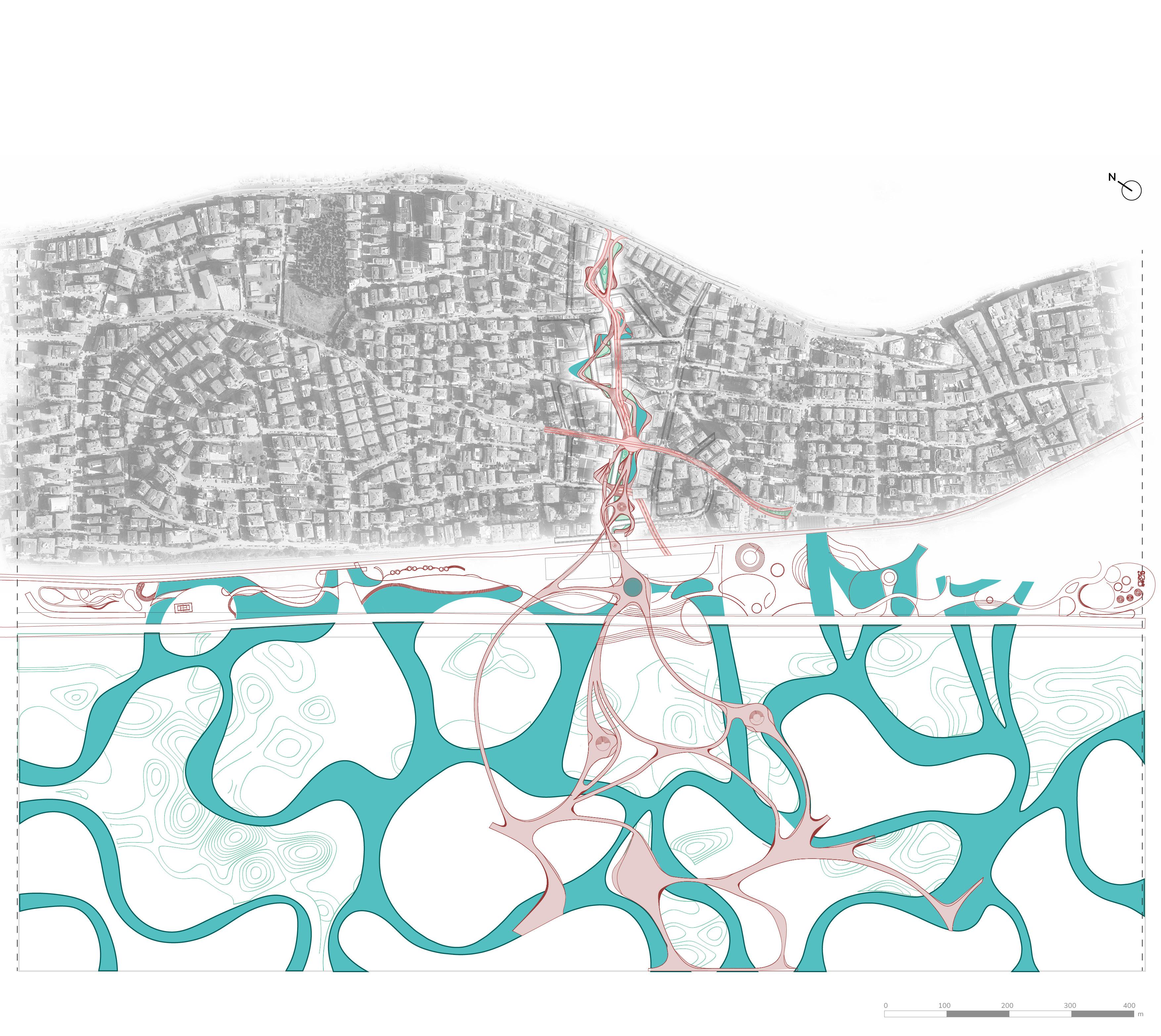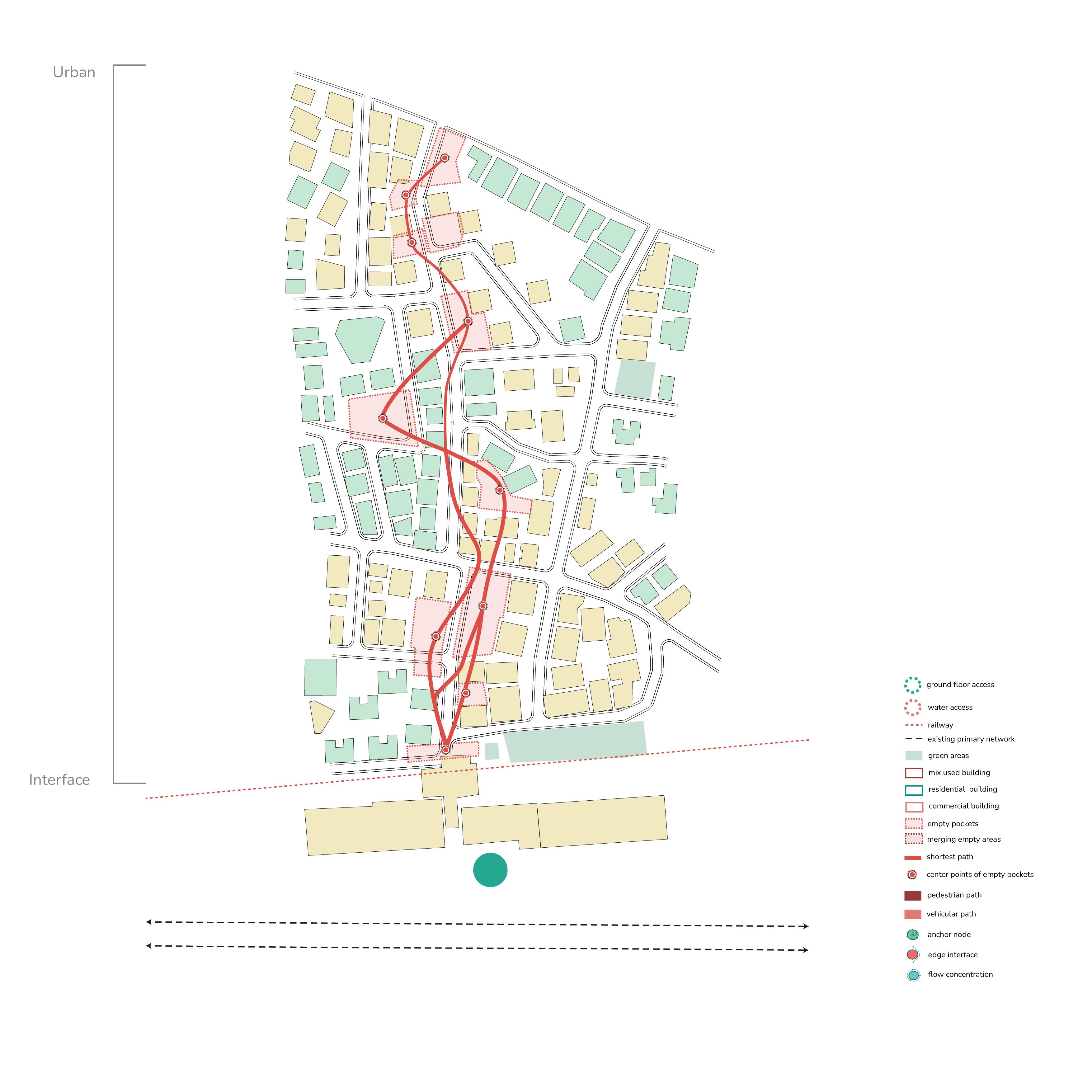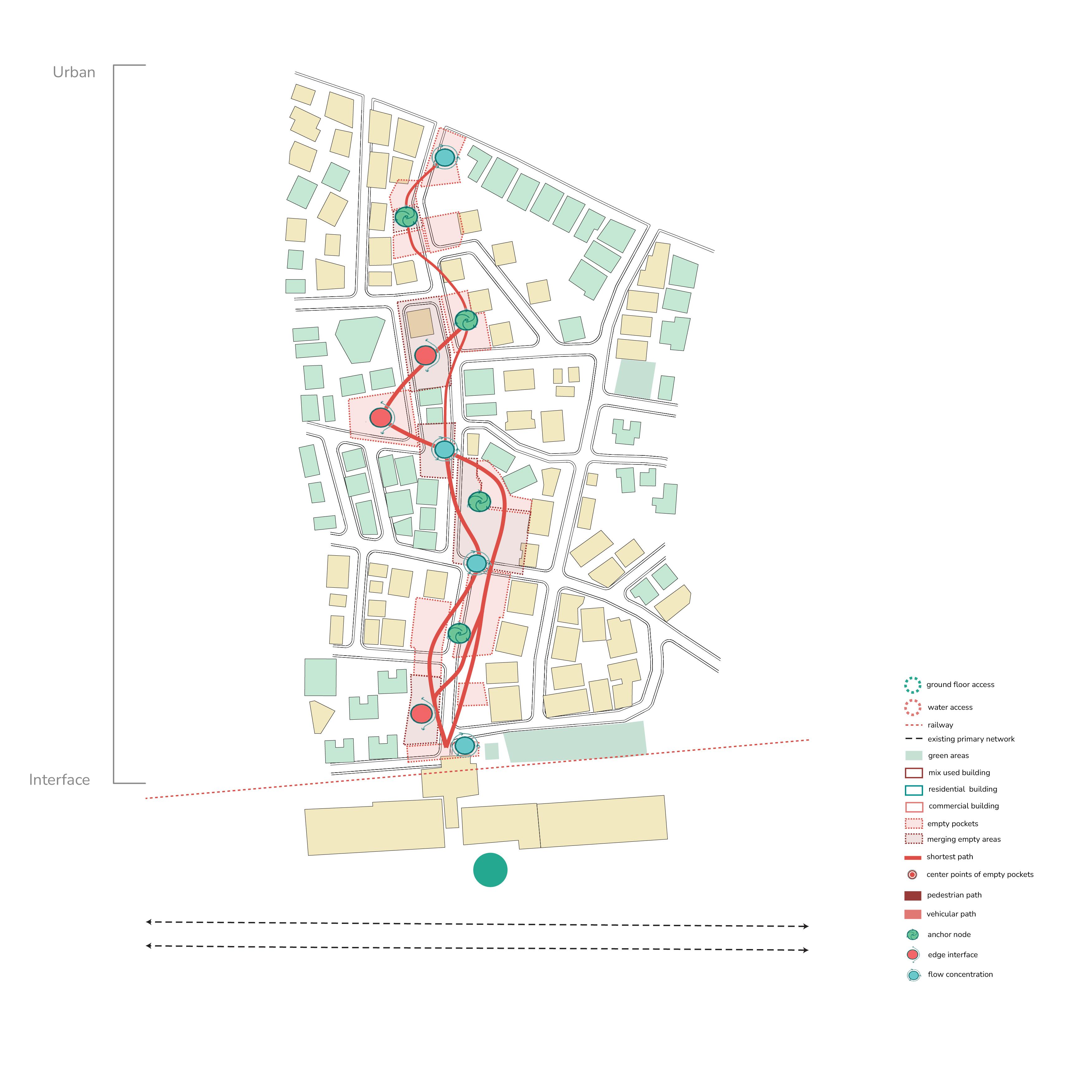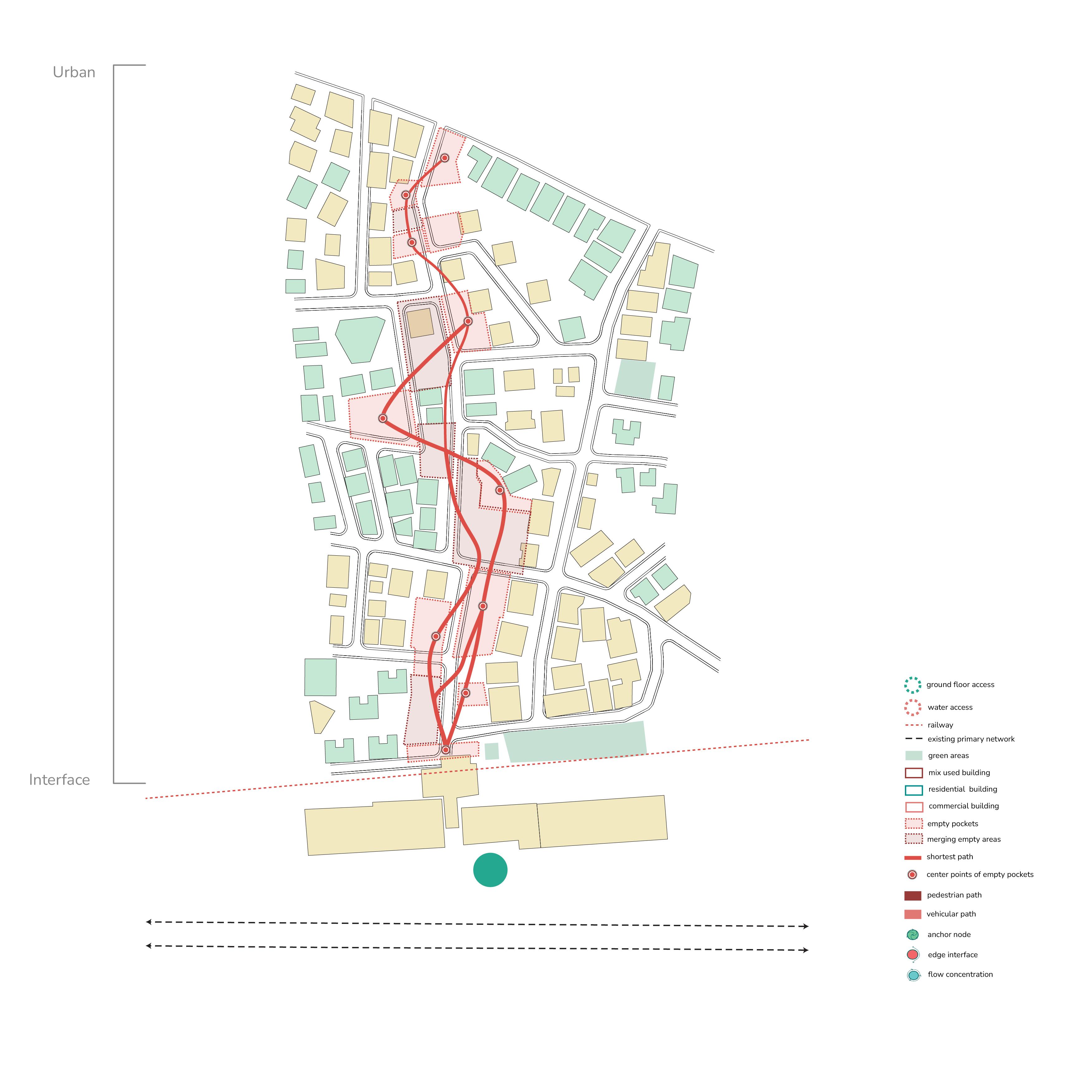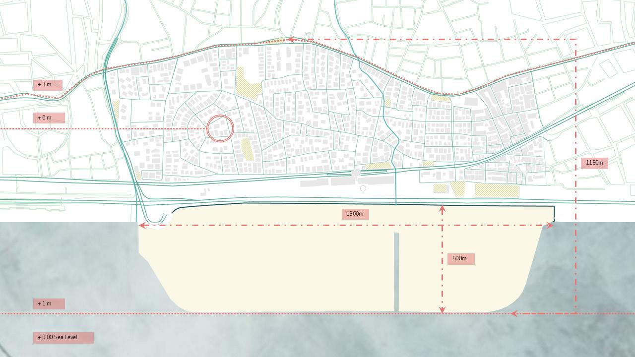 The design proposal focuses on the interface boundary as a critical zone for reconnecting the city with its coastal edge. Historically a vibrant threshold, this area has lost its identity due to heavy infrastructural development. The proposal aims to restore its significance by integrating existing functions, improving groundlevel connectivity, and reintroducing water as a central organising element. This layer targets the base hydrological network, uncovering and extending it toward the interface to rebuild the city’s historic shoreline relationship. Infrastructure is not removed but reconfigured as part of a larger, layered spatial system.