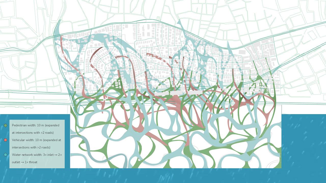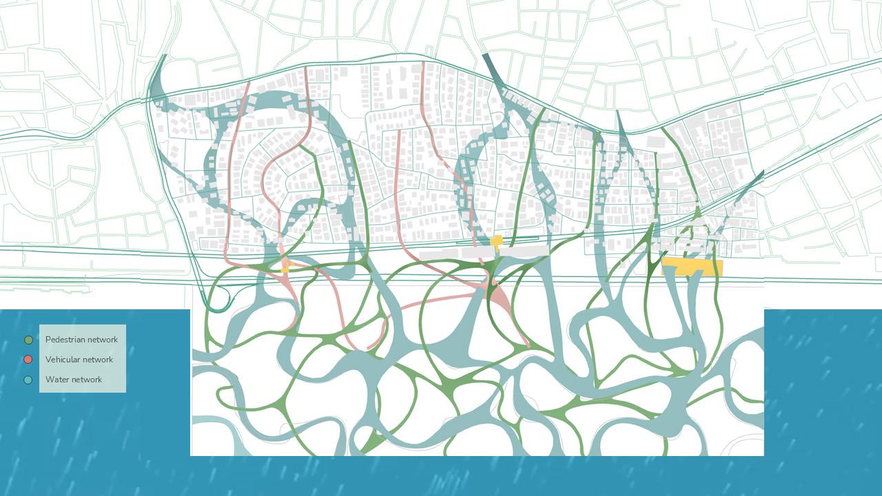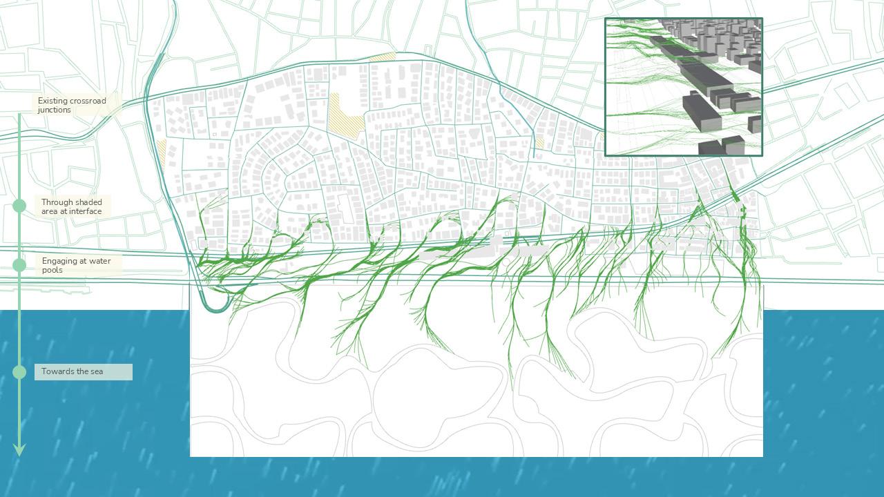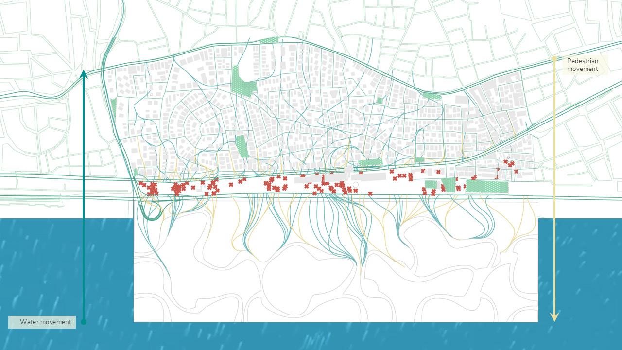 From this, an integrated network emerges where water, pedestrian and mobility systems are collectively designed to restore permeability, soften infrastructural barriers and enable people to reconnect with the coast while re-establishing ecological flows within the city. These networks do not function merely as connectors but actively respond to their surrounding environment and engage with existing functions within the urban fabric. As water re-enters the city and people move towards the coast, their converging movements weave through urban voids and heat-affected areas, forming a unified system where environmental processes and public life shape a continuous sequence of spatial spaces.